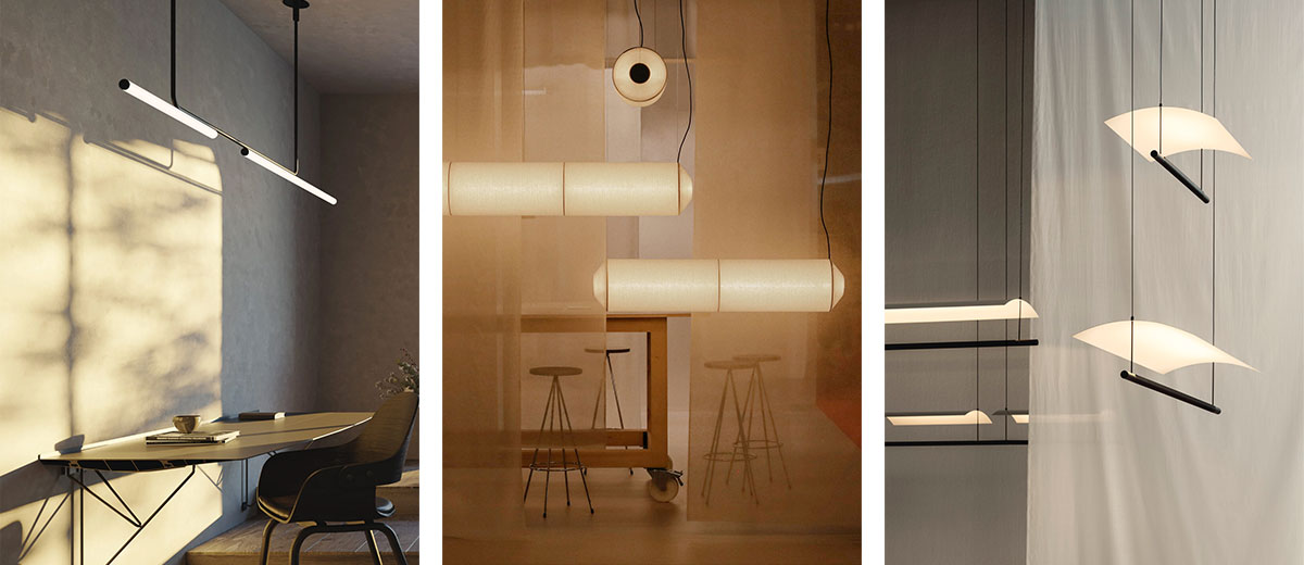 The pendants we want to show you are from the Barcelona-based brand Santa & Cole. Designed by the British designer Anthony Dickens, the Tèkio Horizontal pendant (Tèkio means ‘adaptation’ in Japanese) combines a handmade paper shader which takes elements from ancient artisanal techniques with modern Warm to Dim LED technology. Available in several lengths (from 67 to a sprawling 226 cm), as well as in a tasteful vertical version, the Tèkio is a testament to ideals of dignified simplicity in design. Antoni Arola’s Lámina 85 is another pendant which combines a handful of well-chosen elements and clean shapes with impressively eloquent results. The Lámina consists of a thin line of horizontal light with a thin curved metal sheet hovering above it and serving as a diffusor. If someone asked us for an example of a home lighting piece that displays the virtues of indirect reflected light, the Lámina would be a perfect choice.