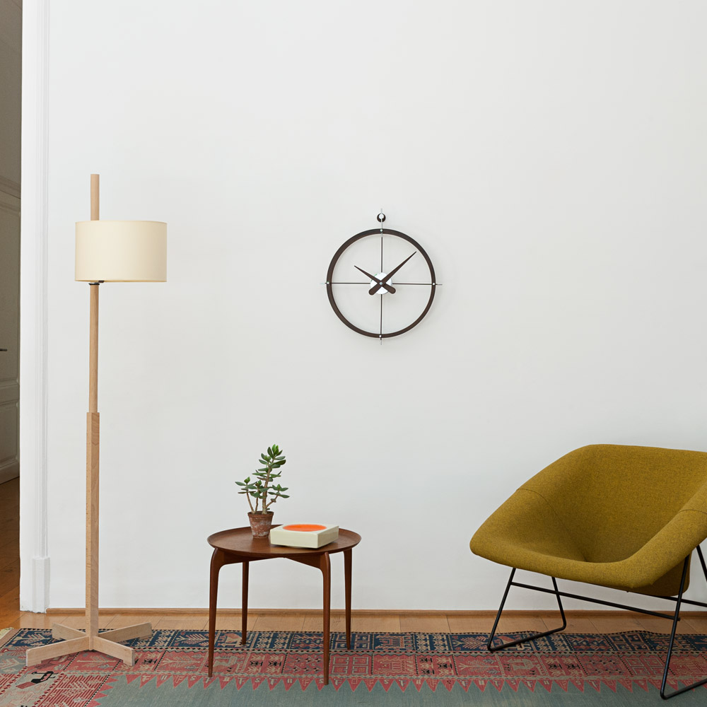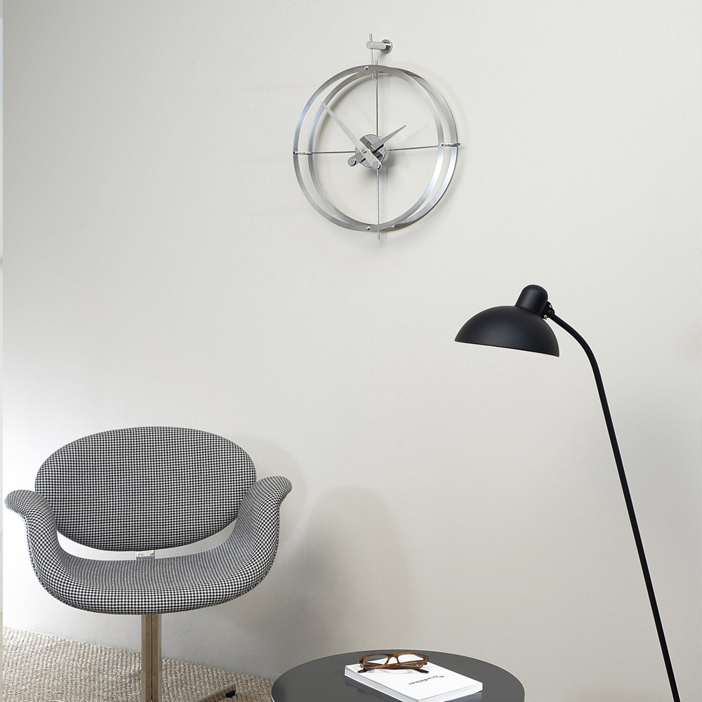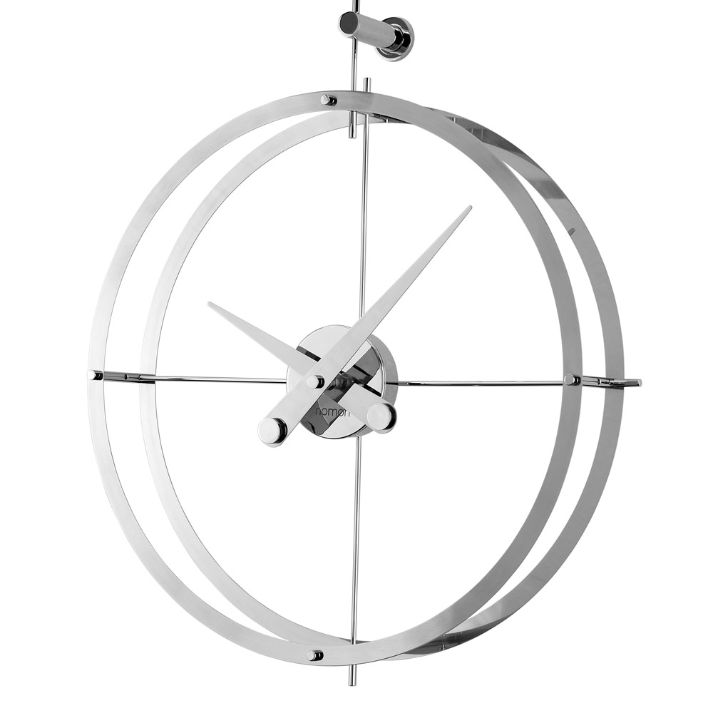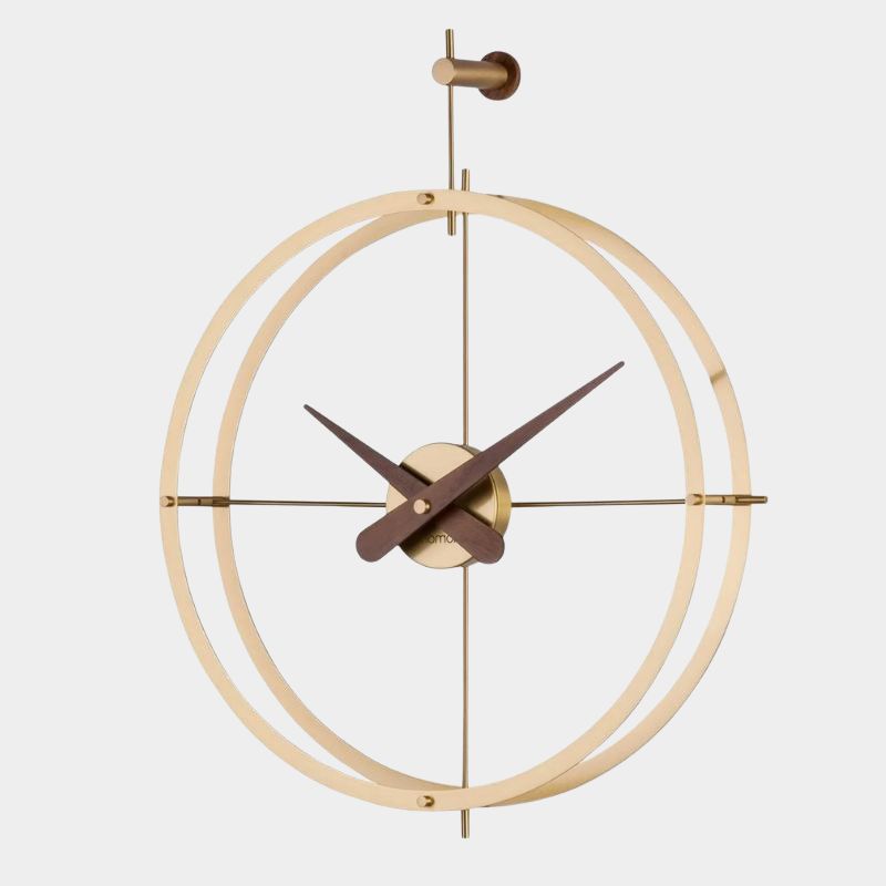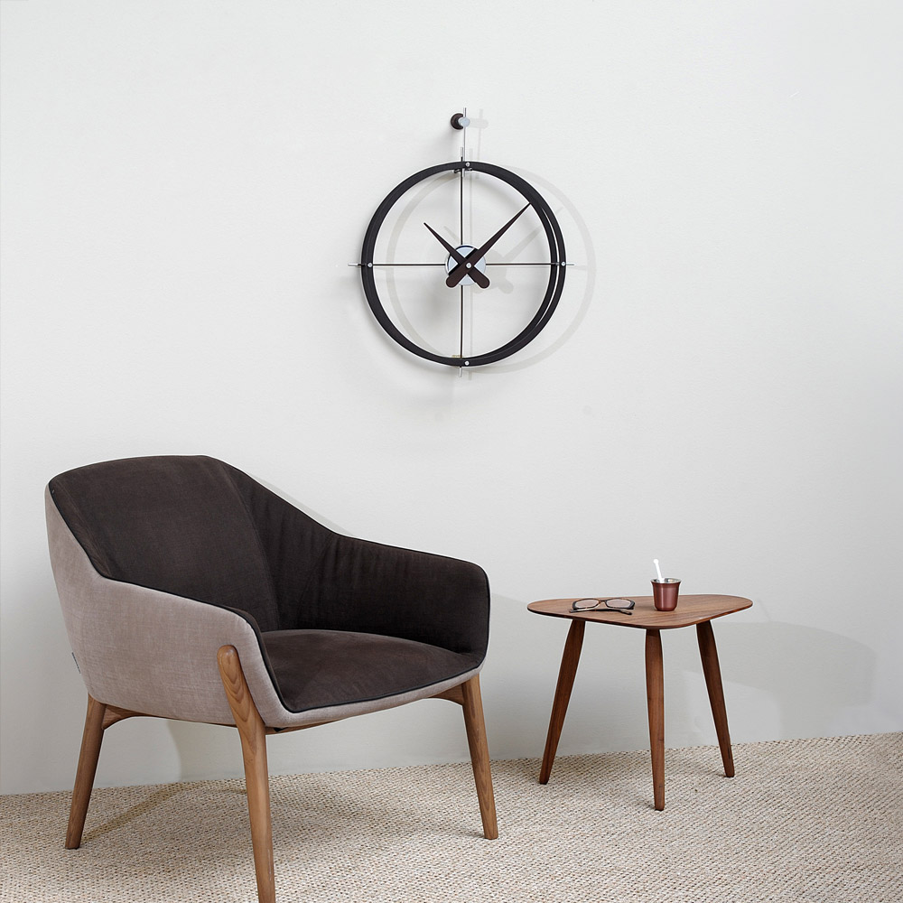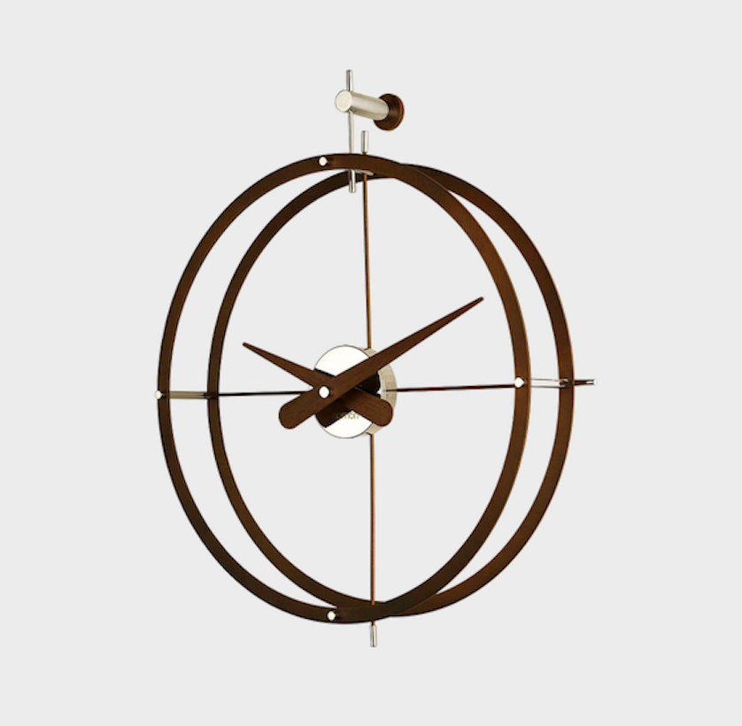 Wall clock with a double wood or steel ring structure which contains inside, the steel box and wood needles. The whole design wall clock is addembled by a cross-shaped support to the wall which is use to point out the four signal points. It is a silence and functional wall clock perfect to decorate anywhere of your home or office.