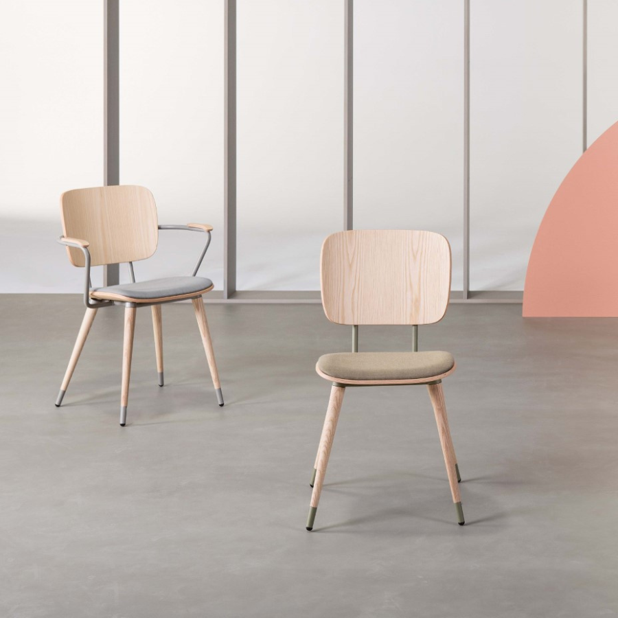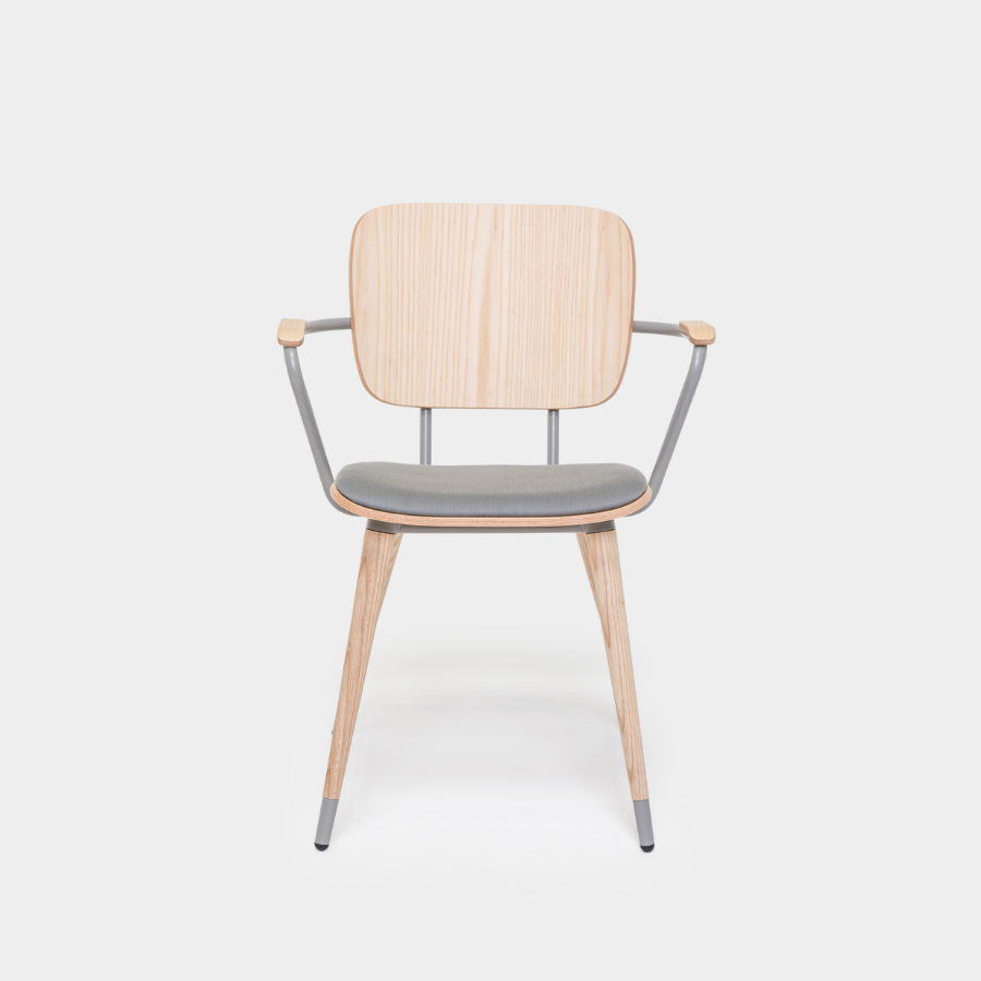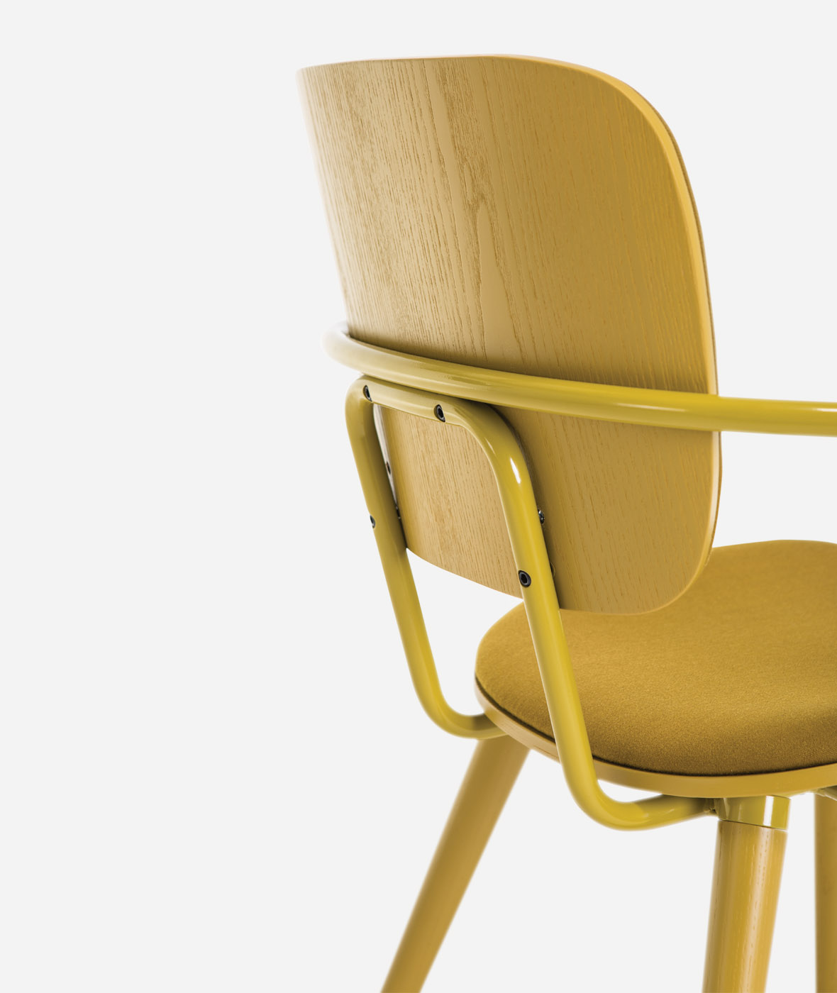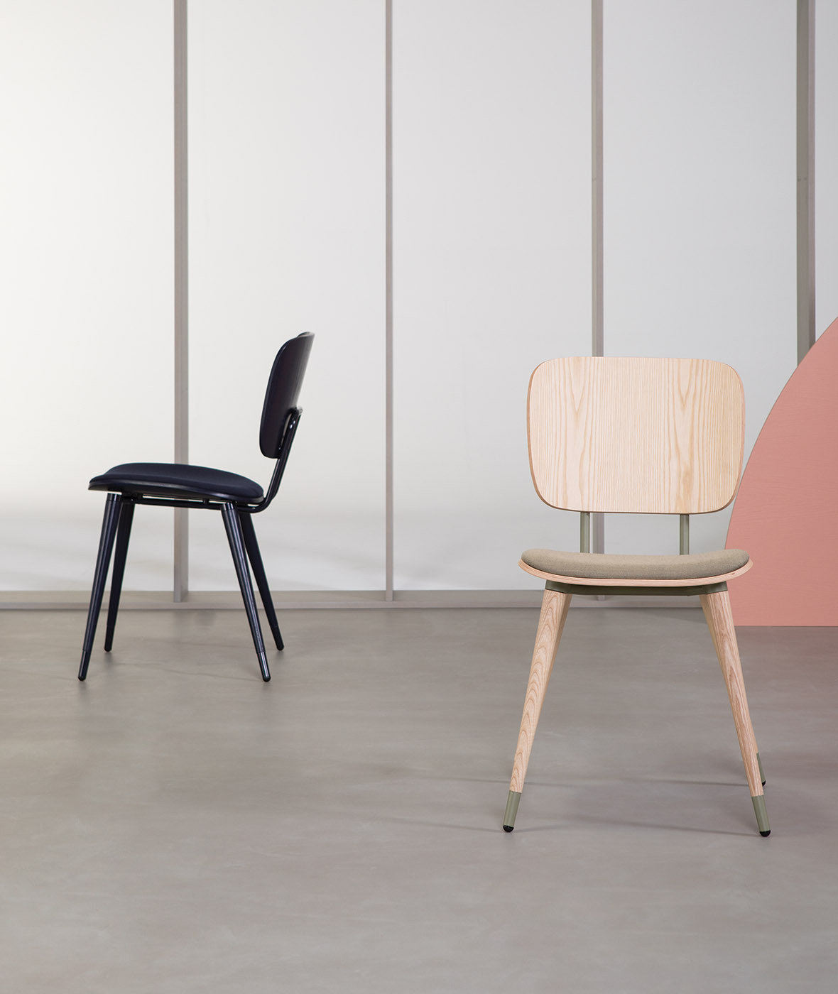 Seat and backrest in ash plywood and solid ash legs with metallic cones. Finished in natural wood or open pore varnished ash. Steel tube frame powder coated in RAL colours.