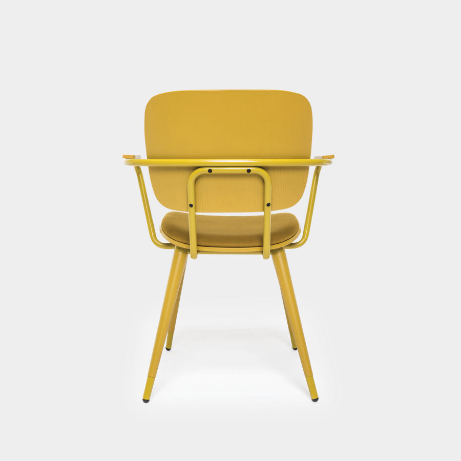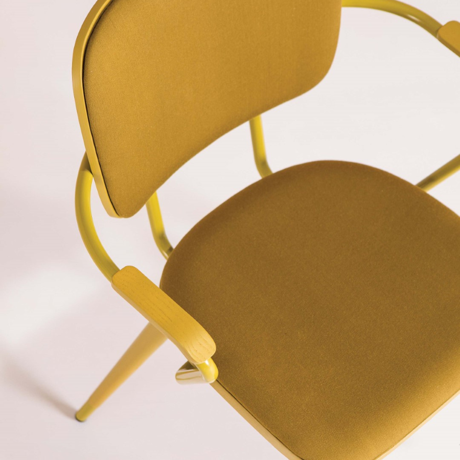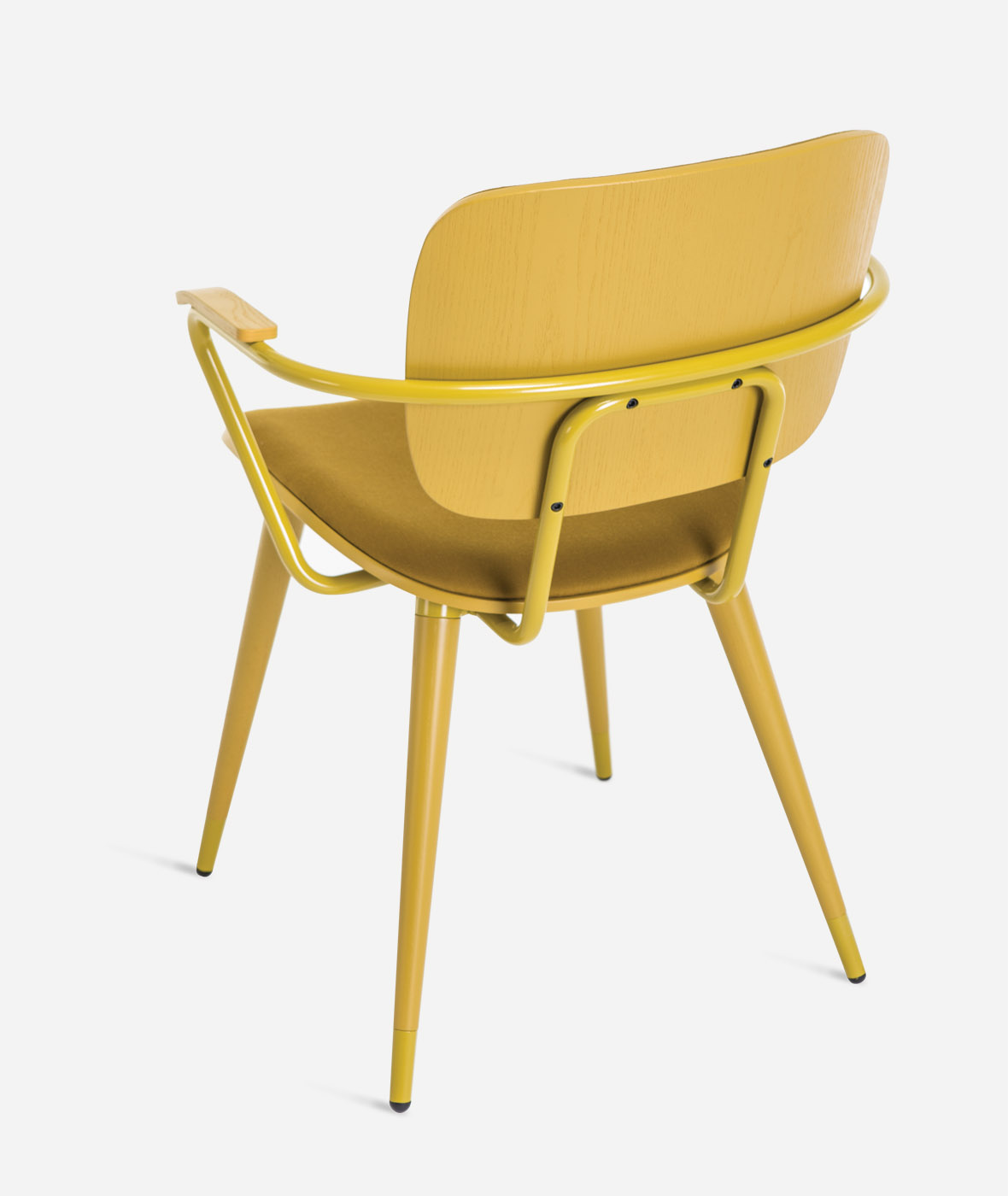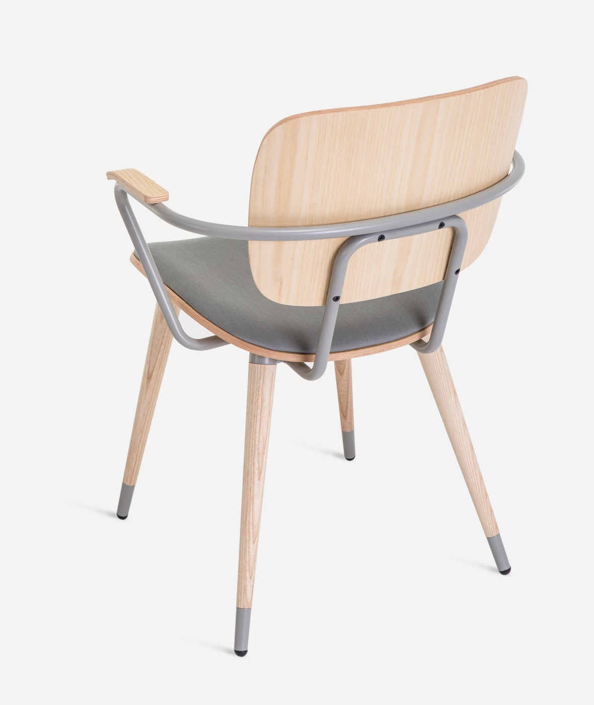 Seat and backrest in ash plywood and solid ash legs with metallic cones. Finished in natural wood or open pore varnished ash. Steel tube frame powder coated in RAL colours.