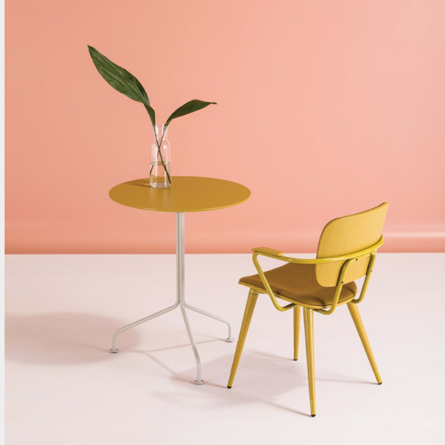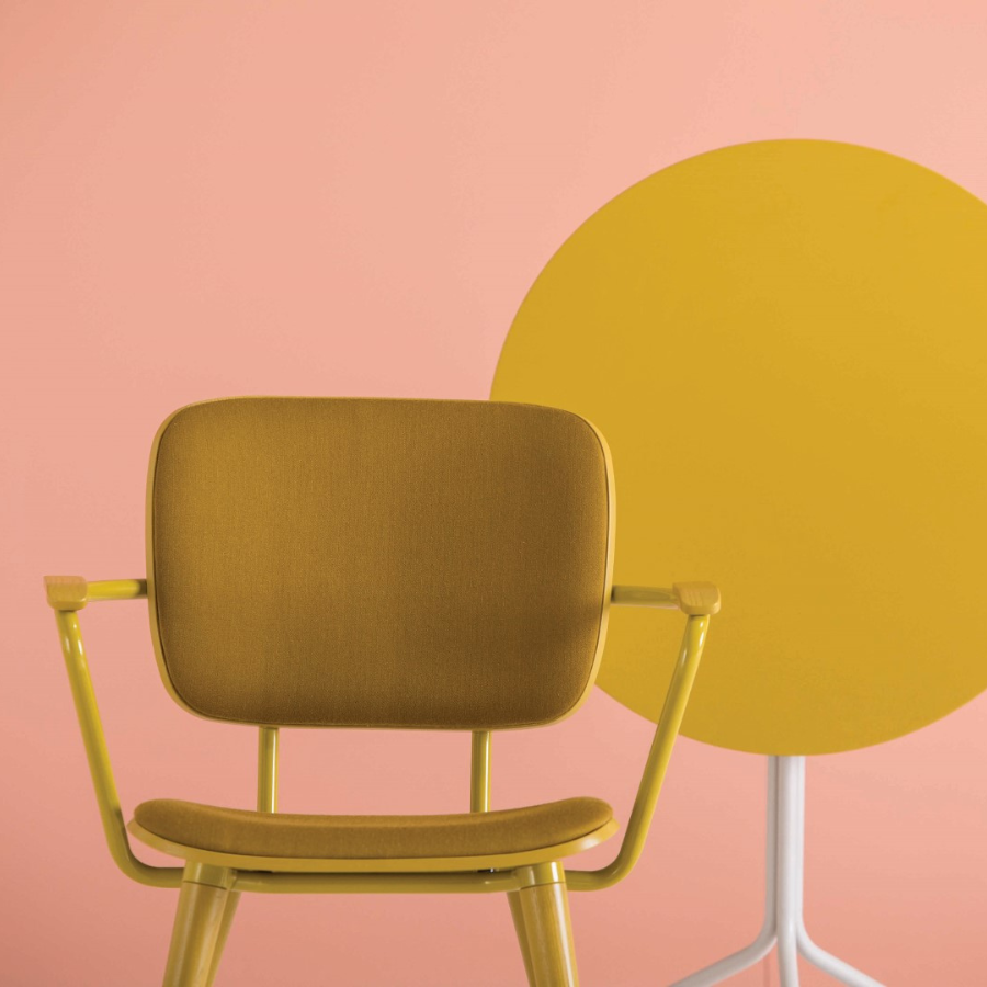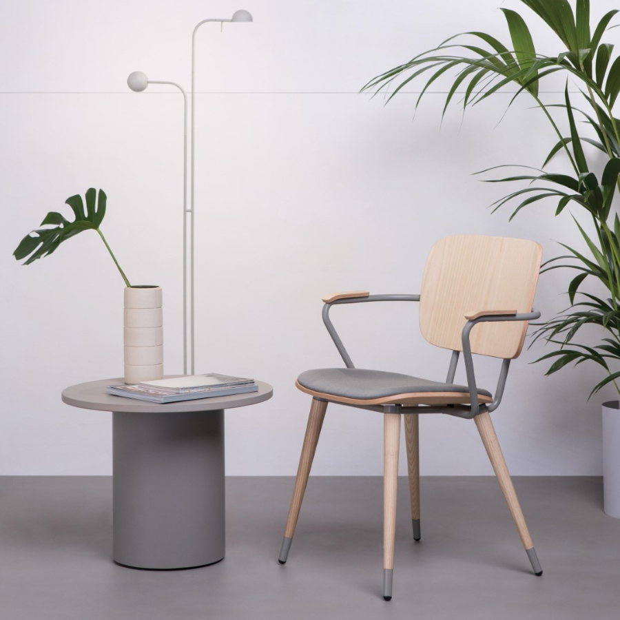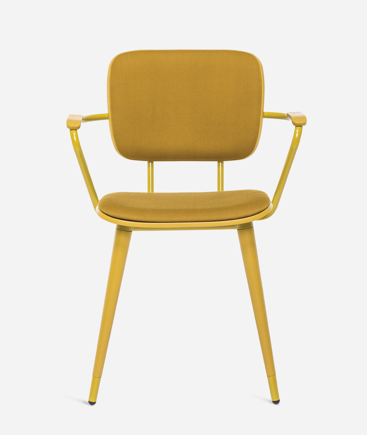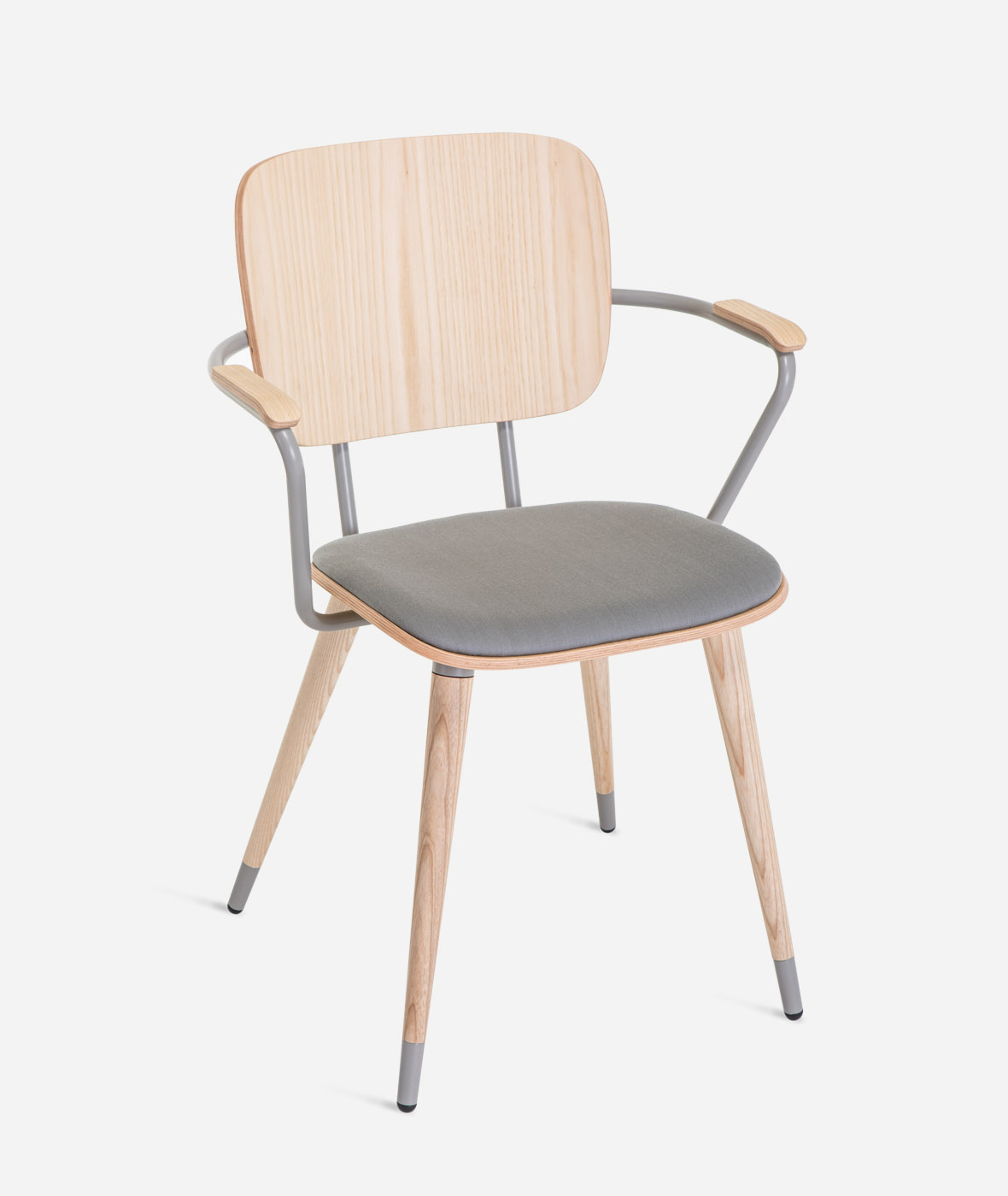 Seat and backrest in ash plywood and solid ash legs with metallic cones. Finished in natural wood or open pore varnished ash. Steel tube frame powder coated in RAL colours.
