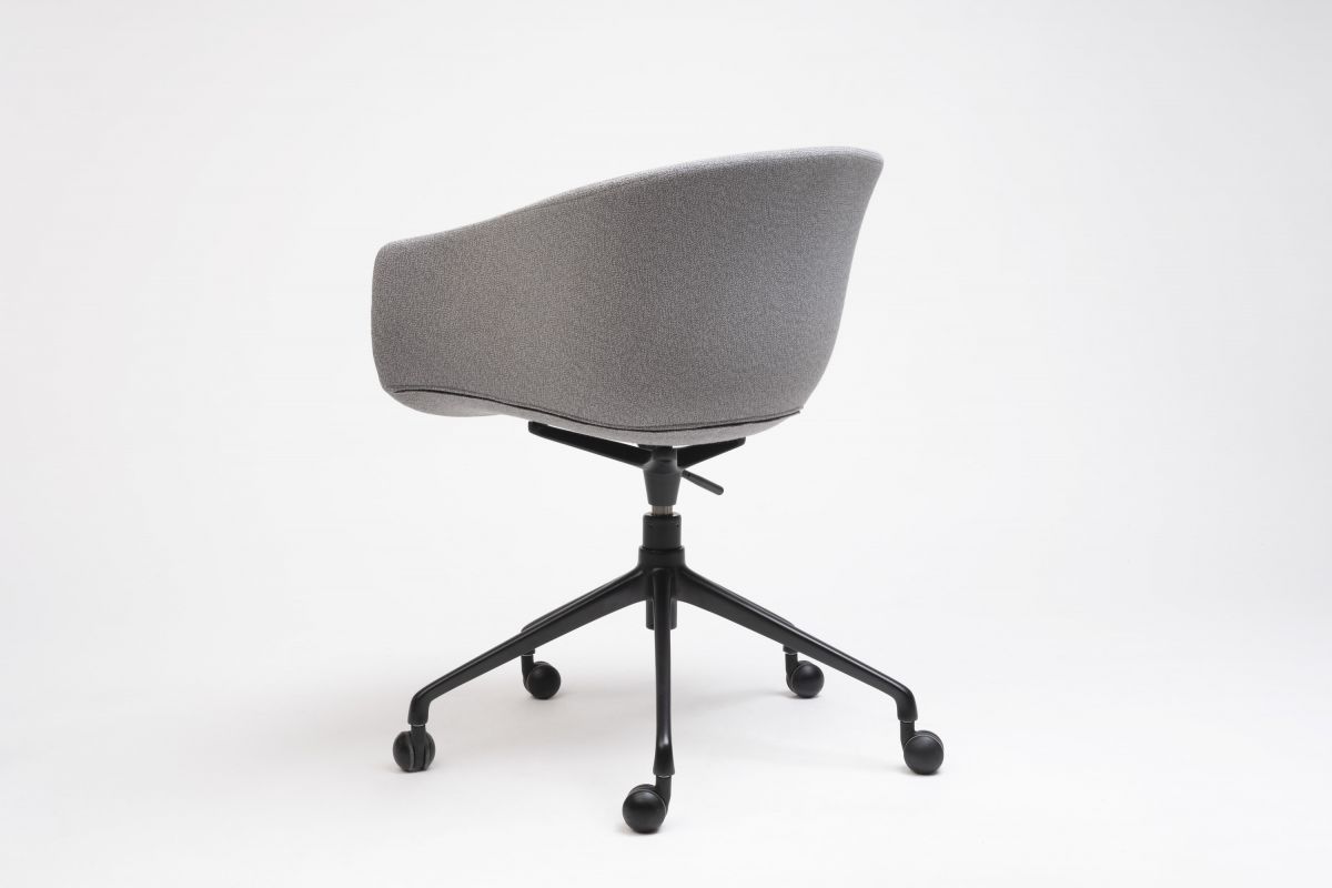 Generous proportions and wraparound lines, a versatile piece that has a noble and welcoming appearance. Its swivel leg frame holds up a soft and organic upholstered seat.
