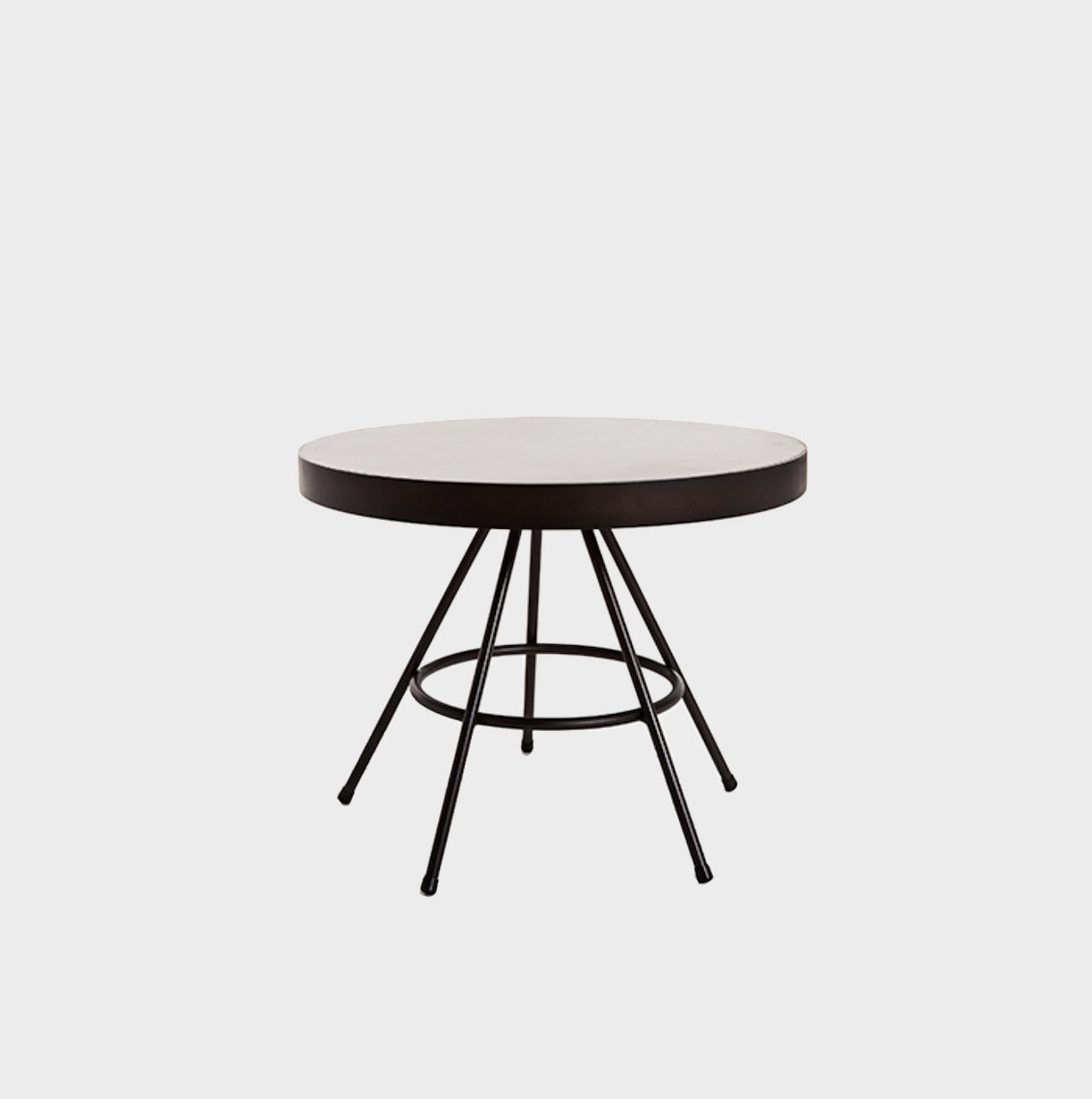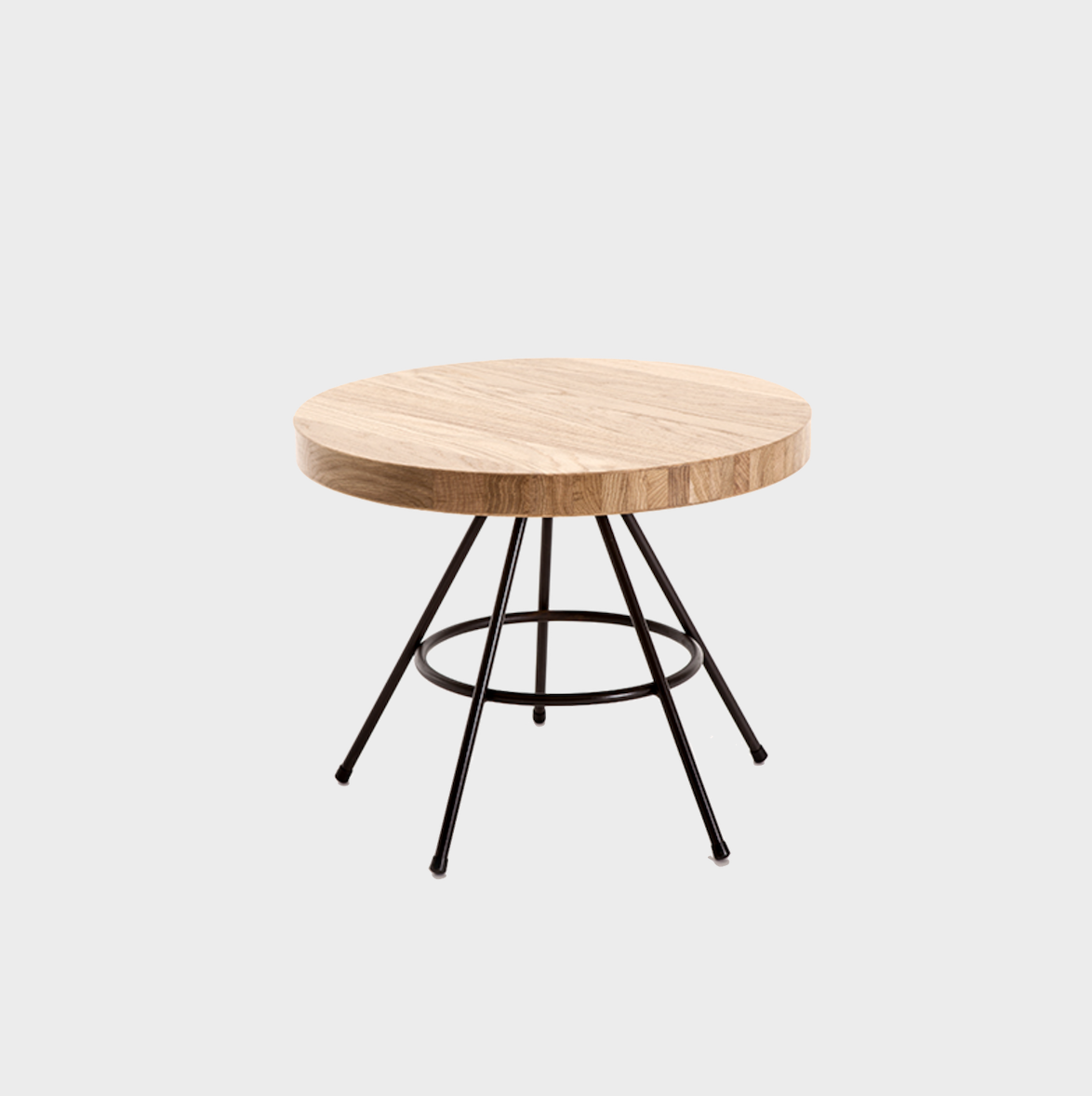 Side table with an iron rod base and table top available in oak, cast iron or brass finish.