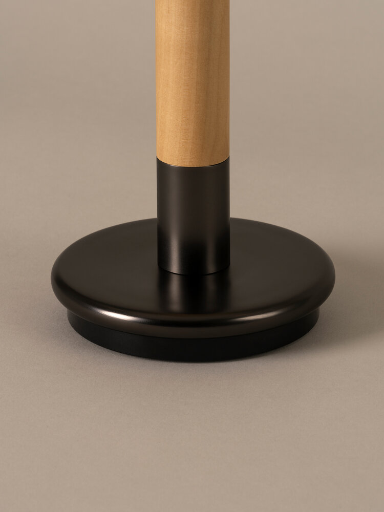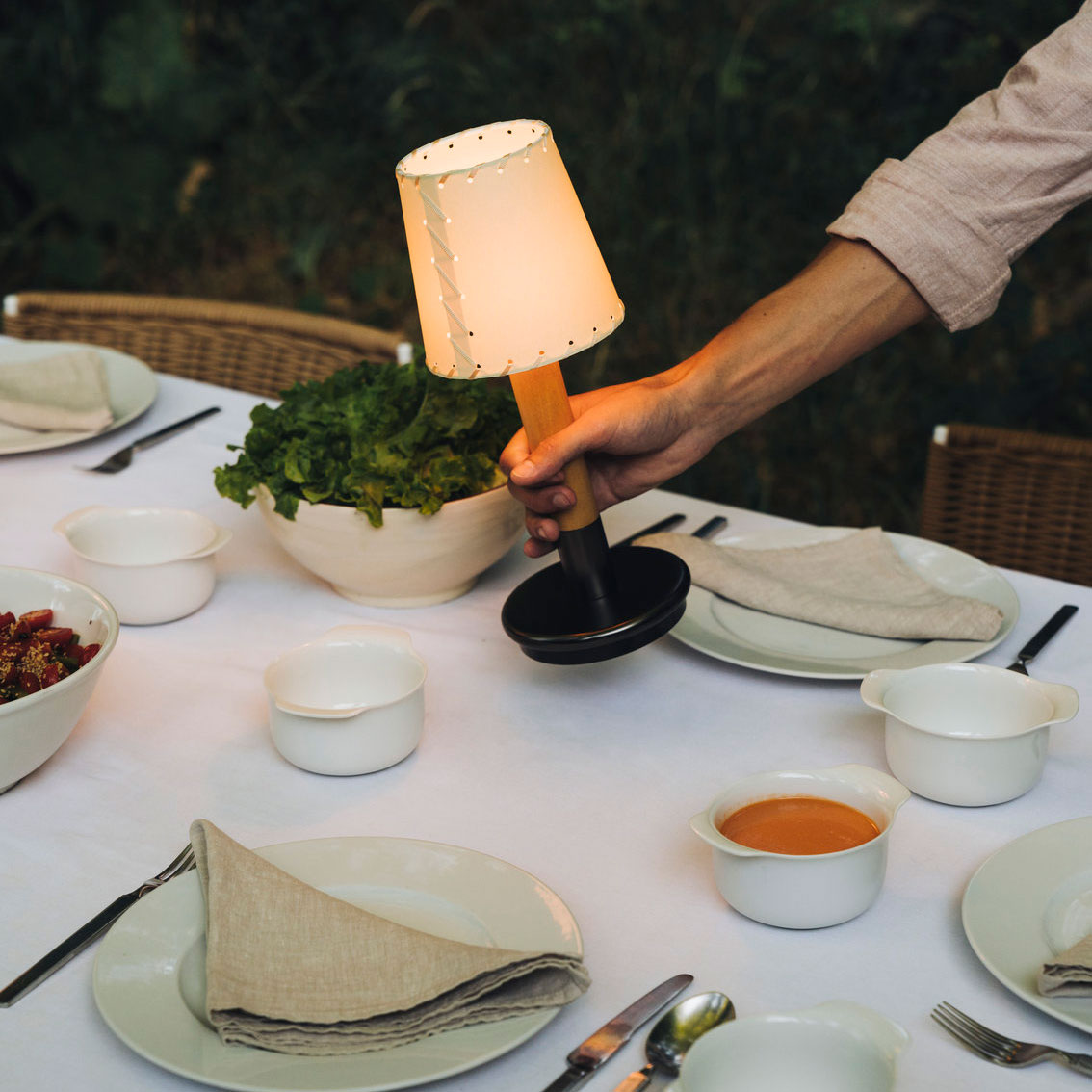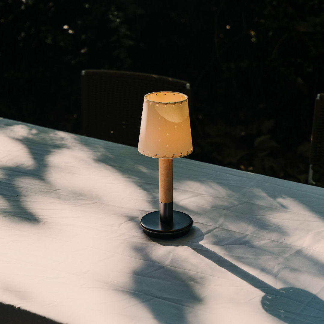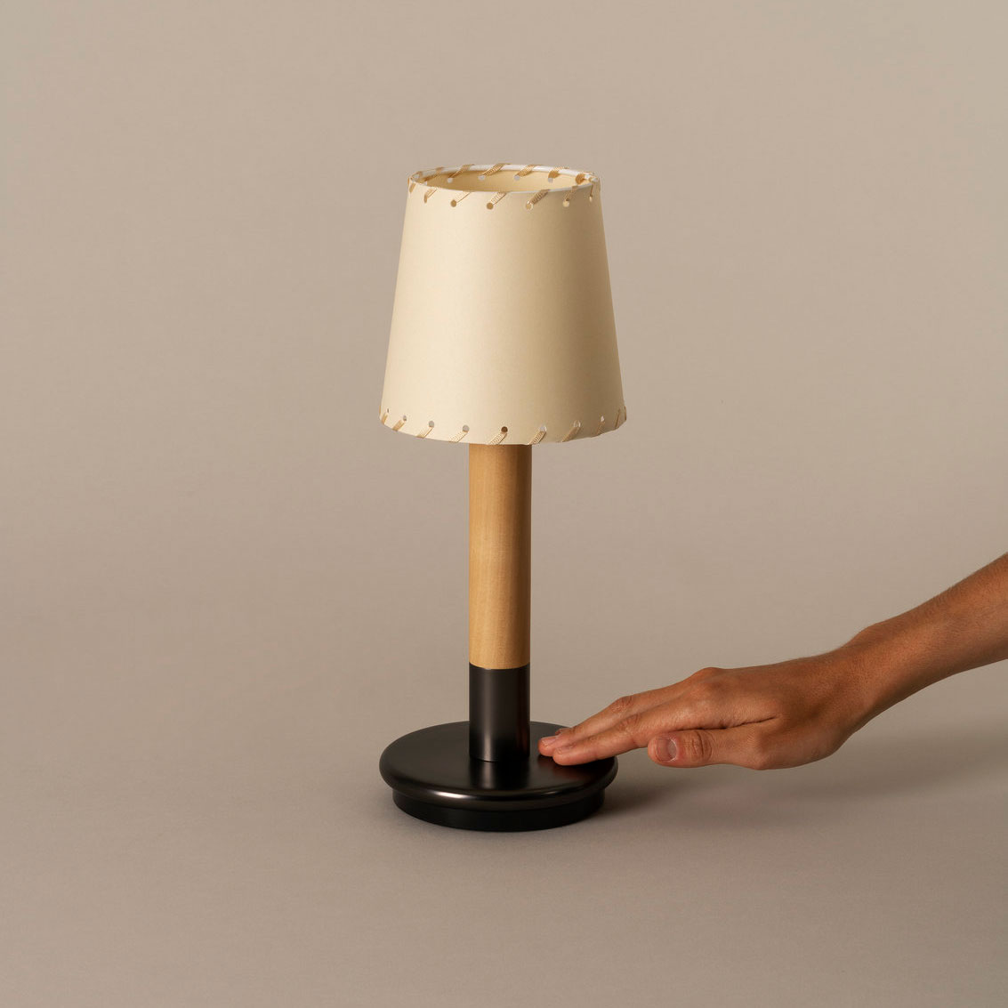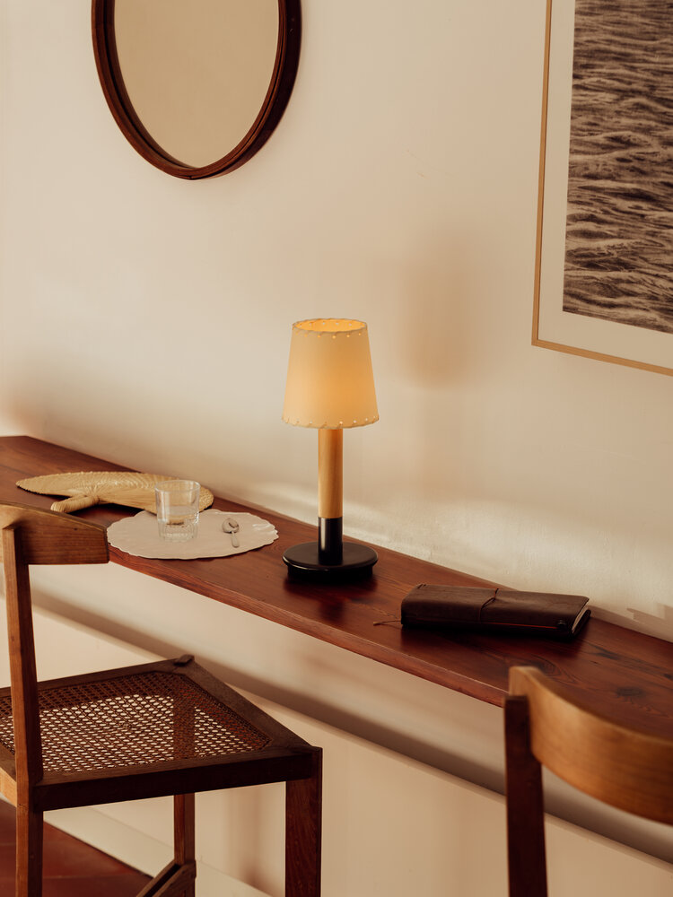 Básica Mínima Batería is the portable version of Básica Mínima. Its cylindric structure, made of birch wood, holds two lampshade options: pleated natural ribbon and beige stitched parchment. With a light touch, the lamp turns on and off, making it a light and practical companion.