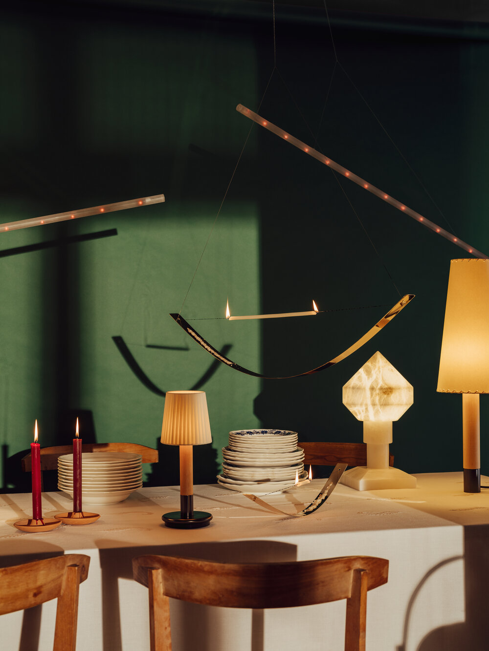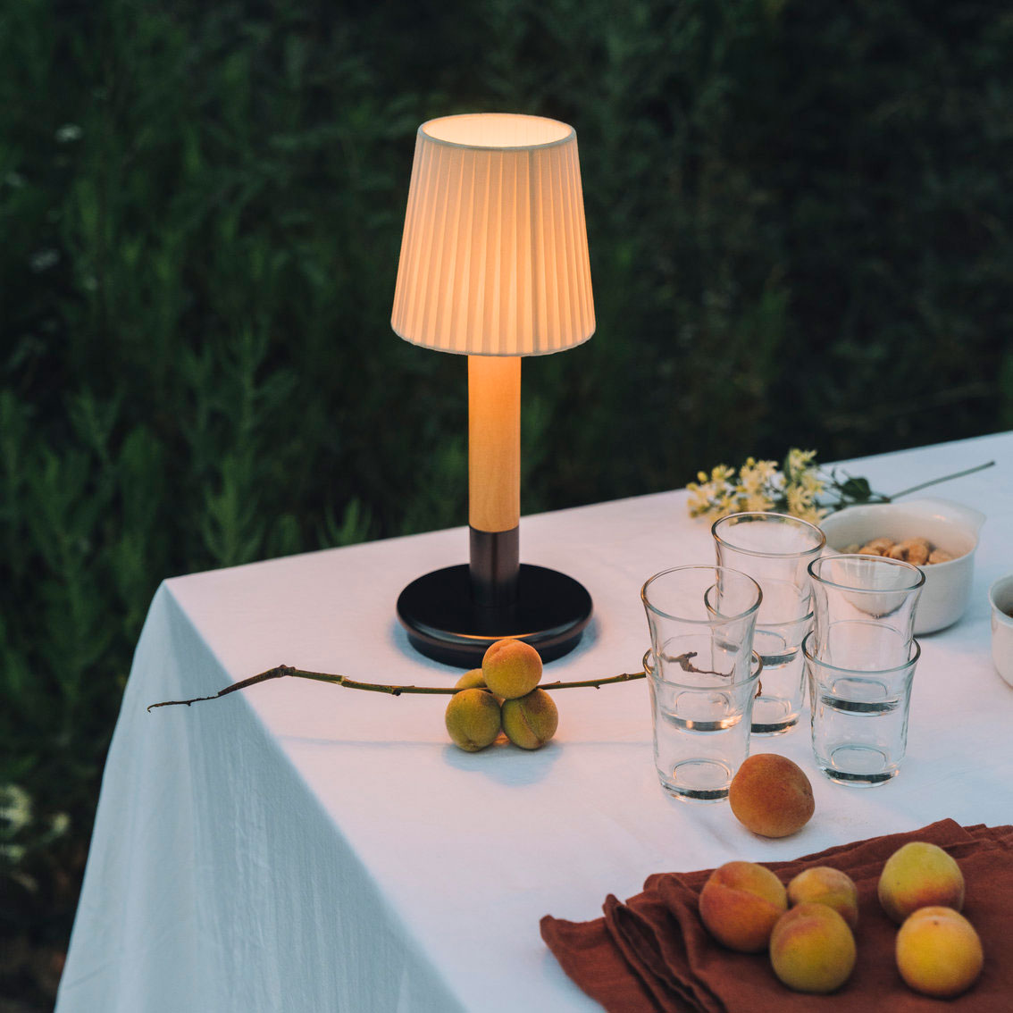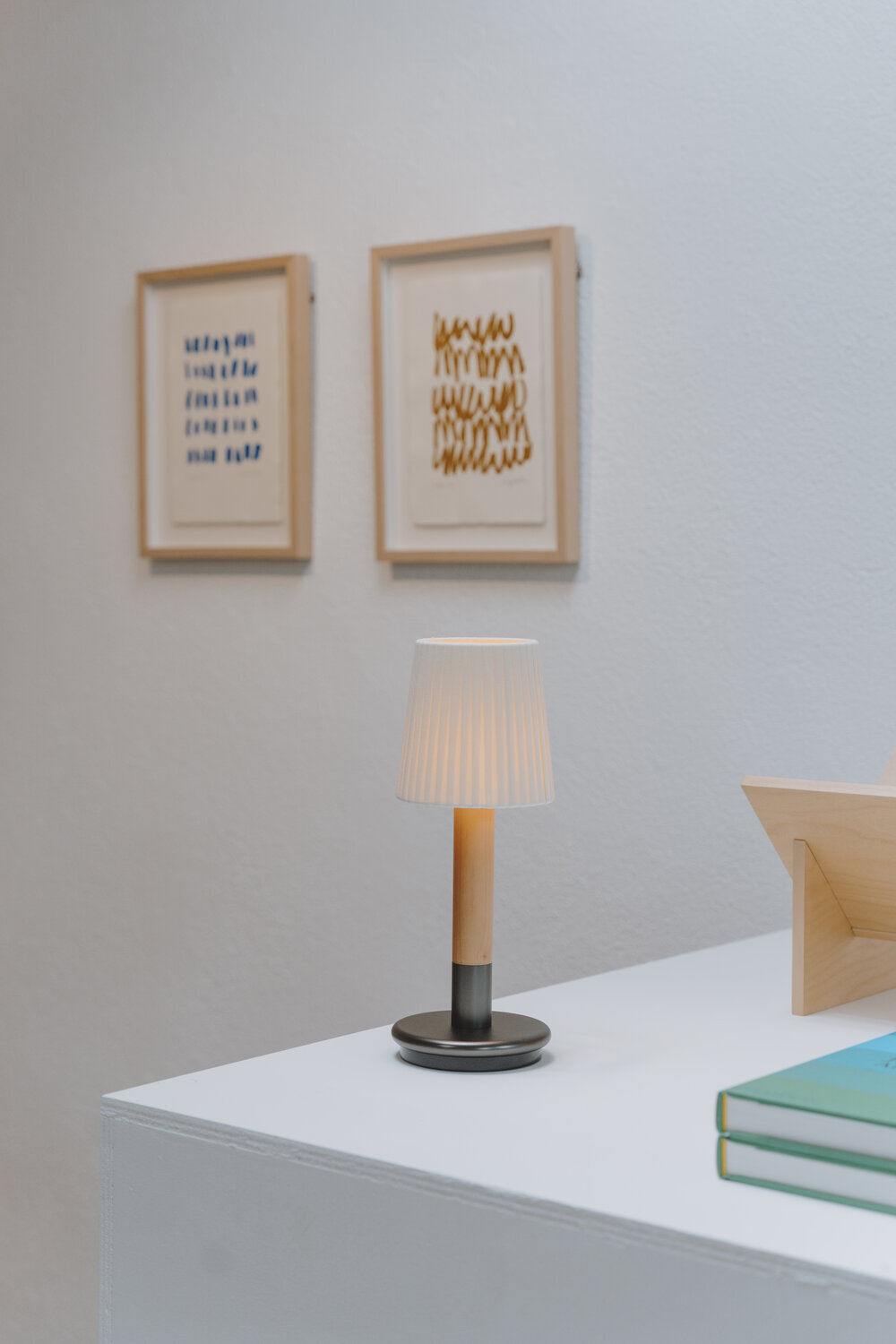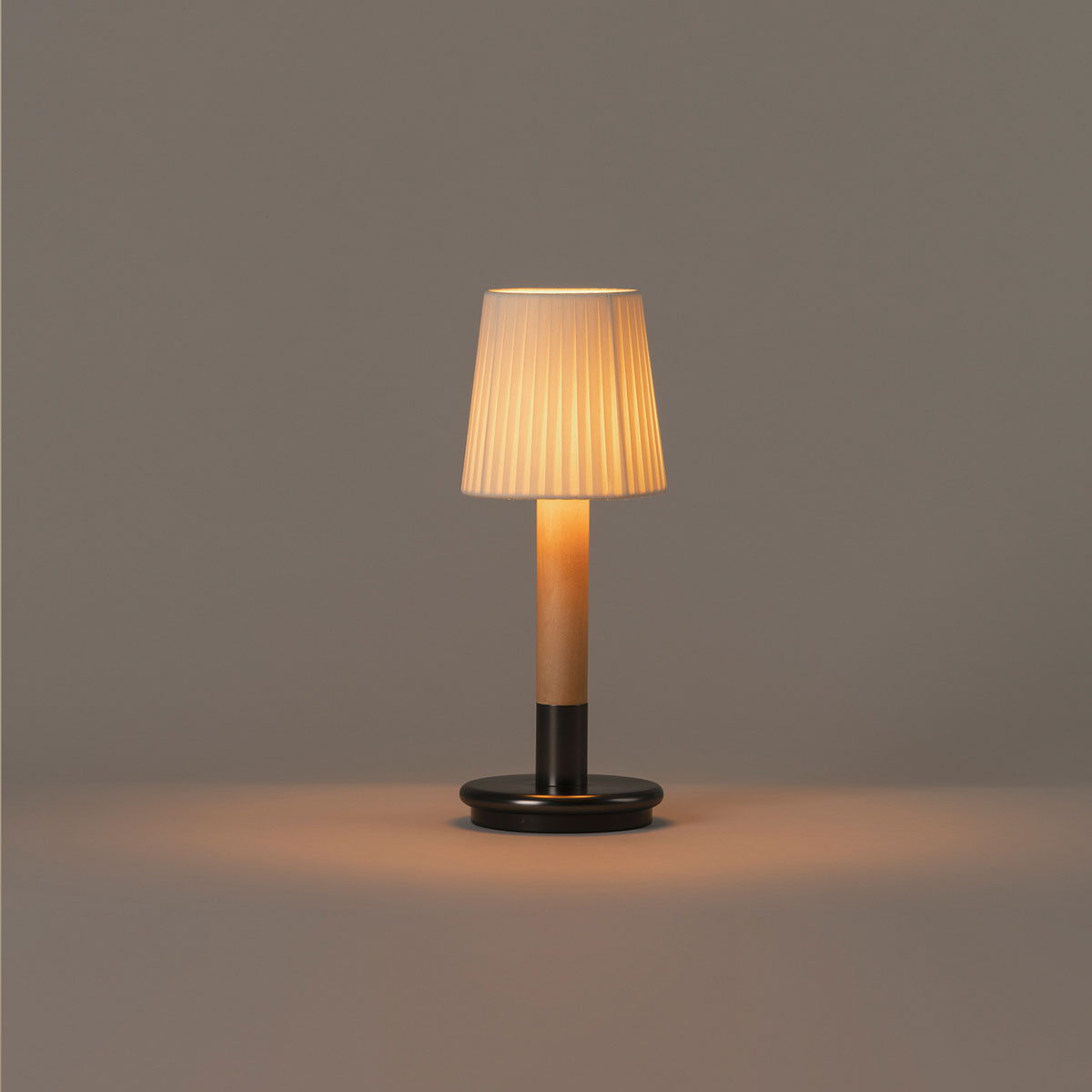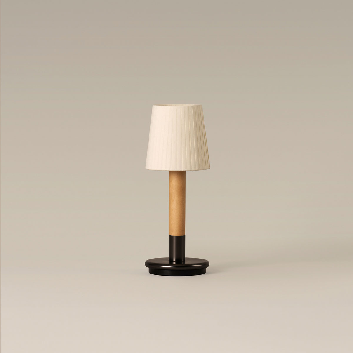 Básica Mínima Batería is the portable version of Básica Mínima. Its cylindric structure, made of birch wood, holds two lampshade options: pleated natural ribbon and beige stitched parchment. With a light touch, the lamp turns on and off, making it a light and practical companion.