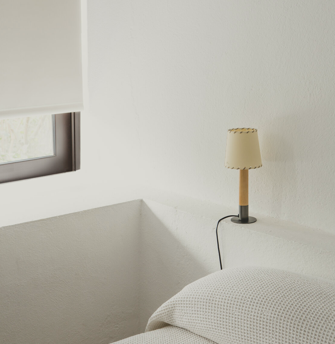 Básica Mínima is the pocket edition of the Básica lamp. On its own or with others, it combines sturdiness and lightness. The shade and finish are available in two unique versions. The first features a bronze finish base and a pleated natural parchment lampshade. The second version has a nickel finish base and a ribbon-stitched lampshade. Switch incorporated into the luminaire with 2 levels of intensity.
