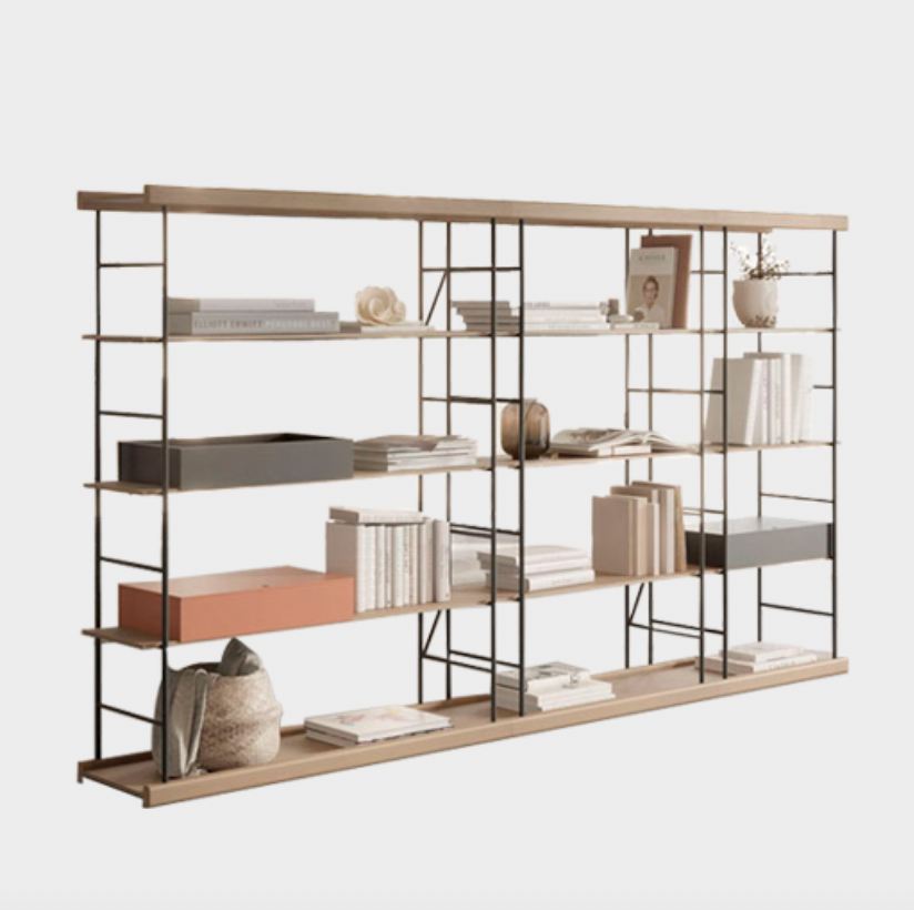 Shelving unit with lacquered metal structure, timber top, base and shelves, and boxes in lacquer. Includes one module 1100w x 1500h mm with 3 shelves, one module 800w x 1500h mm with 3 shelves, one module 600w x 1500h mm with 3 shelves, two closed boxes 480w x 110h mm and one open box 480w x 110h mm. For more custom options, please contact us.