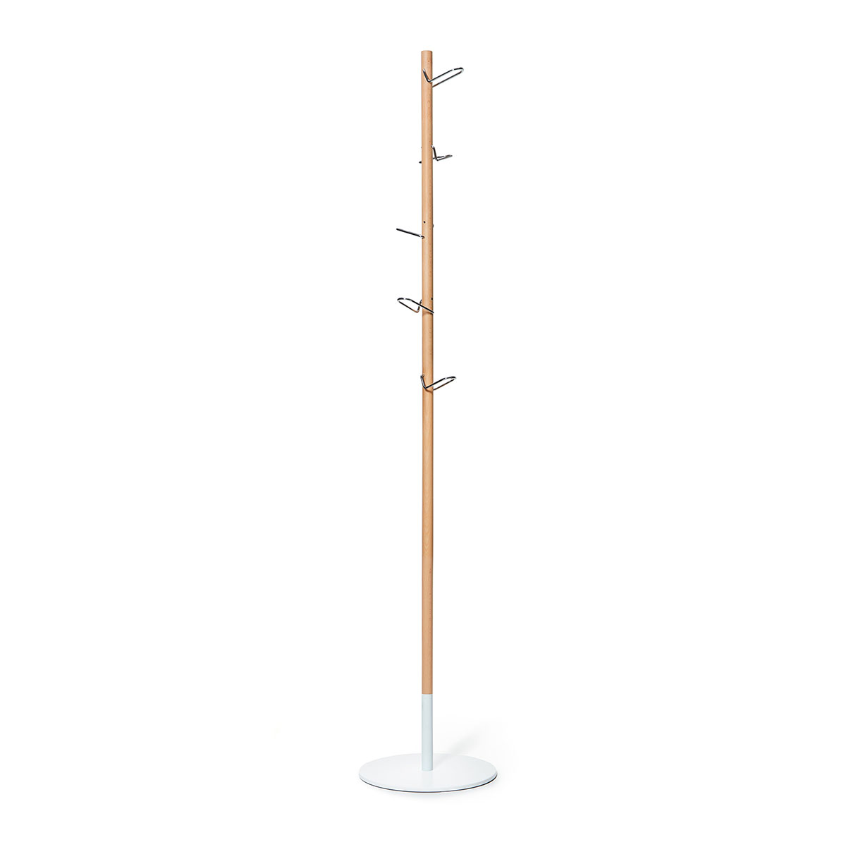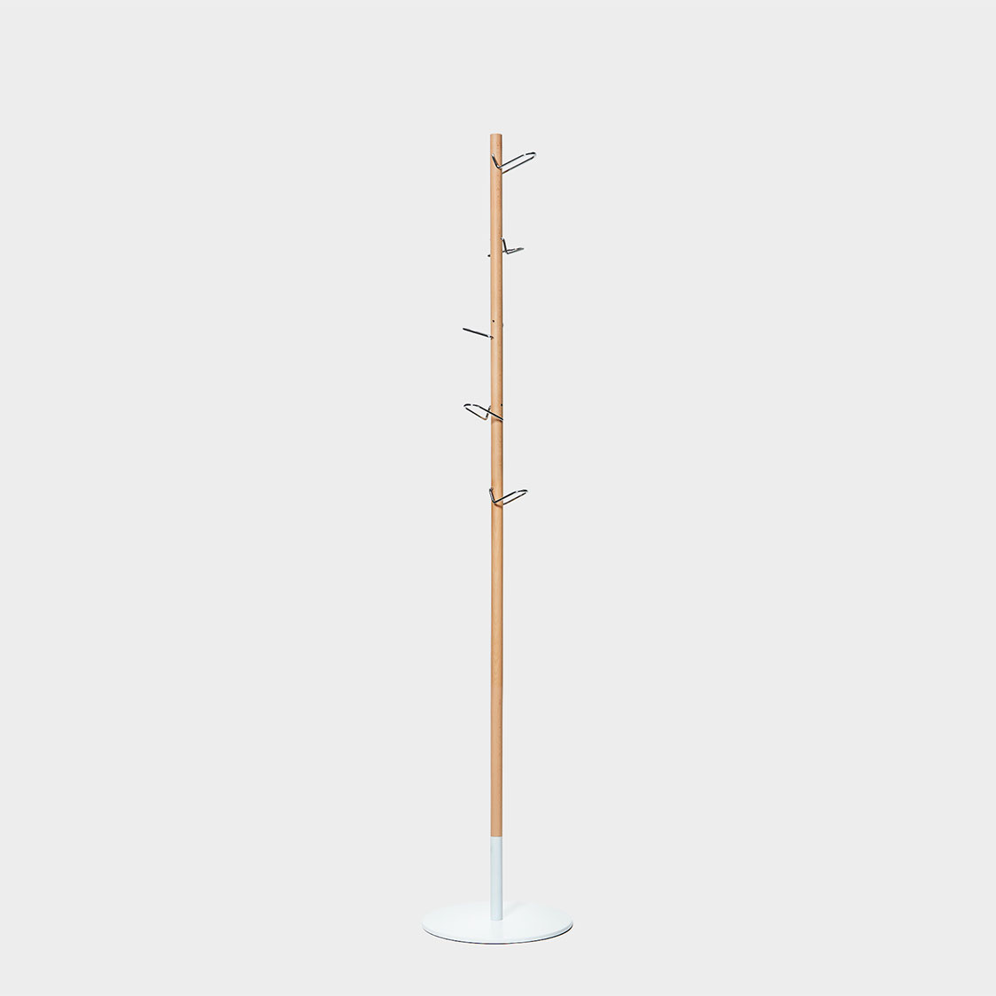 Metal or beechwood mast. Hangers made in chromed steel. Weighted base in stamped sheet metal.