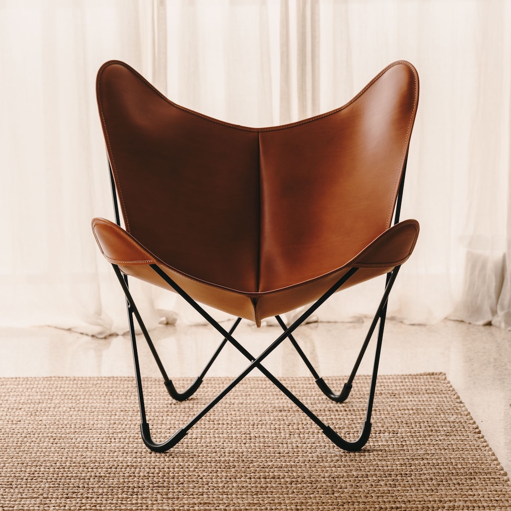 Famously known as the Butterfly Chair, the Bonet BKF one of the most iconic chairs ever to be produced. The 12mm solid steel structure is mechanically assembled and hand-polished. The feet are covered with fireproof rubber tubing. Its leather version features the highest quality, 100% vegetable-tanned leather, while its canvas version uses 100% cotton fabric. Each Bonet BKF® bears Antoni Bonet’s signature on the upper external flap of the seat.