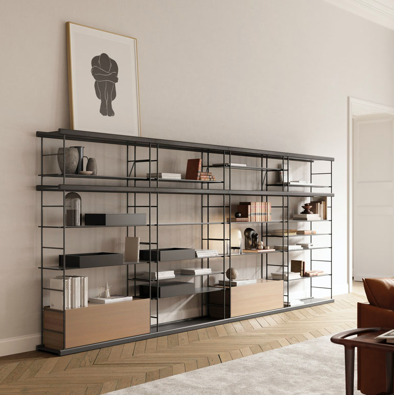 Shelving unit with lacquered metal structure, lacquered top, base, shelves and open boxes, and timber down swinging door modules. Includes one module 1100w x 1500h mm with 2 shelves, one 1100w down swinging door module and two 480w open boxes, one module 1100w x 1500h with 4 shelves and two 480w open boxes, one module 1100w x 1500h mm with 2 shelves and one 1100w down swinging door, one module 1100w x 1500h mm with 4 shelves, and three stackable modules 1100w x 450h with one shelf. For more custom options, please contact us.