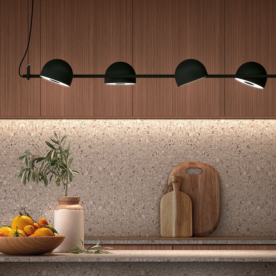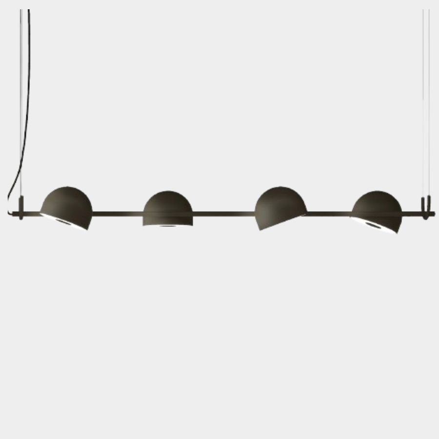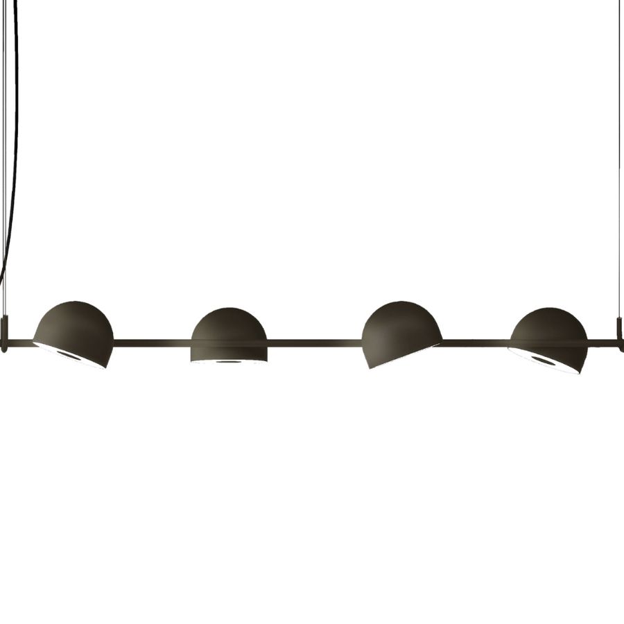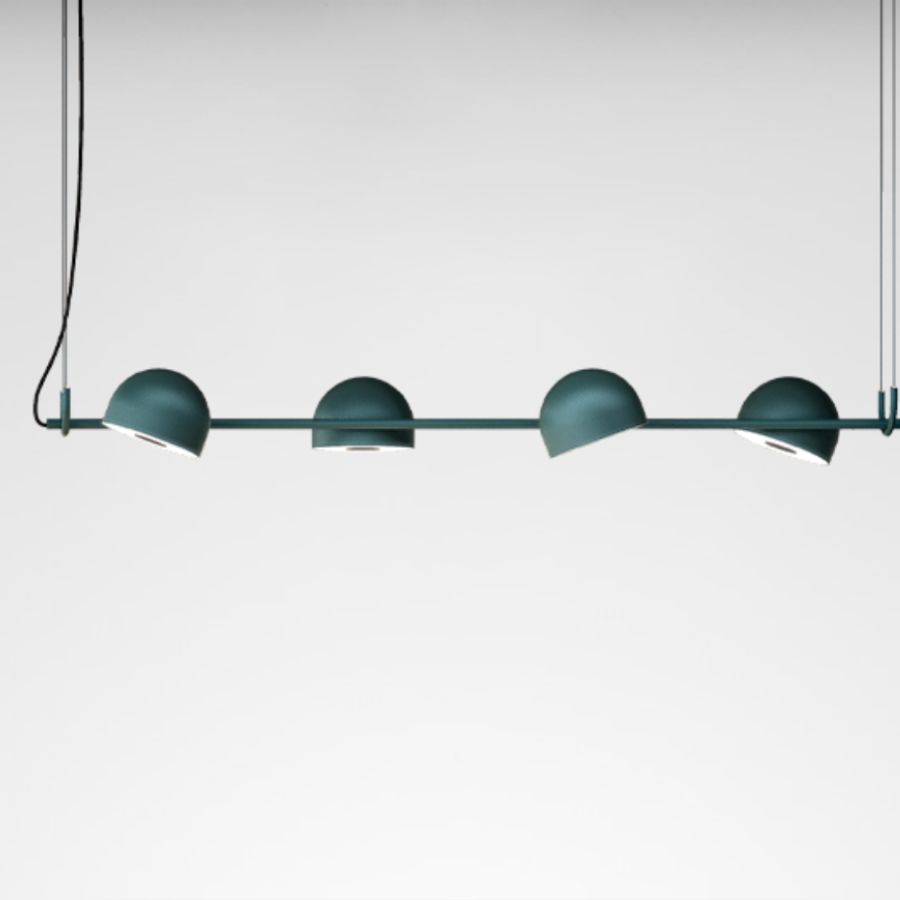 The Bowee LED suspension lamp features sleek half-sphere shades and is available in two configurations: vertical (S) or horizontal (SH). Bowee S offers a choice of one shade (S1) or two shades (S2), while Bowee SH includes options with four shades (S4) or six shades (S6). Each light source can be adjusted along the horizontal axis to provide soft, diffused lighting. Finished in an aluminium frame in either beige, black or turquoise.