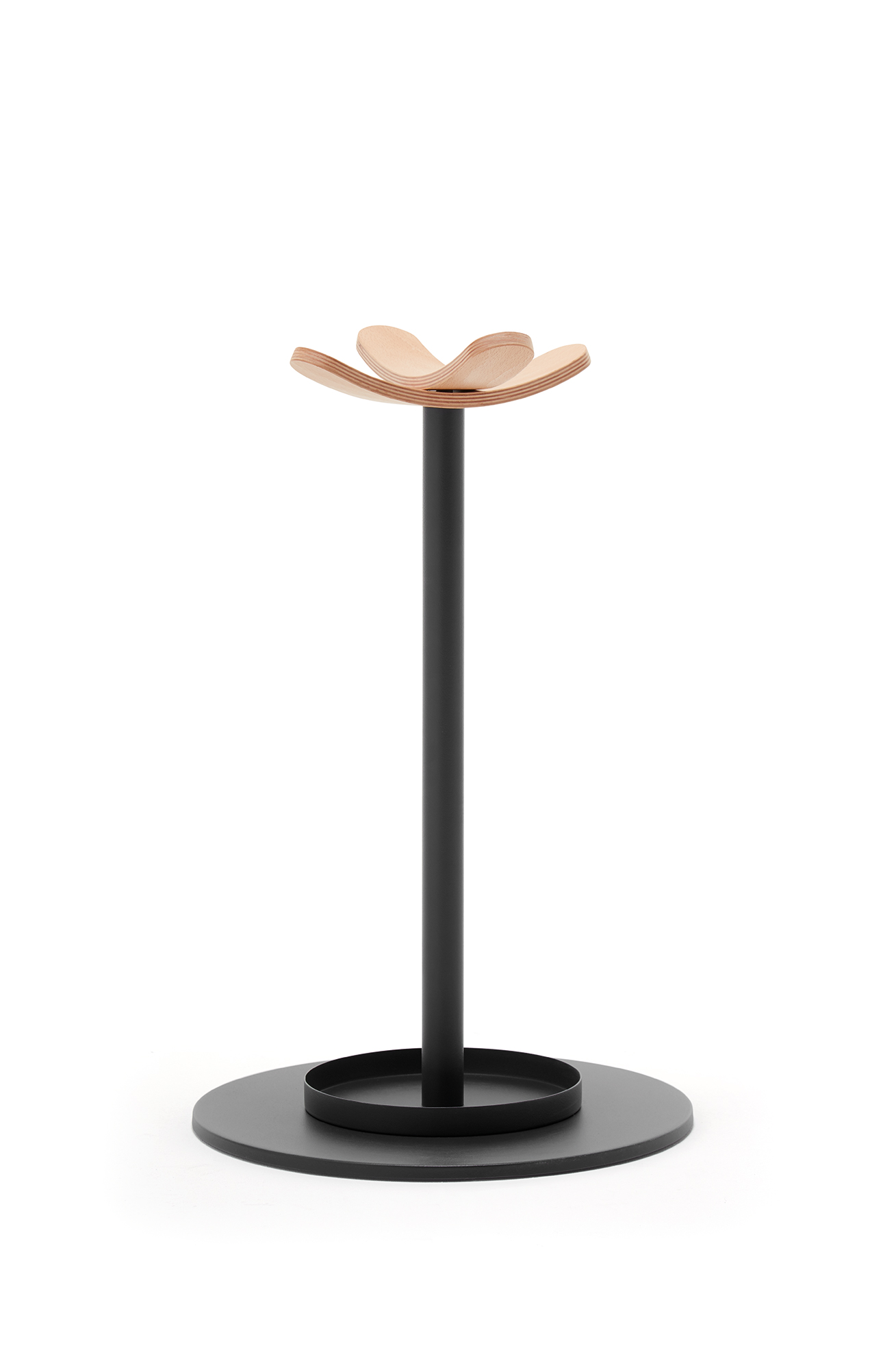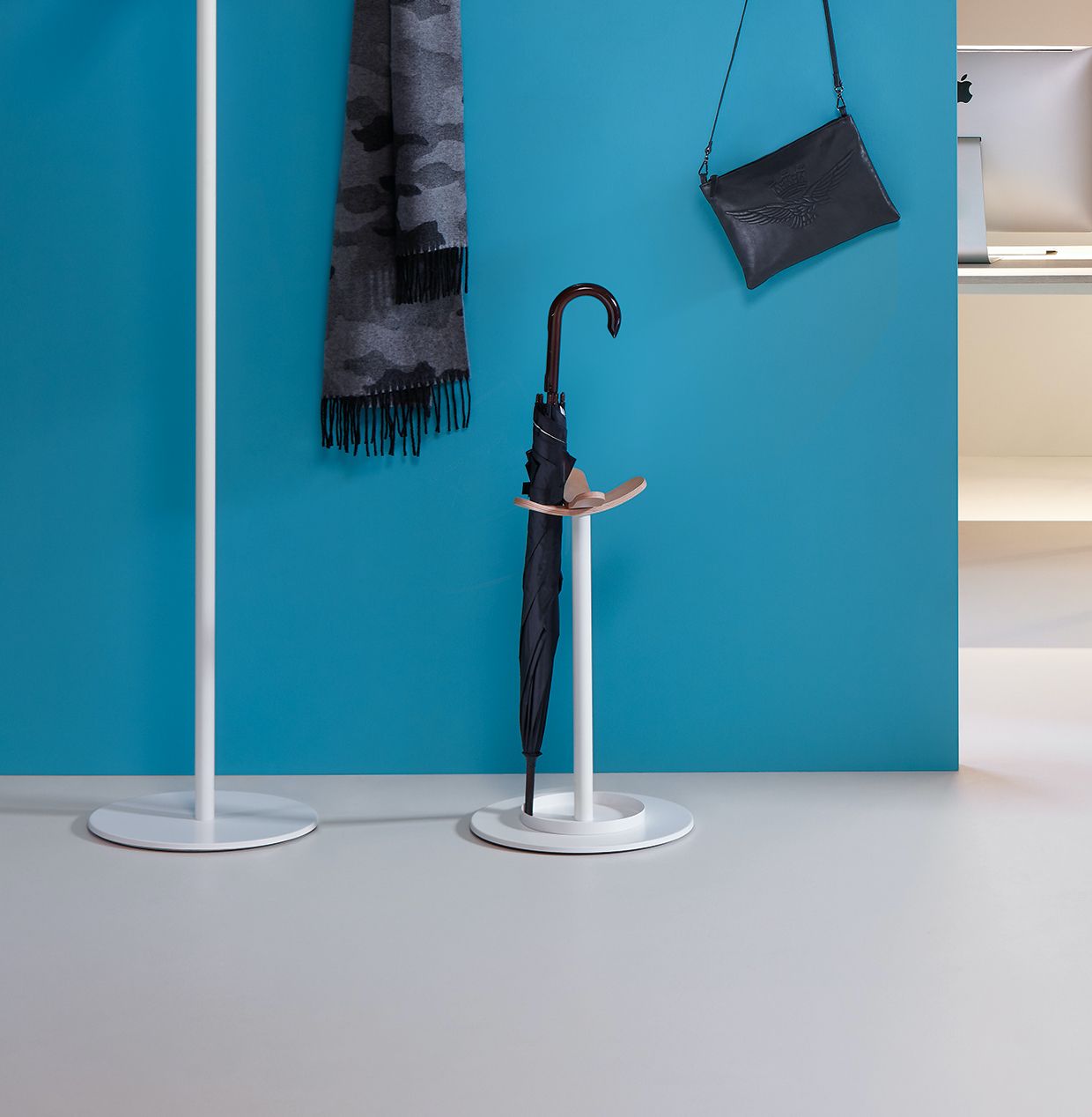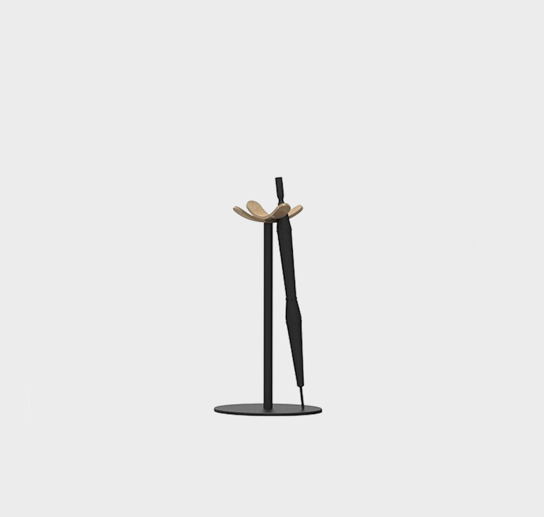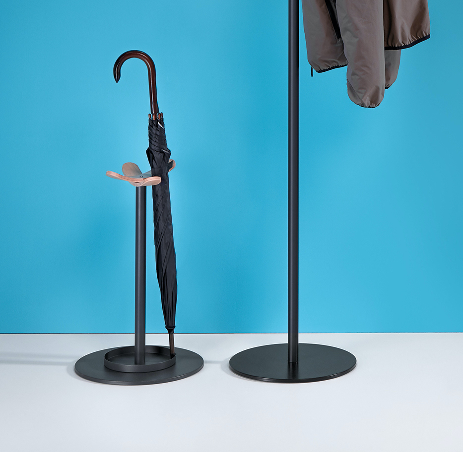 Combining the warmth of wooden hangers with a metal post and base. Umbrella stand also available with a coat stand in different versions. It is ideal for environments where a touch of warmth is sought.