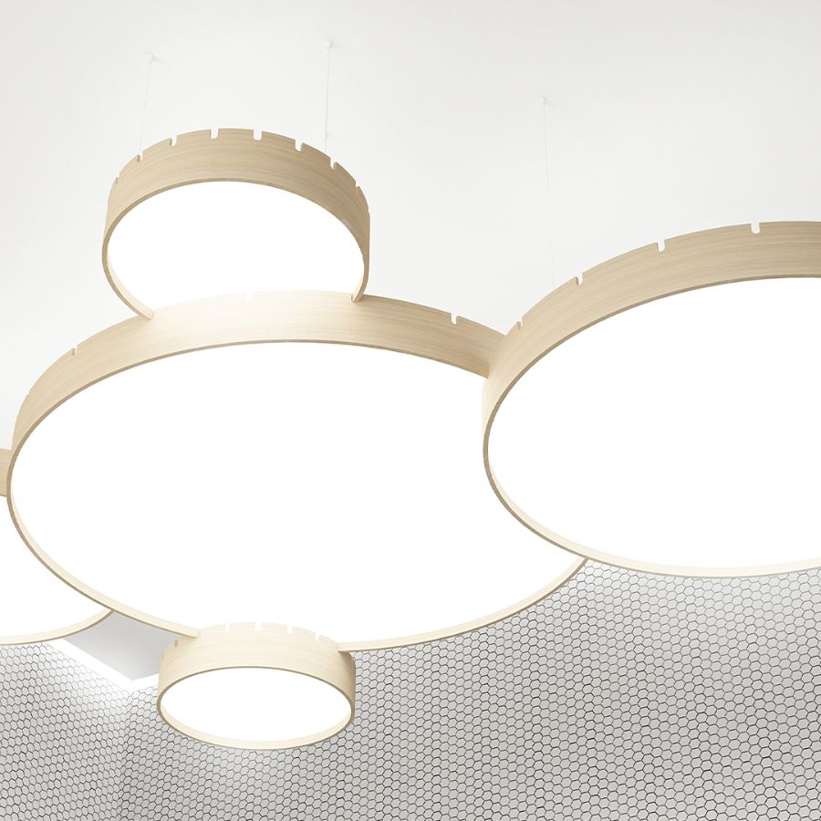 Finished in either textured matte white, textured matte black or natural oak. Dimmable.