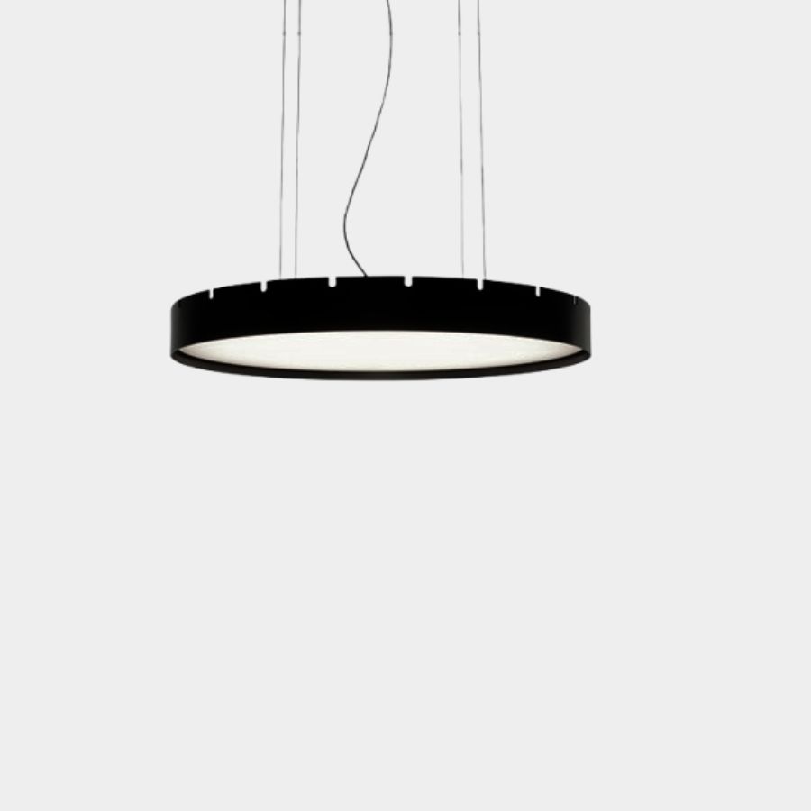 Round aluminum LED suspension lamp with a highly uniform opal white PMMA diffuser.