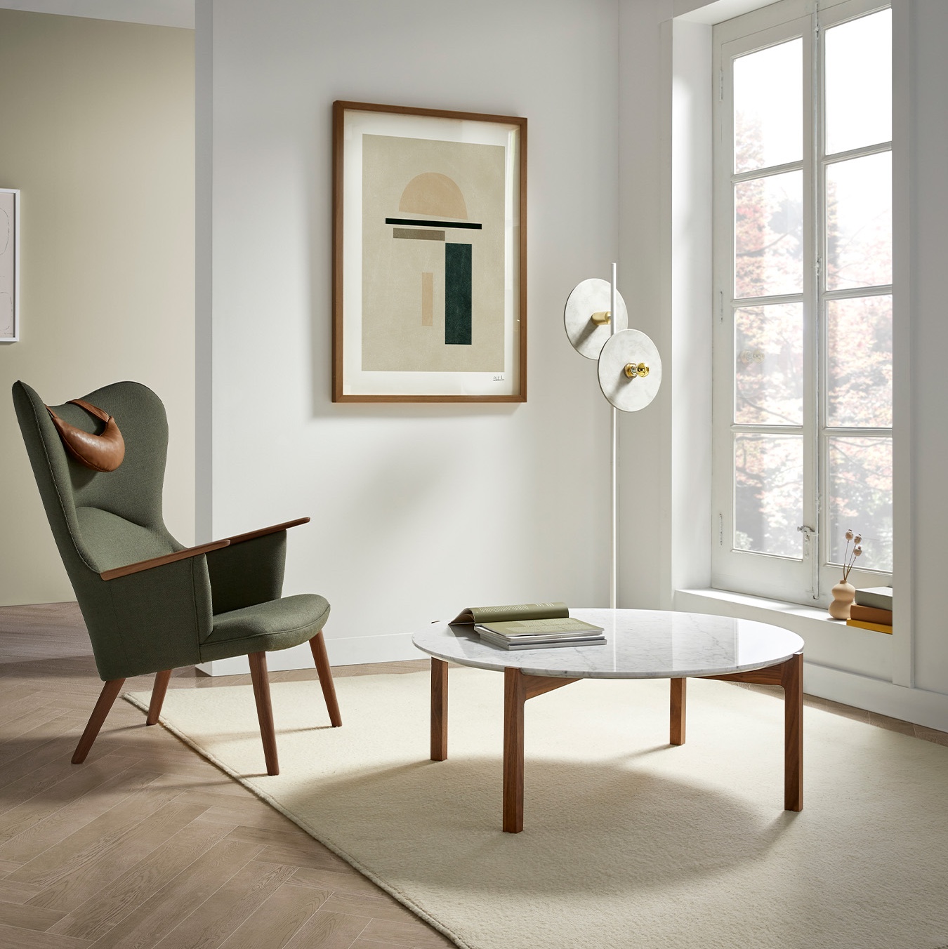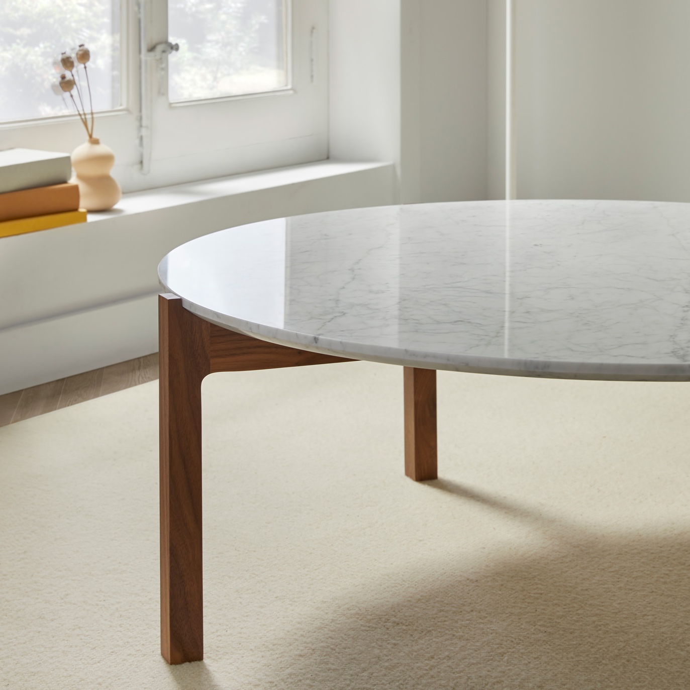 The meeting of the legs with the top, the detail of its bevel and the top’s joints are details that make it unique. Thanks to the combination of its finishes, marble, walnut and beech, we find a classic in contemporary design.