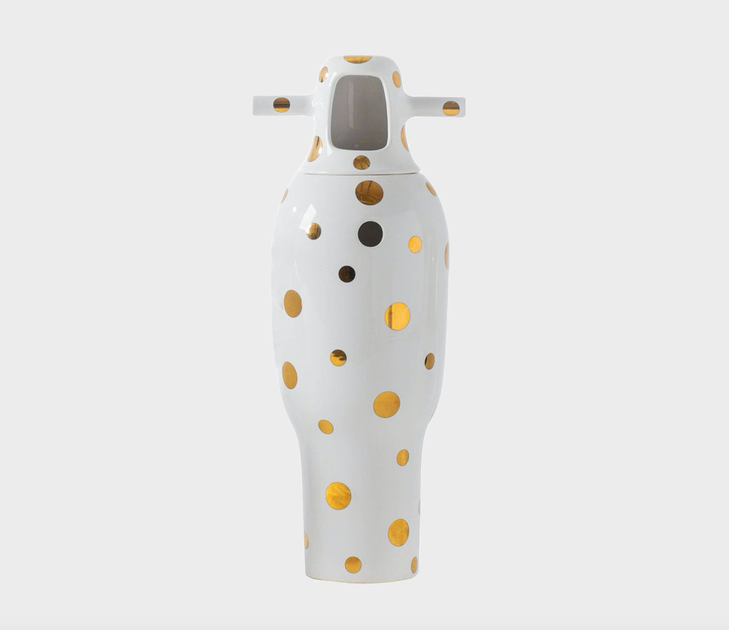 Crafted from glazed stoneware, each piece in the collection features a timeless white finish adorned with 24-carat gold-plated details, adding a layer of luxury to its bold sculptural design. The result is a vase that exudes sophistication while retaining Hayon’s signature playful aesthetic.