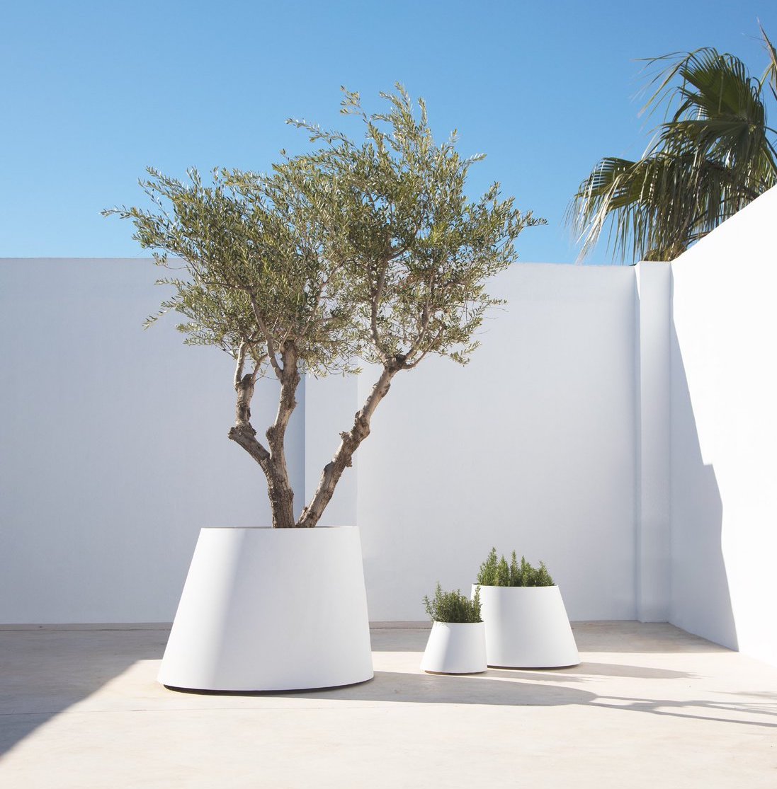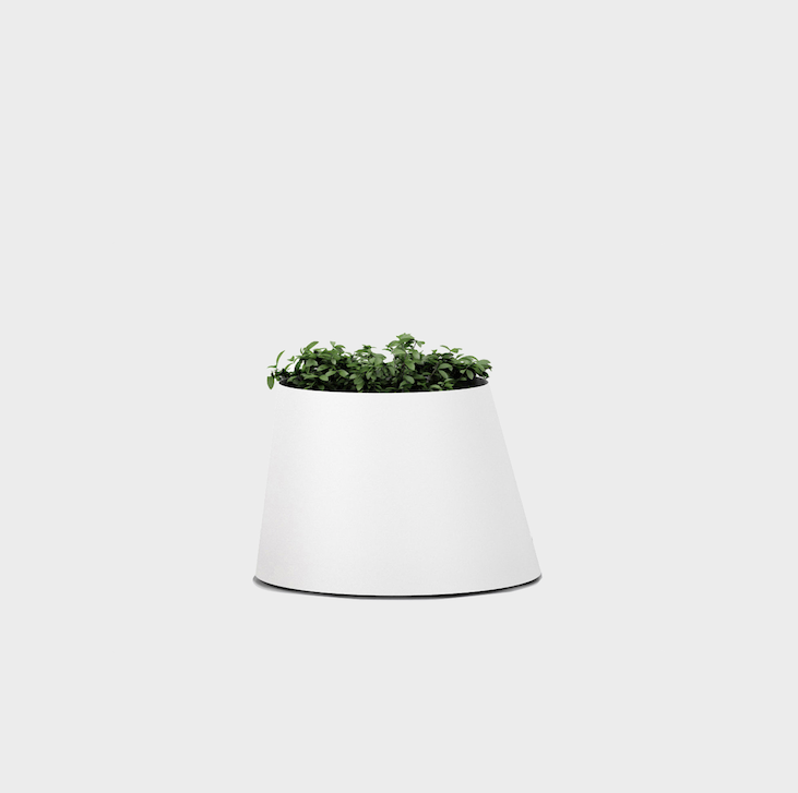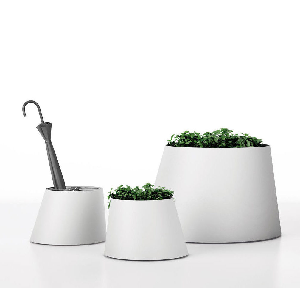 Planter of the Conee family. They are a frustoconical structure with the axis inclined composed by a bent plate of cold laminated aluminum. Lateral inner closure from a reinforced joint rivet and a welded lower closure base skeleton supporting its legs with casters. They include a saucer and a pot.