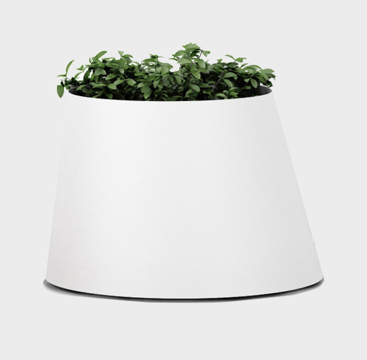 Planter of the Conee family. They are a frustoconical structure with the axis inclined composed by a bent plate of cold laminated aluminum. Lateral inner closure from a reinforced joint rivet and a welded lower closure base skeleton supporting its legs with casters. They include a saucer and a pot.