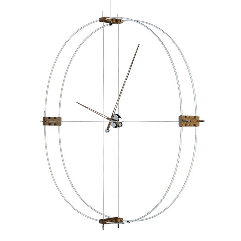 Semi-oval wall clock with double ring fiber structure. Steel box and wooden hands in the center.