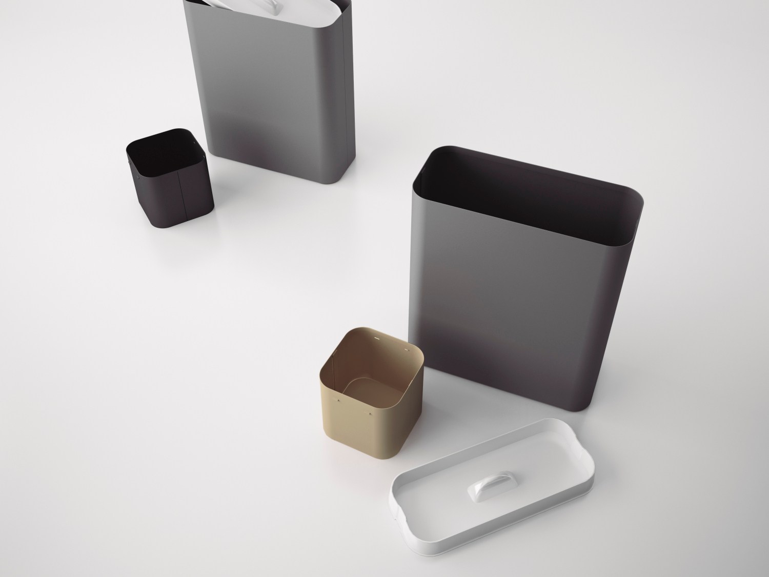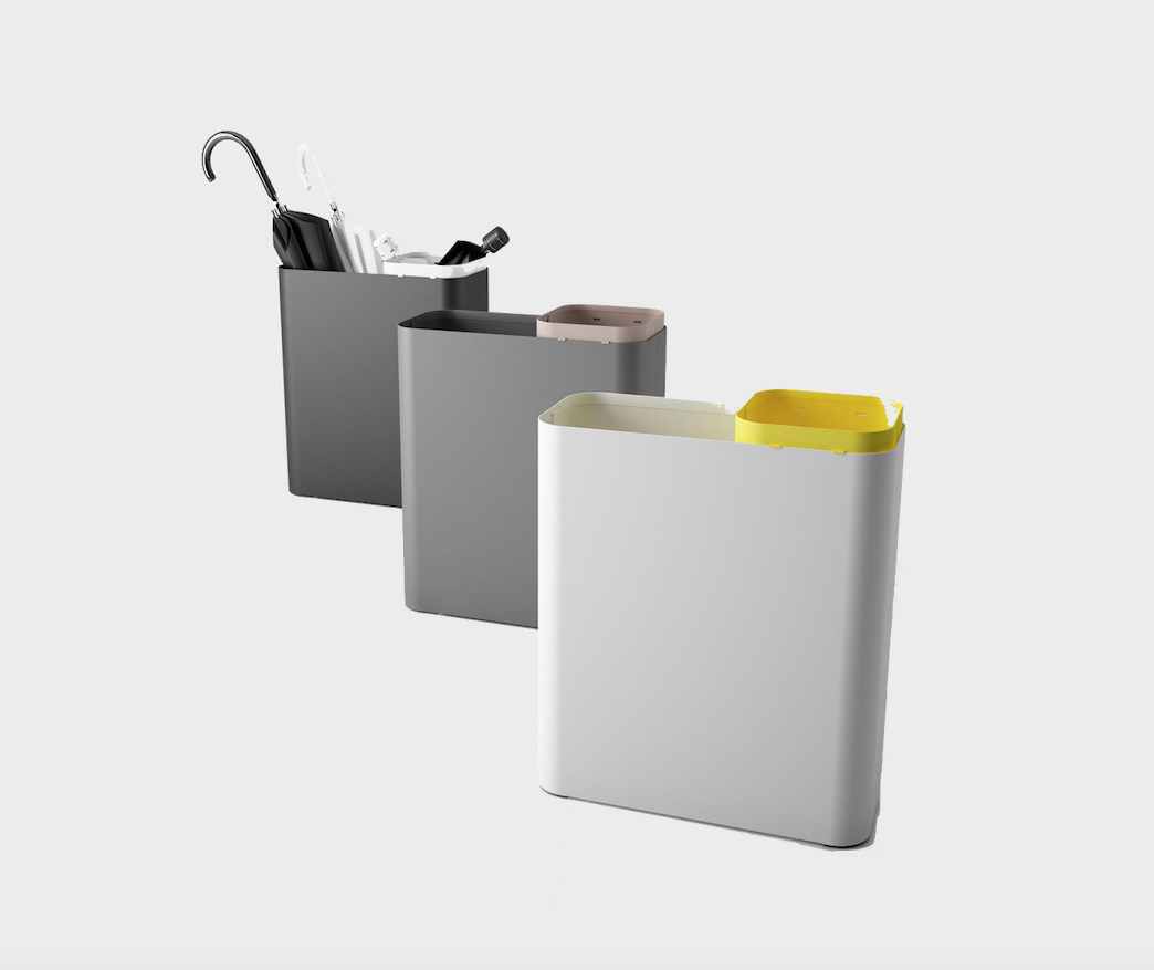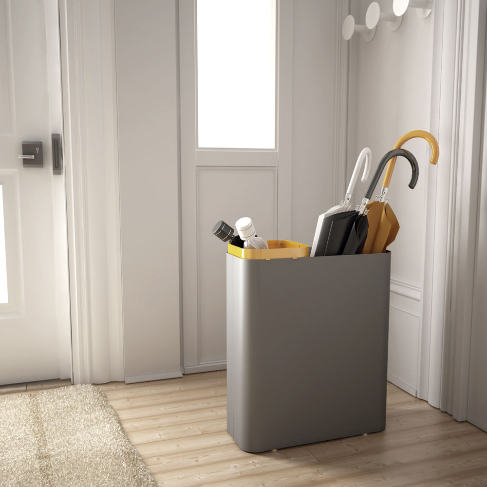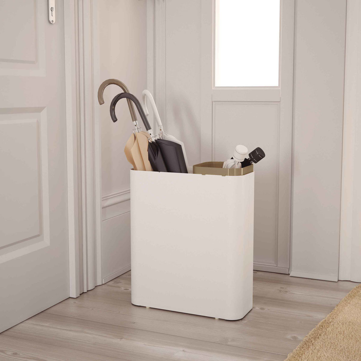 Umbrella stand made of galvanized steel sheet with two separate buckets, one for long umbrellas and another bucket for foldable ones, allowing plenty of colour combinations.
