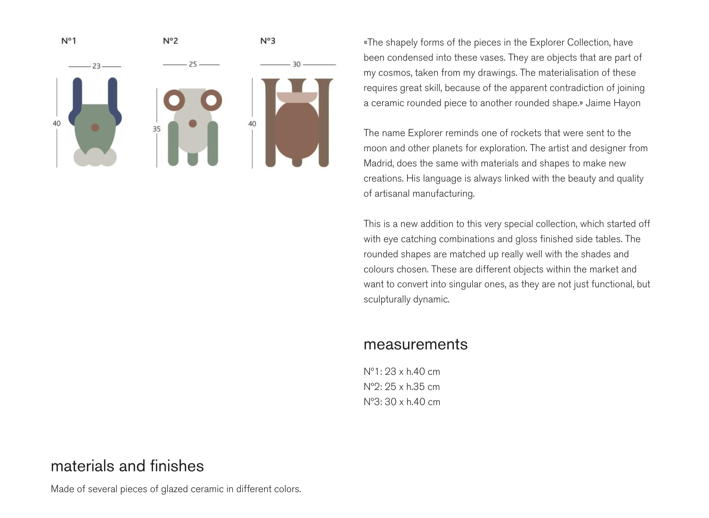 «The shapely forms of the pieces in the Explorer Collection, have been condensed into these vases. They are objects that are part of my cosmos, taken from my drawings. The materialisation of these requires great skill, because of the apparent contradiction of joining a ceramic rounded piece to another rounded shape.» Jaime Hayon.