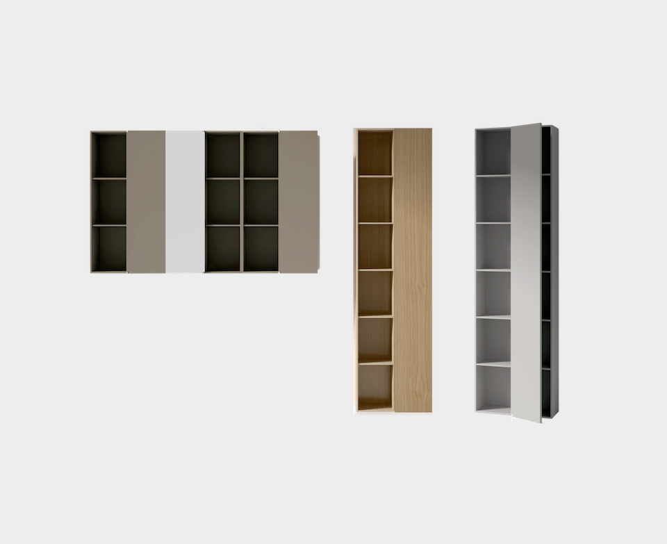 The originality of its swing door makes Flip an attractive and surprising item of furniture. Faced with the alternative of choosing open or closed bookshelves, Flip provides a solution that turns opposed options into complementary ones. The colours and the different orientation of the doors allow you to combine various units in spontaneous, or if you prefer perfectly planned, visual games in such a way that their positioning creates a dynamic and almost chameleon-like space.
