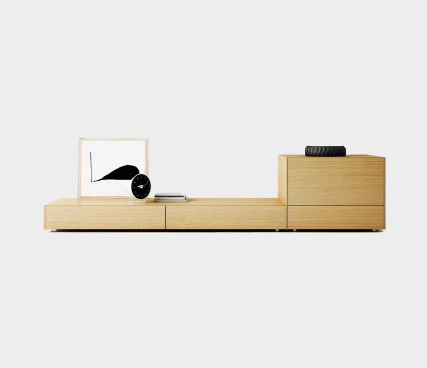Oak TV unit. Three drawers and one flat down door. For more custom options, please contact us.