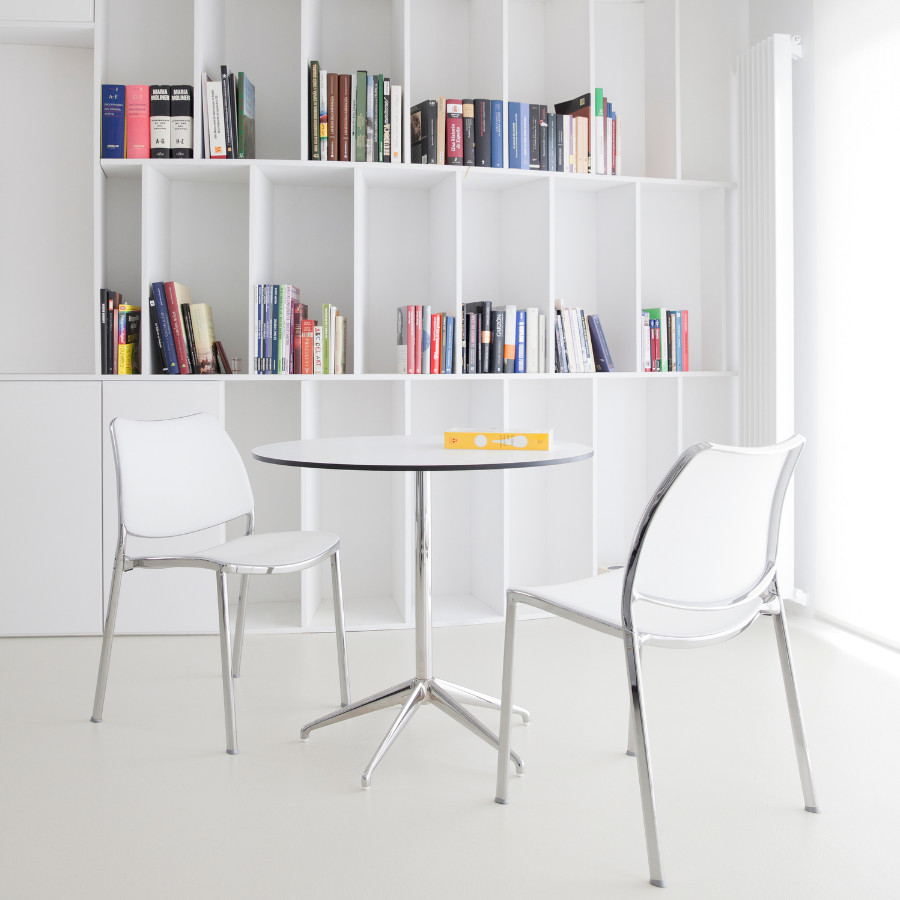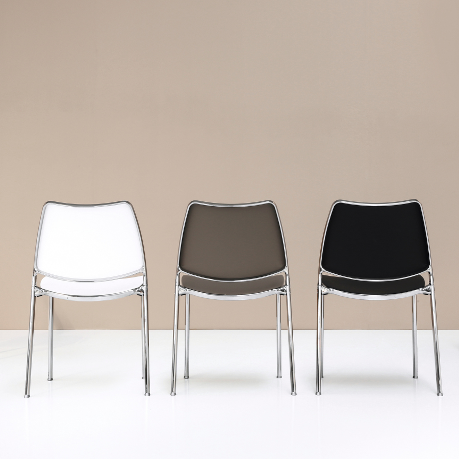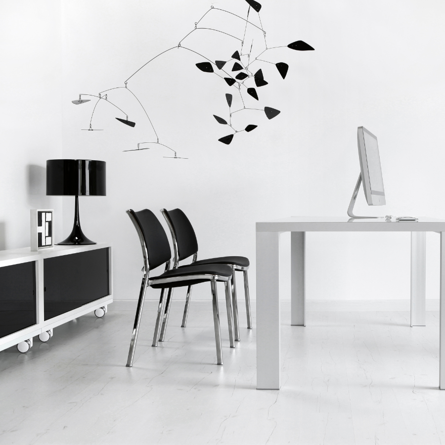 The aluminium frame is available in glossy or matte chrome, or powder-coated in black or white.