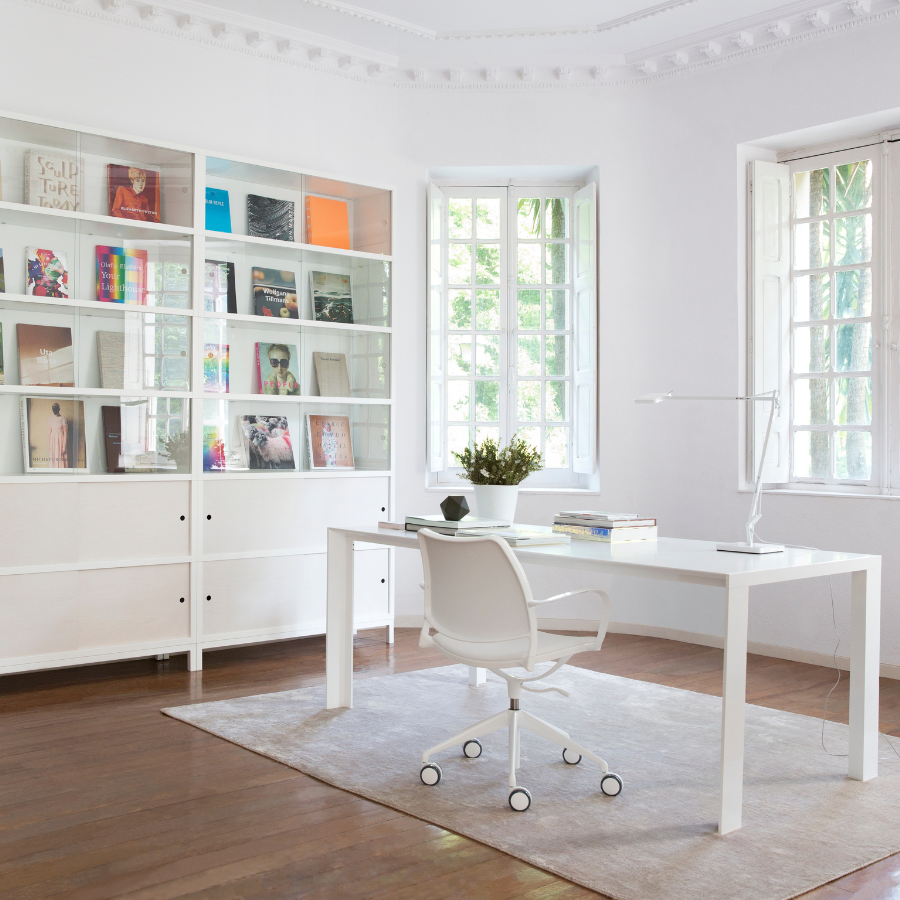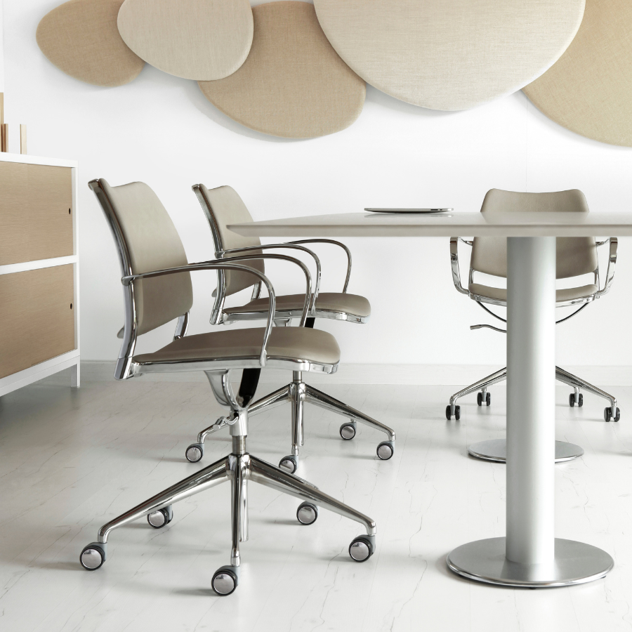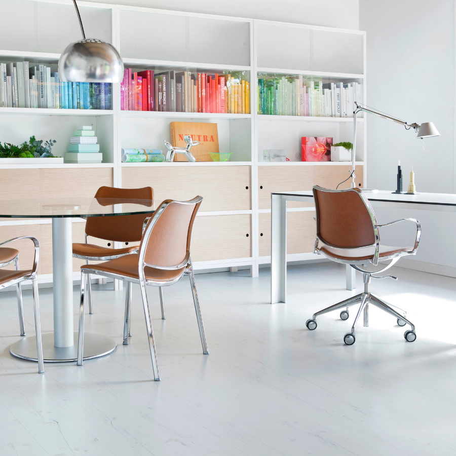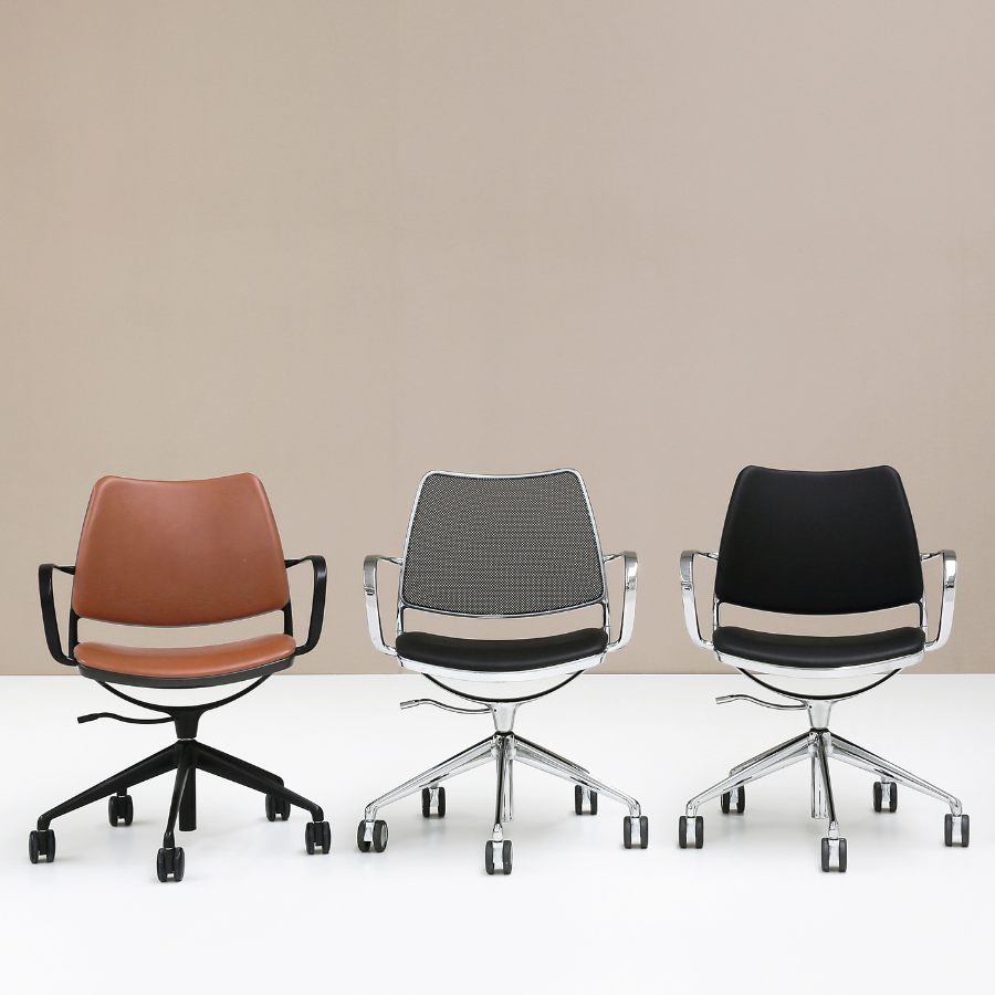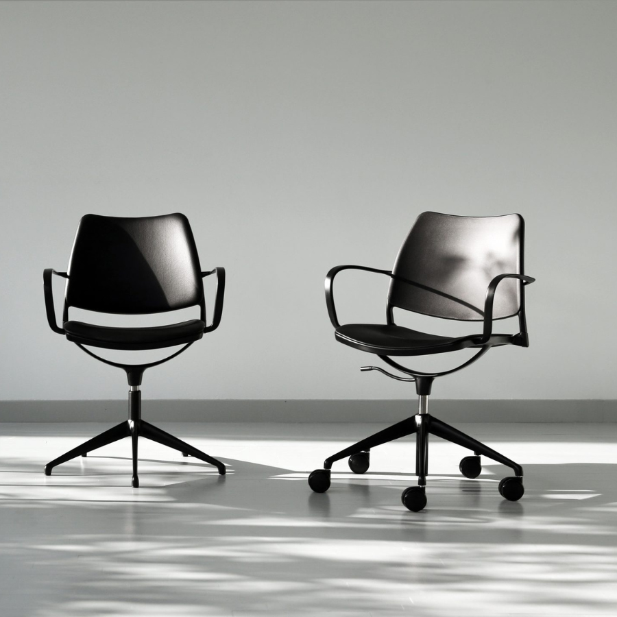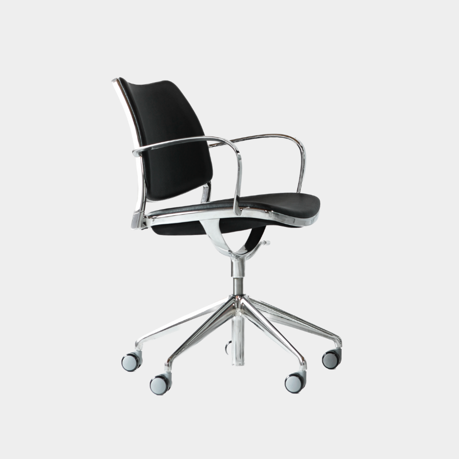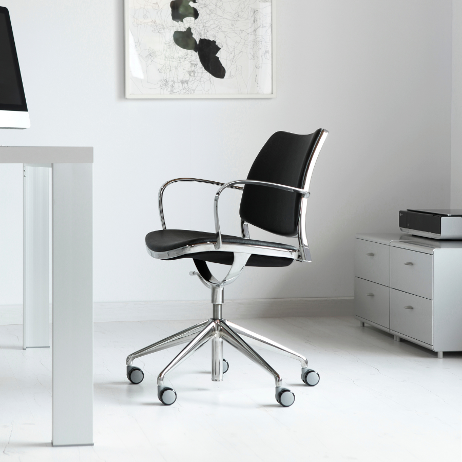 With or without armrests. Finish of the frame for swivel chairs: shiny chrome, or powder coated in black or white.