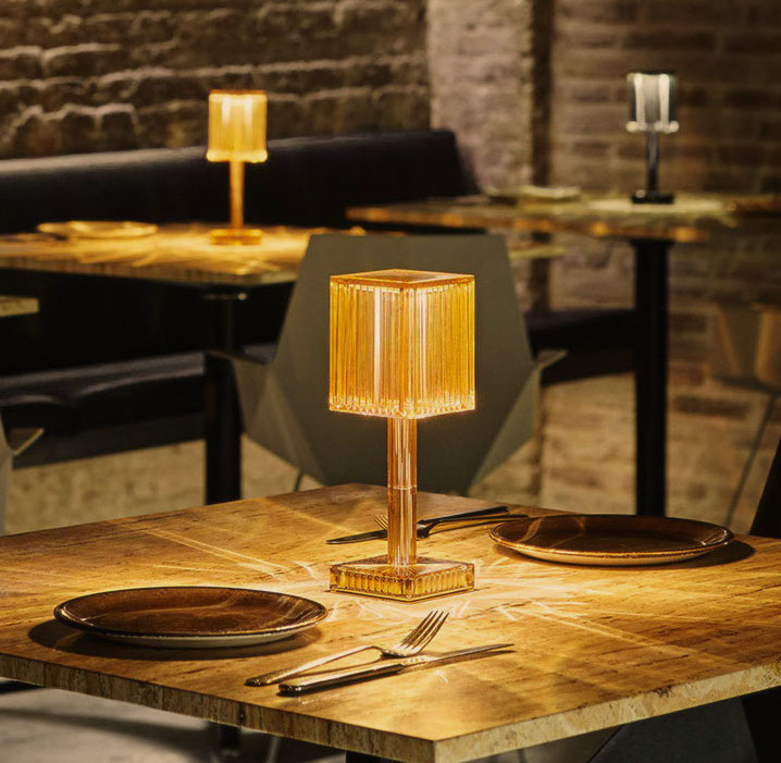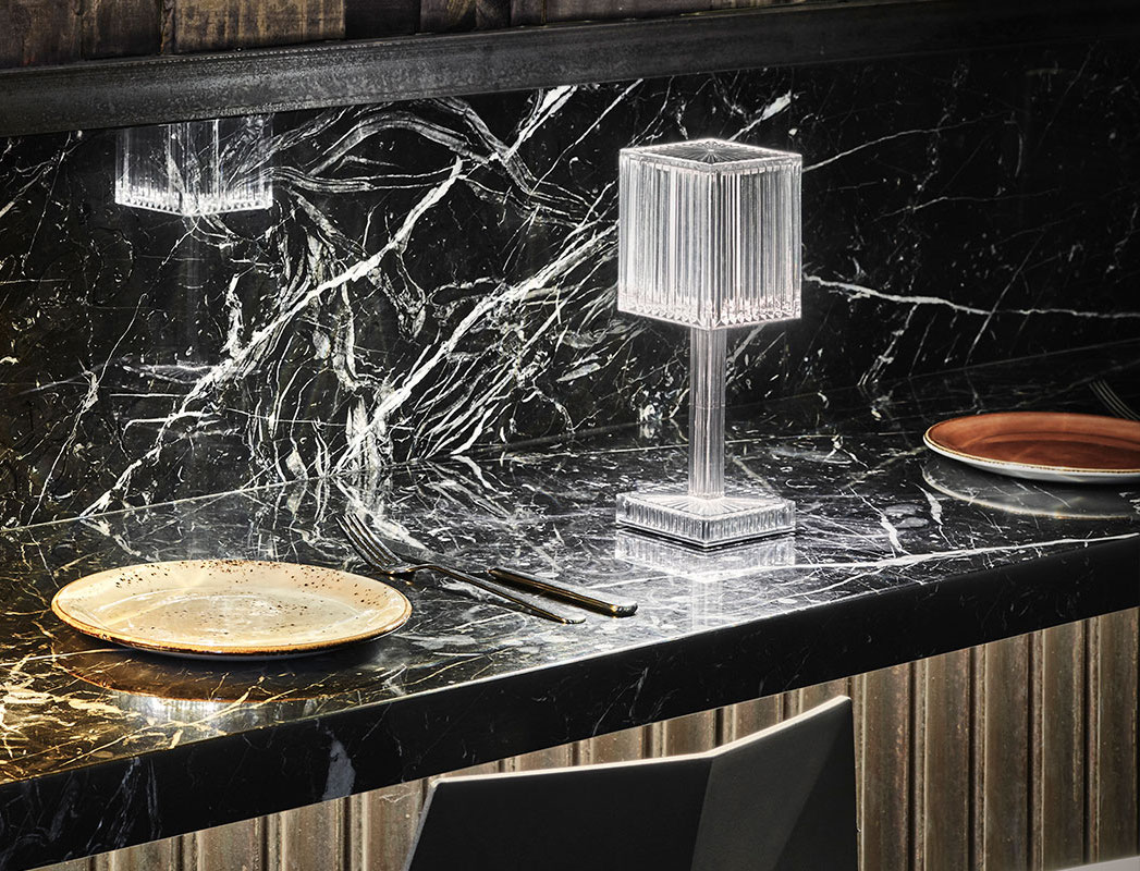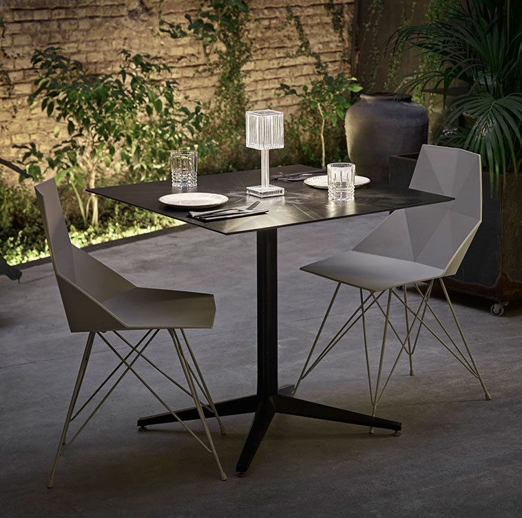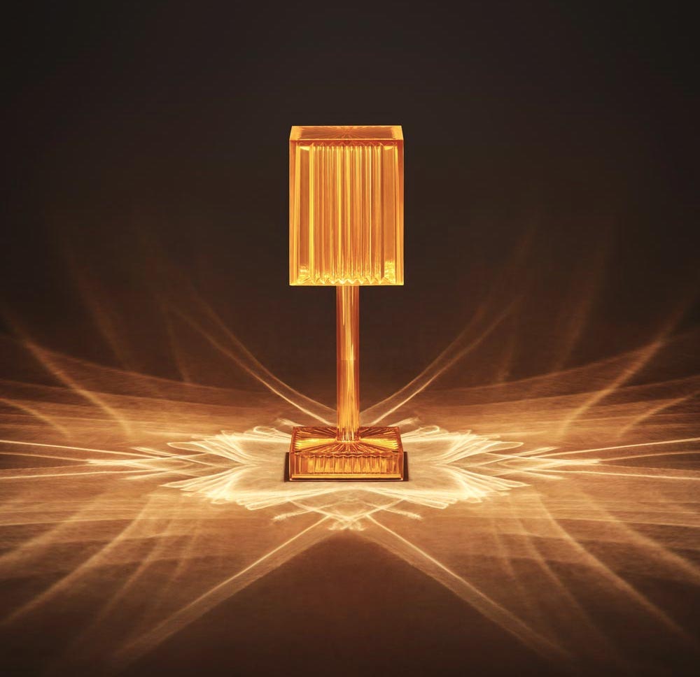 The GATSBY collection, designed by Ramón Esteve for VONDOM, recalls the Art Déco lighting. The Gatsby Prisma Lamp is based on the idea of creating a surrounding atmosphere through a suggesting play of lights by means of the lamp’s surfaces, where the material reproduces the shapes and sensations of engraved glass.