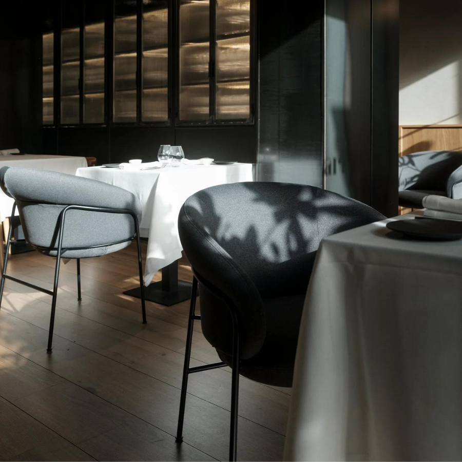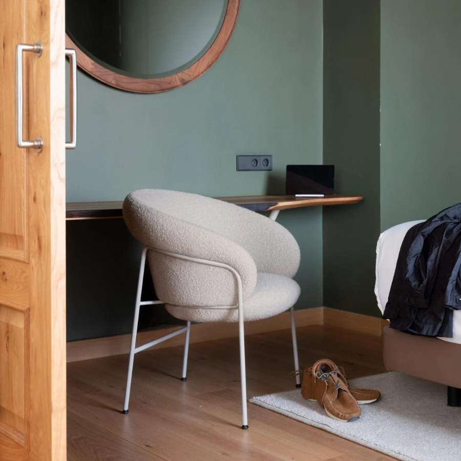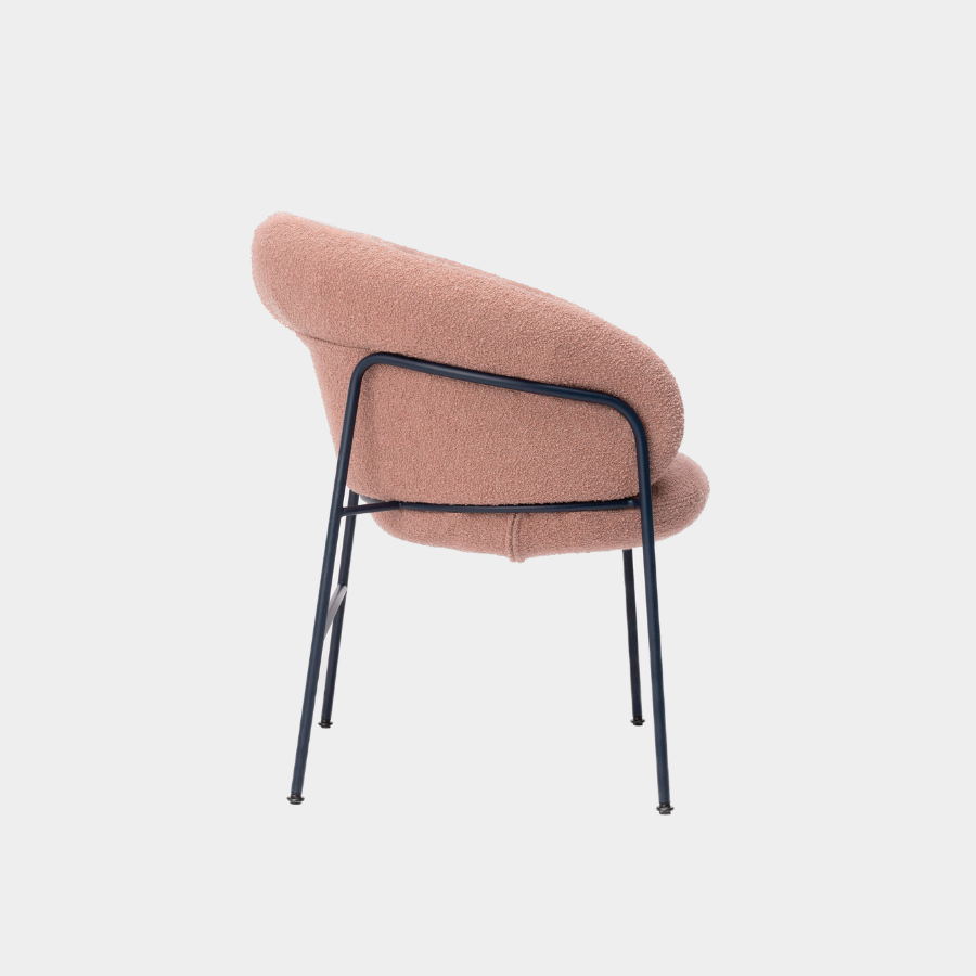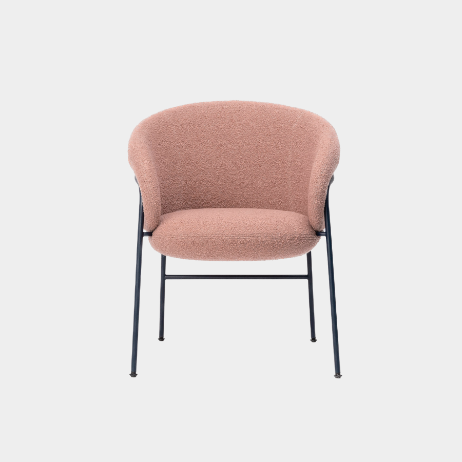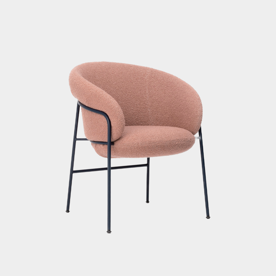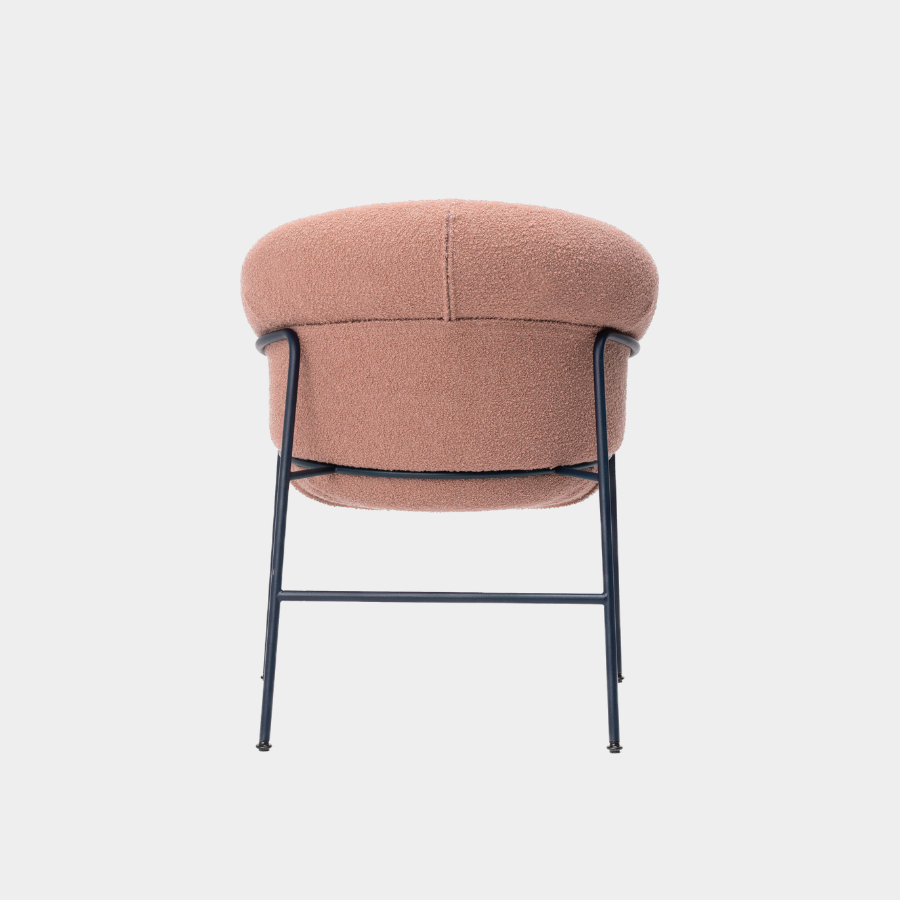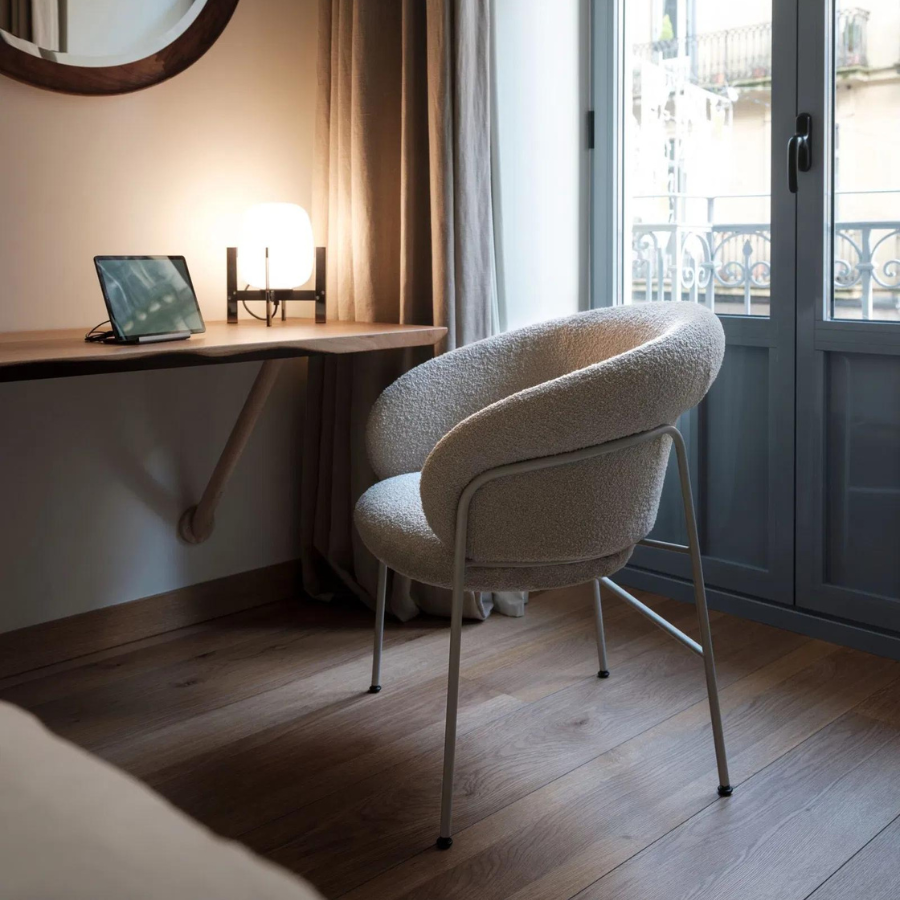 The Ginger Chair, designed by Sebastian Herkner for Ondarreta, combines sculptural elegance with inviting comfort. Its softly rounded seat exudes a sense of coziness, while offering a versatile design that can be paired with three distinct base options: a classic four-leg structure, an organic and decorative sled framework, or a wooden collar base – seen here in the classic four-leg metal structure.