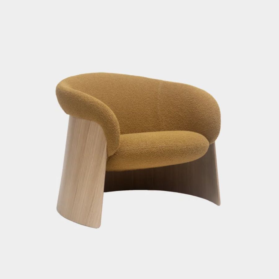 The Ginger Lounge Chair by Ondaretta features a beautifully sculpted seat with soft, rounded contours designed for ultimate comfort and style. This versatile chair offers three distinct base options to complement any space: a classic four-leg structure that provides stability and timeless appeal, a decorative sled framework with an organic design that adds a contemporary and artistic touch, and a wooden collar base that brings a warm, inviting feel to any room. Seen here in the wood collar base and mustard finish.