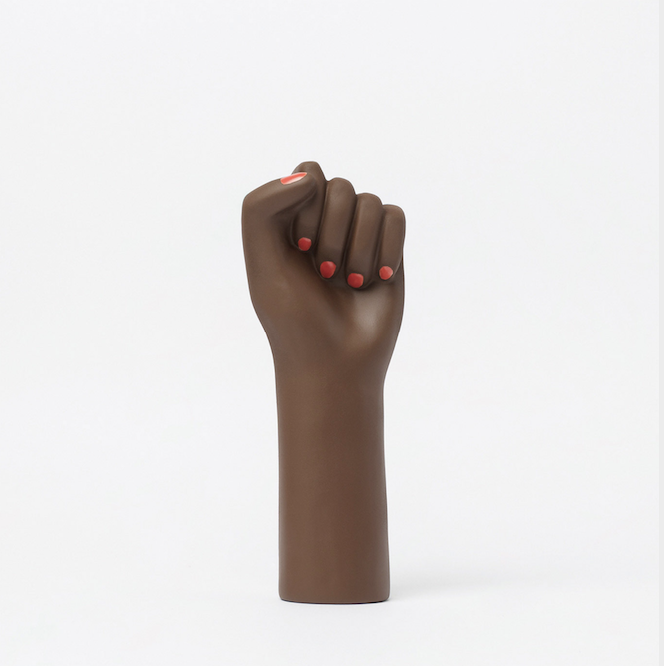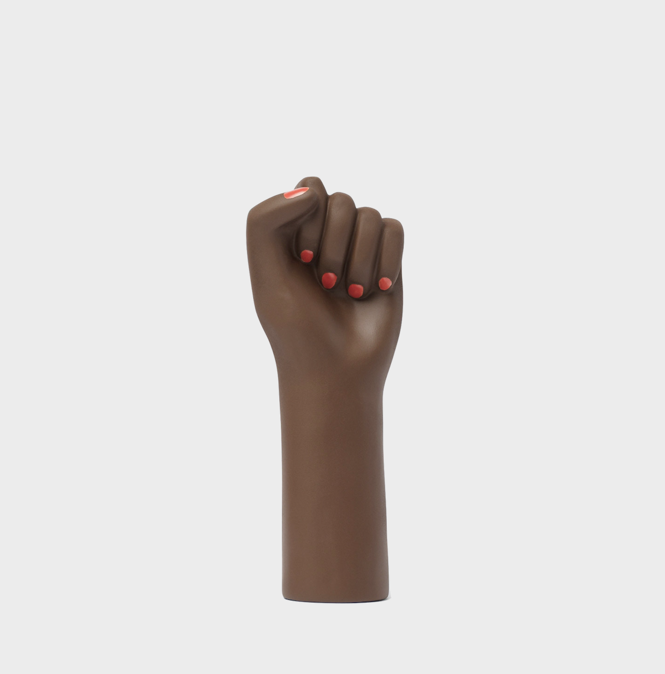 Modern ceramic vase with matt finishing shaped as a fighting womans hand, with painted red nails. A symbol of resilience, bravery and strenght.