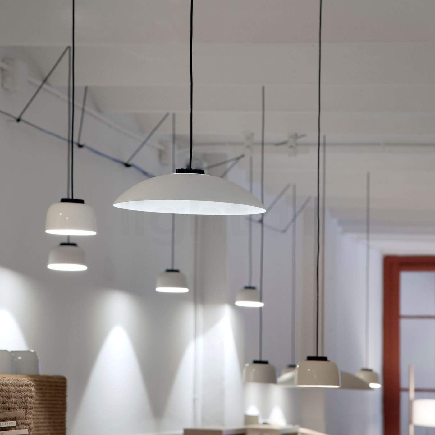 White or hematite red metallic shade with matte finish. Diffuser in white translucent methacrylate.