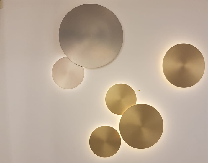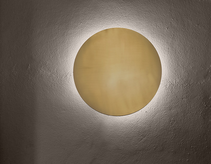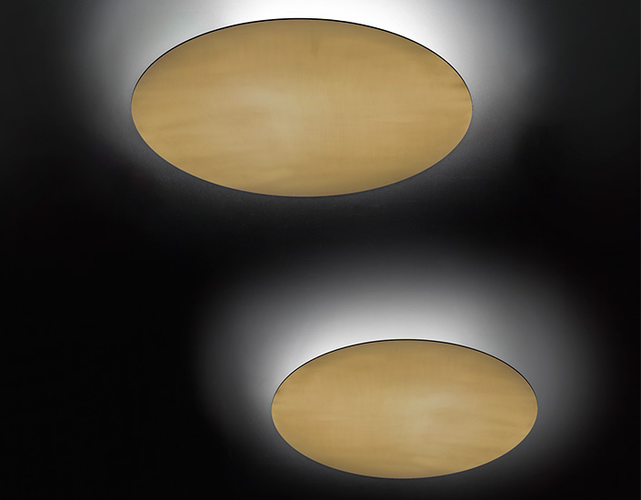 Ceiling lamp with metal diffuser decorated in brass, Pewter, Black and White. Sober presence gives a soft light in the environment creating intense atmospheres. The light source is an integrated LED.