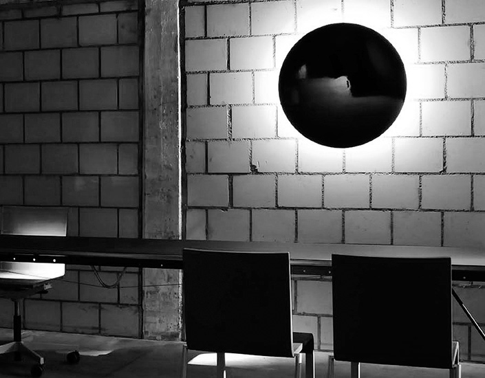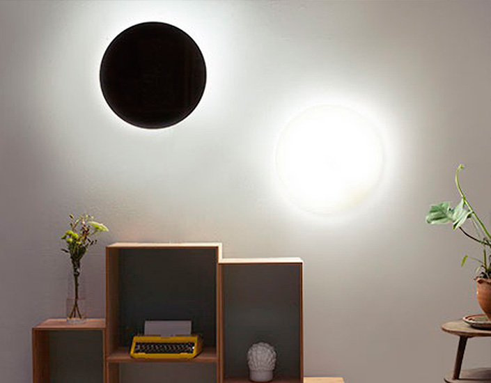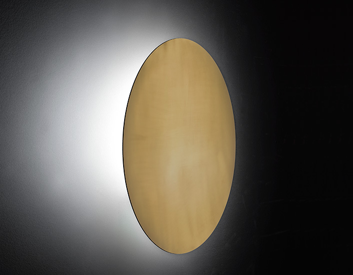 Wall lamp with metal diffuser decorated in brass, Pewter, Black and White. Sober presence gives a soft light in the environment creating intense atmospheres. The light source is an integrated LED.
