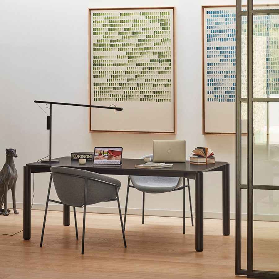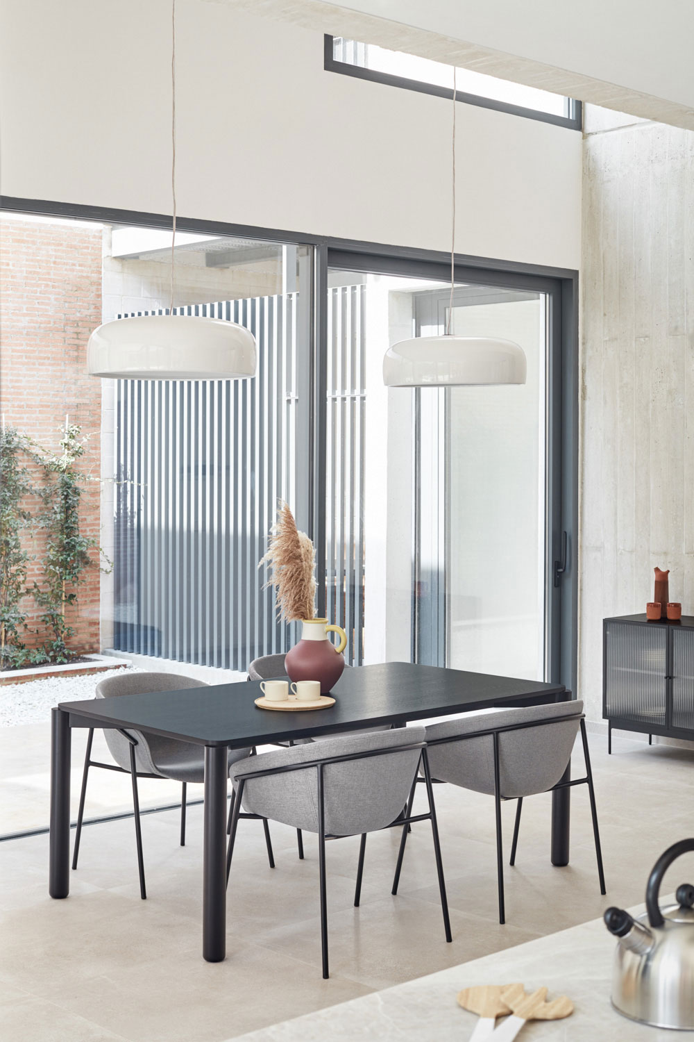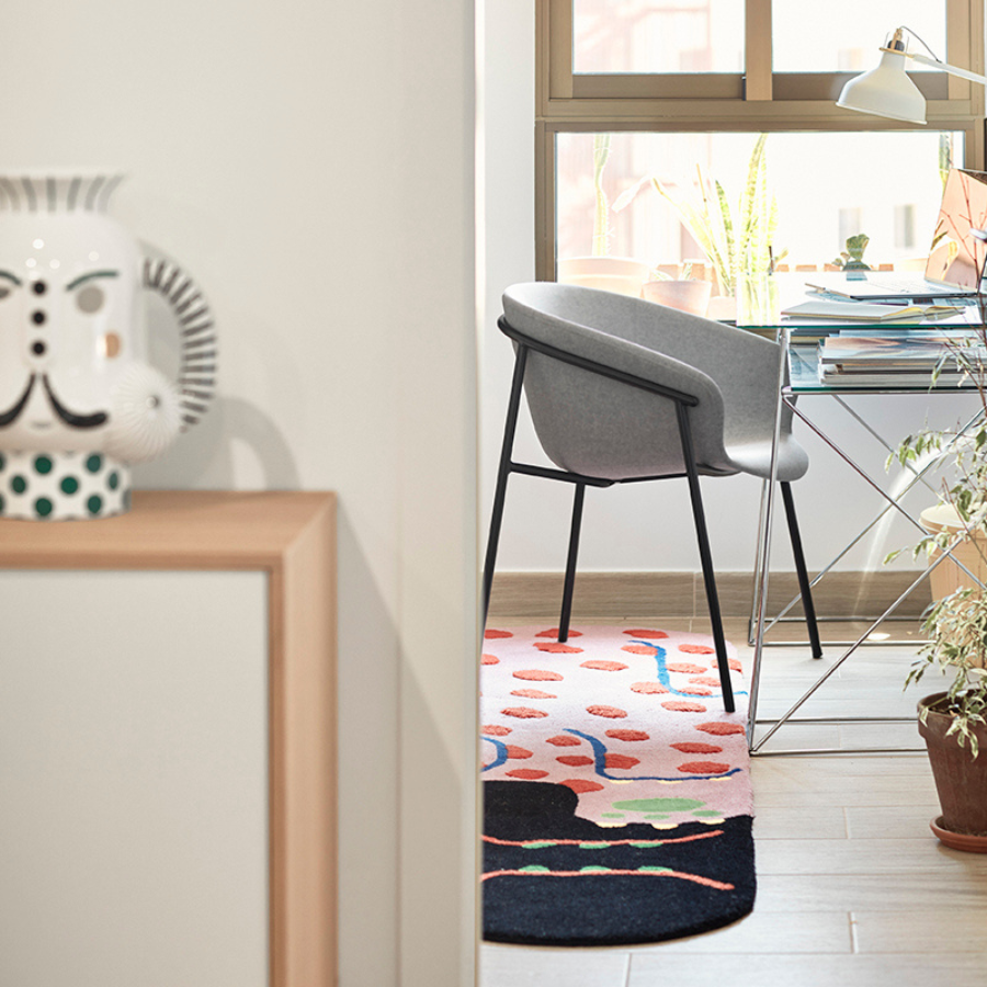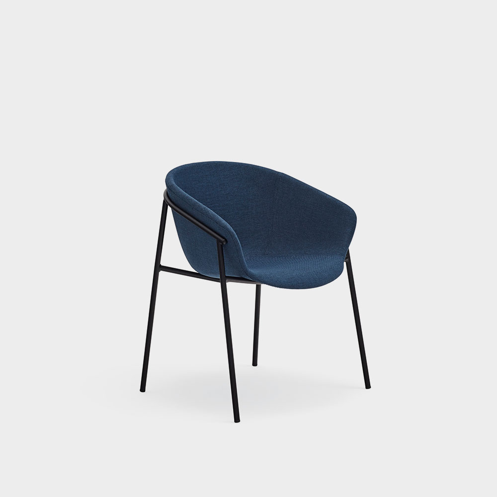 The Hug Chair, designed by Cambres Design for Teulat, is a masterful blend of comfort and modern aesthetics. Its defining feature is the elegant metallic frame that gracefully envelops the generously upholstered body, creating a striking visual contrast and a sense of embrace. The chair’s spacious, cushioned seat invites extended moments of relaxation, making it ideal for long dinners or conversations with friends.