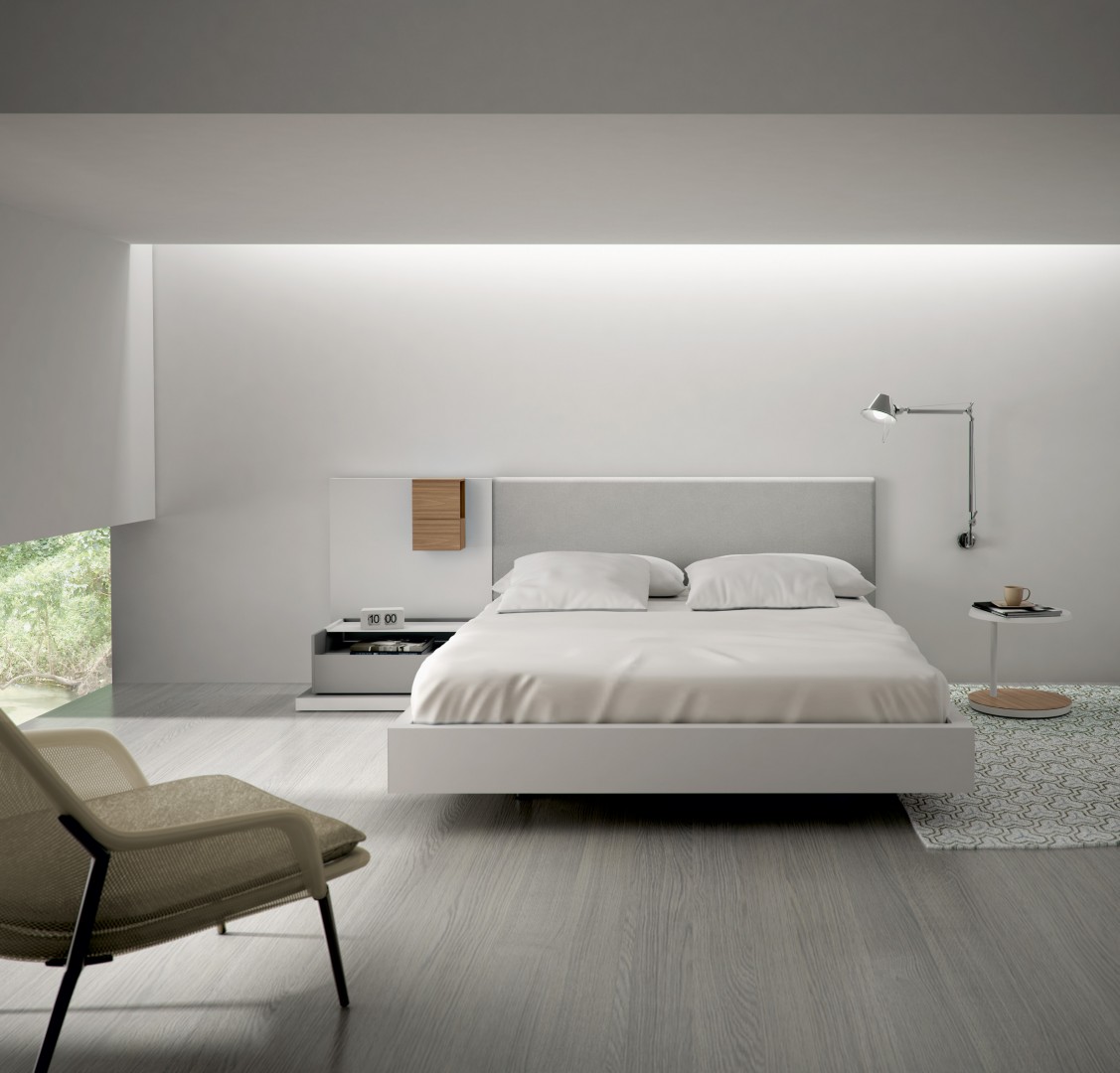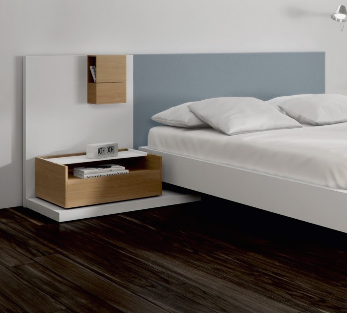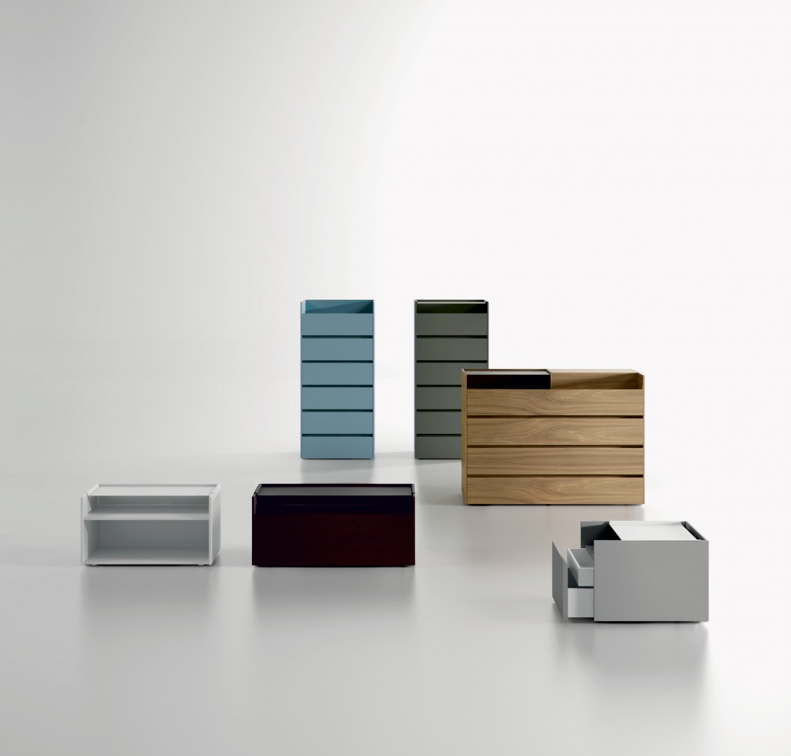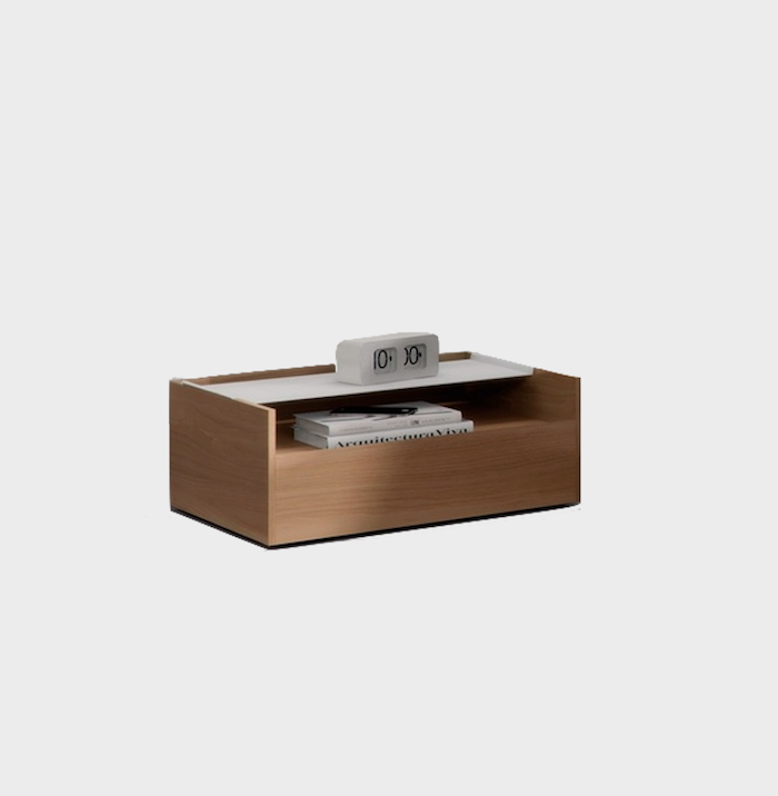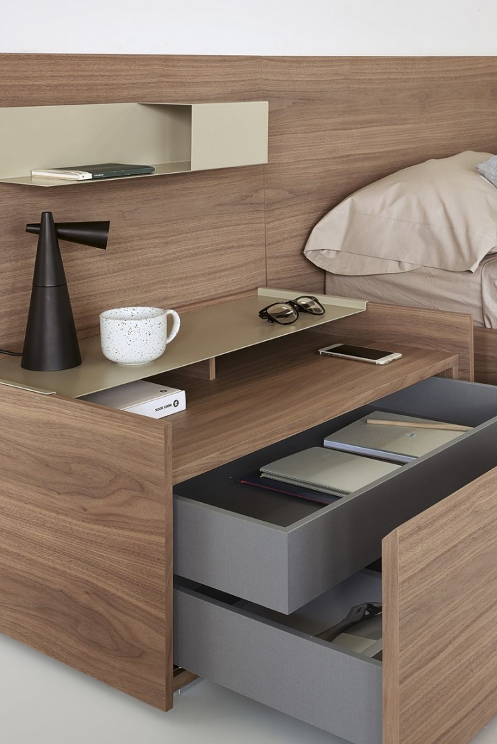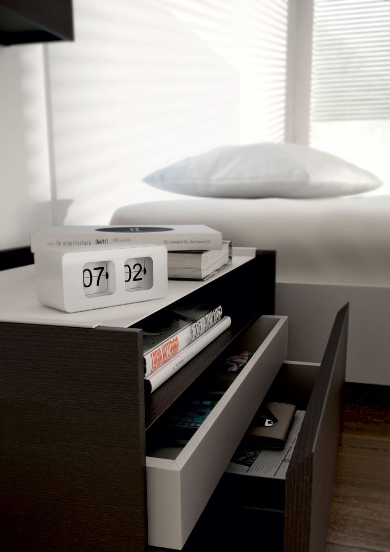 Bedside tables, with or without drawers, of three different widths and an extractable upper shelf of epoxy coated metal sheet. This shelf is shaped so that it fits neatly over the sides of the structure. It can, therefore, be easily moved when needed for use as a tray. The Índigo series is rounded off with a single-size chiffonier and commode.