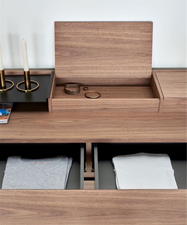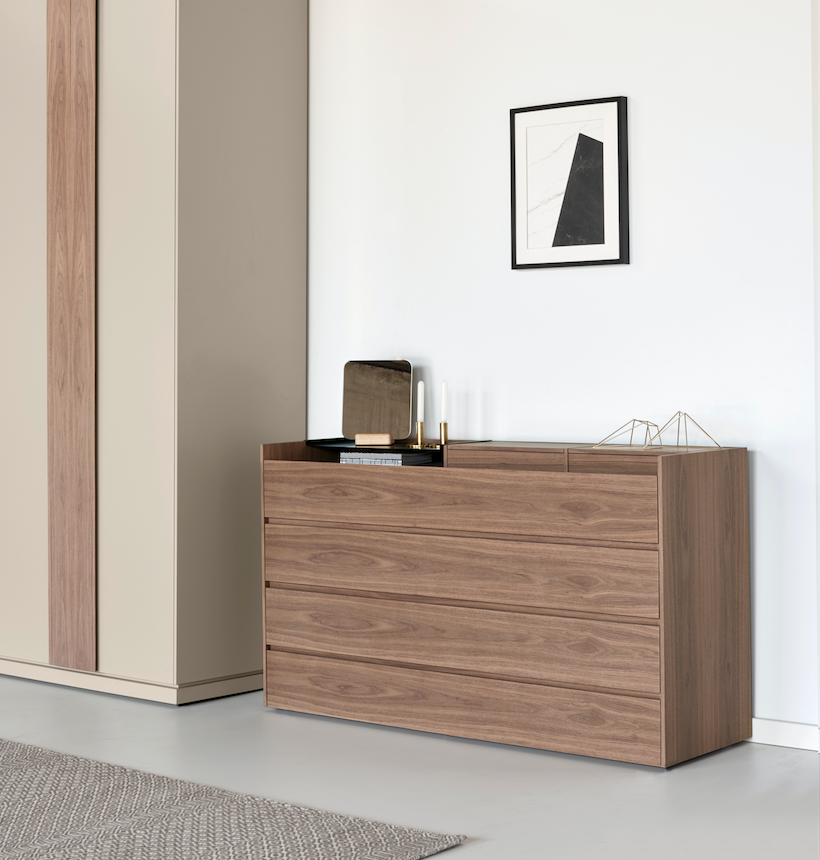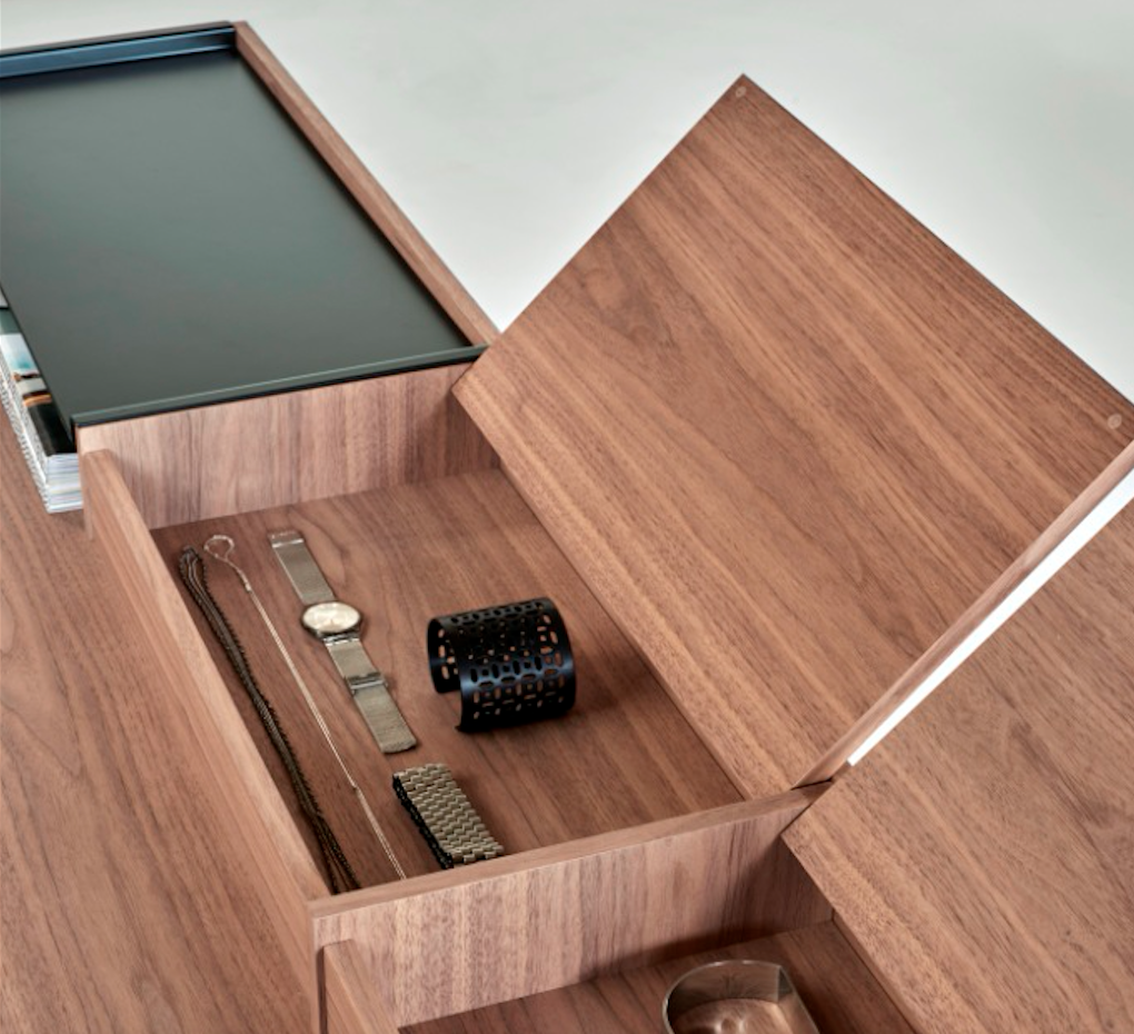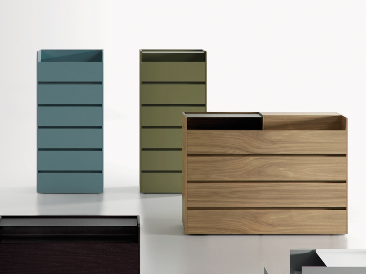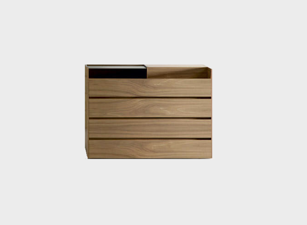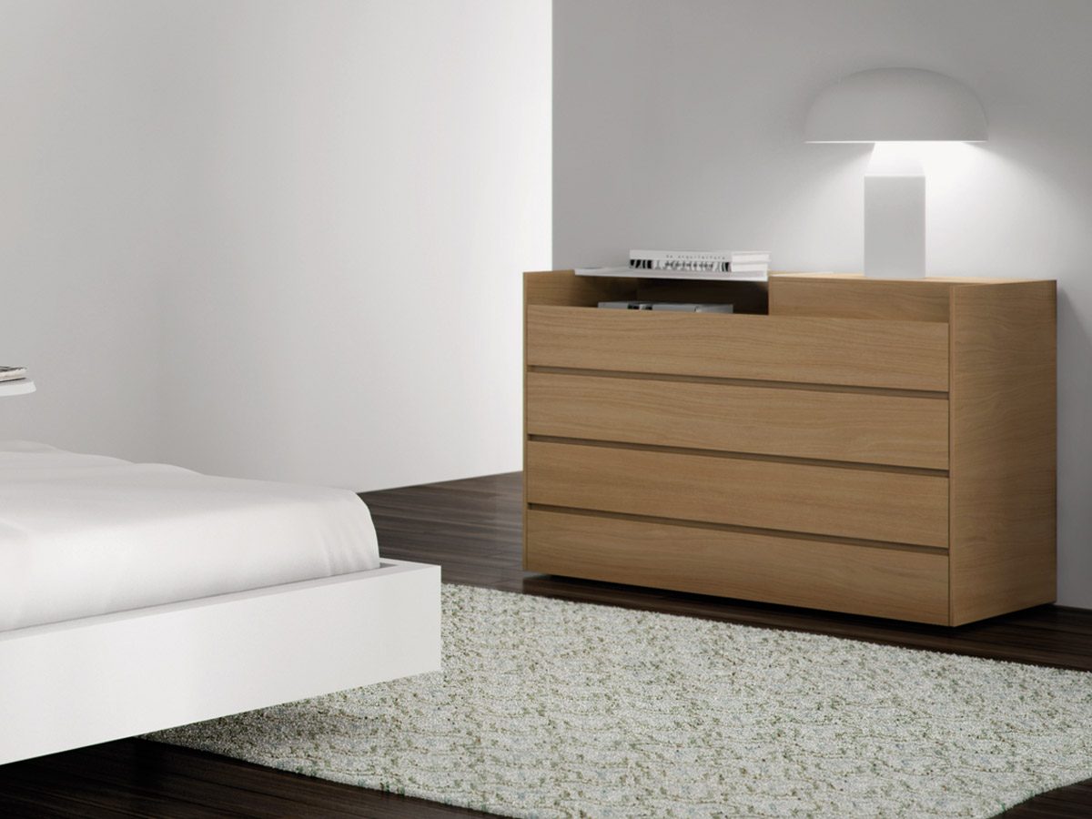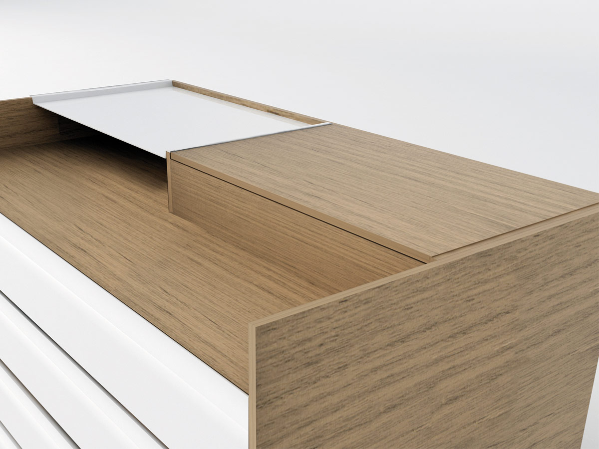 A chest of drawers in two versions, to complement the bedside tables, with the removable metal tray shelf.