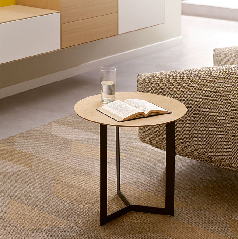 The metal legs are finished in graphite. The tops, which feature a bevelled edge, can be finished in walnut, oak or different coloured lacquers.