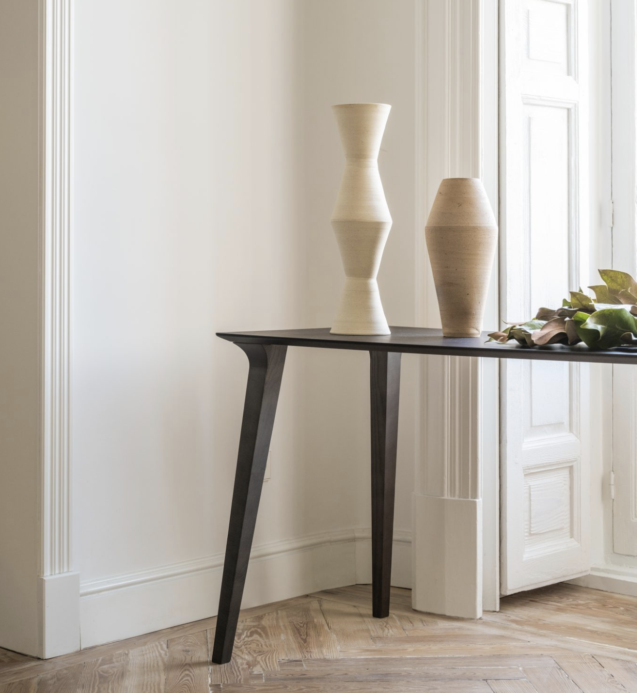 The Lau wooden desk is a delicate design by Jesus Gasca. The singularity of this desk design comes from its details: a slight inclination of the legs with a smooth & curved connection to the table top. Hence making this desk unique where legs and top flow in a fluid way. Lau desk is available in four stained timber colours