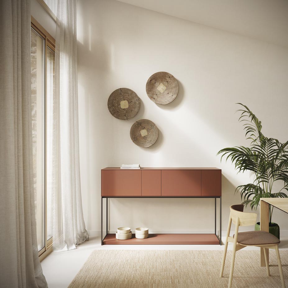 A thin half-centimeter frame envelopes the entire piece, outlining the push-to-open doors. The Lauki collection is made up of multiple boxes that can be arranged on the floor, piled on top of one another or hung from the wall. Moreover, these boxes are available in a wide range of different measurements, finishes and functions (drawers, doors, open modules, etc.), thus enabling you to create an endless variety of configurations to suit any room.
