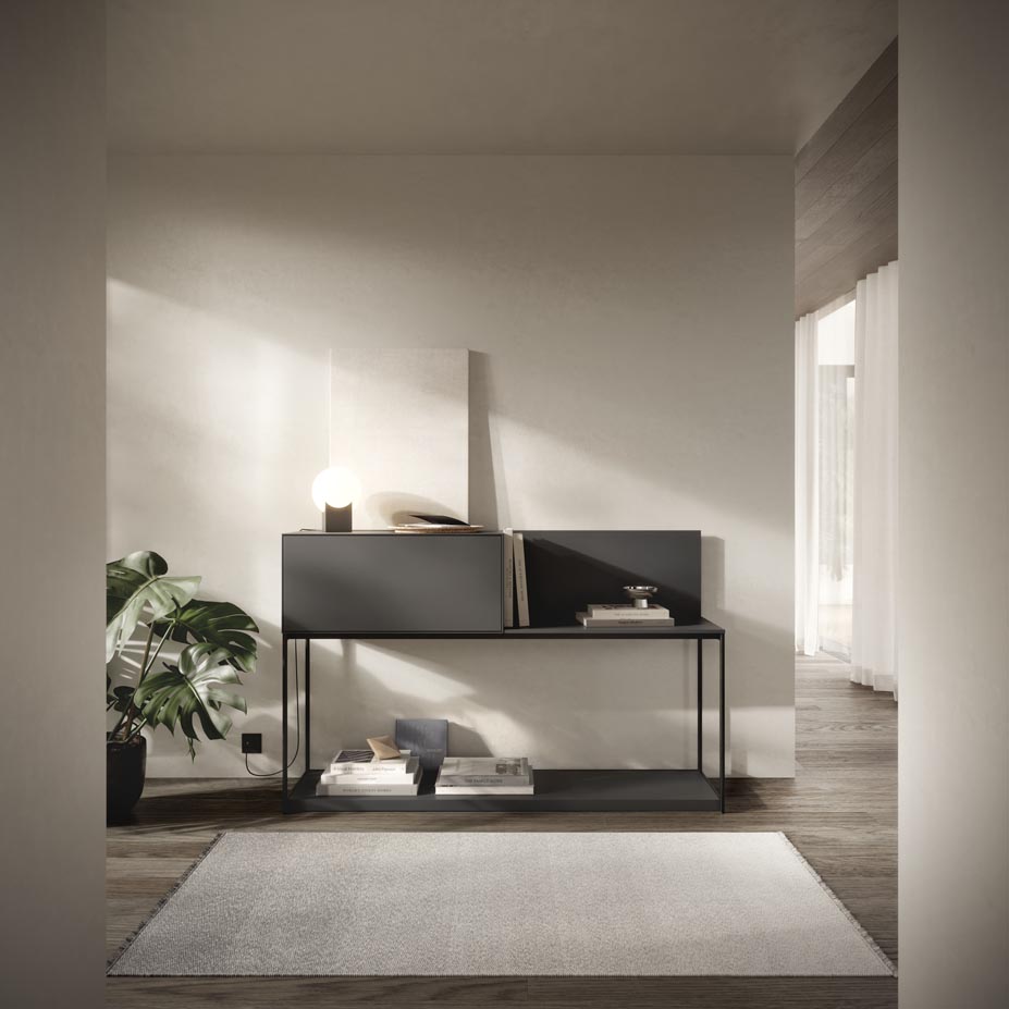 A thin half-centimeter frame envelopes the entire piece, outlining the push-to-open doors. The Lauki collection is made up of multiple boxes that can be arranged on the floor, piled on top of one another or hung from the wall. Moreover, these boxes are available in a wide range of different measurements, finishes and functions (drawers, doors, open modules, etc.), thus enabling you to create an endless variety of configurations to suit any room.
