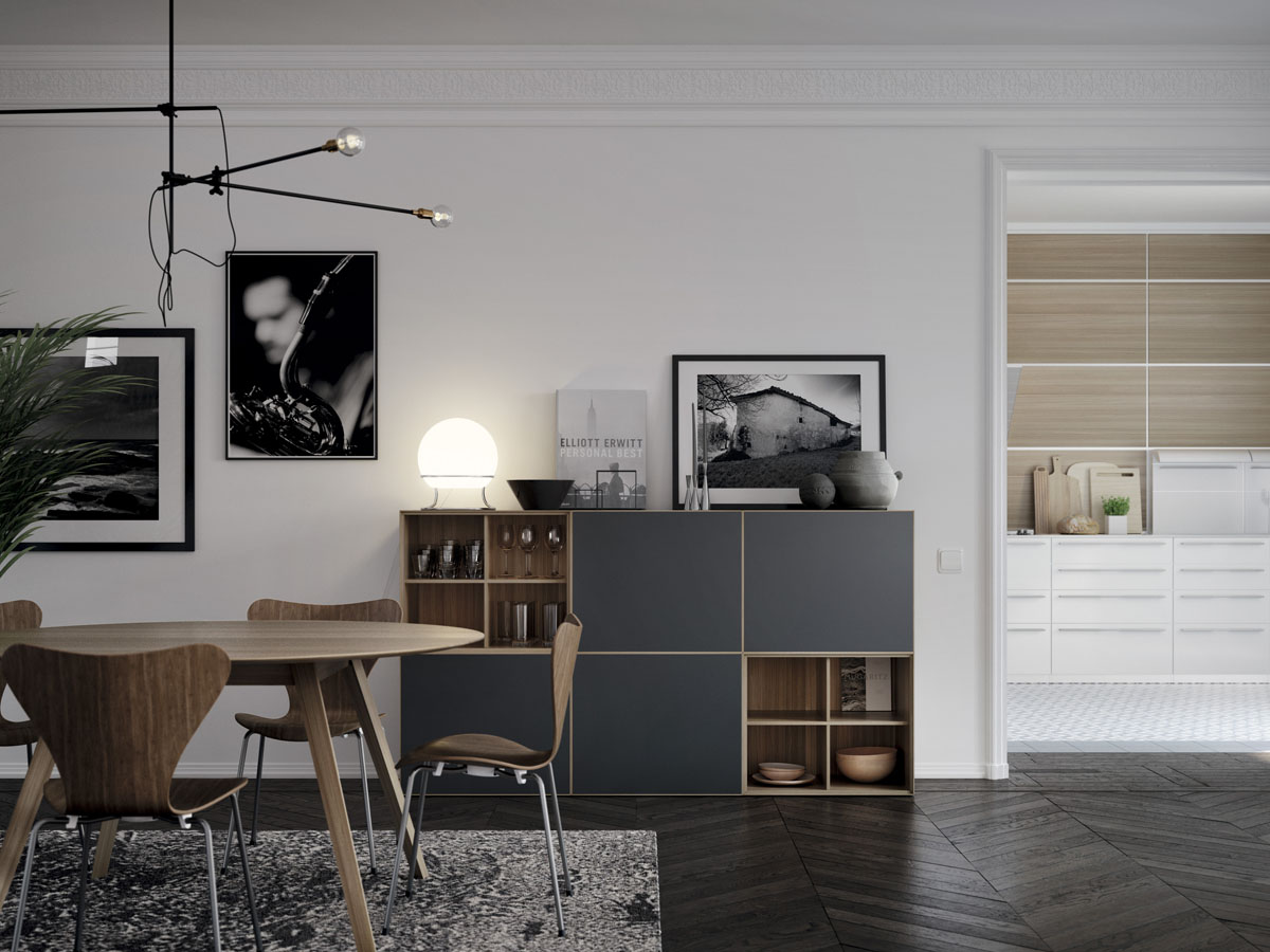 A thin half-centimeter frame envelopes the entire piece, outlining the push-to-open drawers. The Lauki collection is made up of multiple boxes that can be arranged on the floor, piled on top of one another or hung from the wall. Moreover, these boxes are available in a wide range of different measurements, finishes and functions (drawers, doors, open modules, etc.), thus enabling you to create an endless variety of configurations to suit any room.