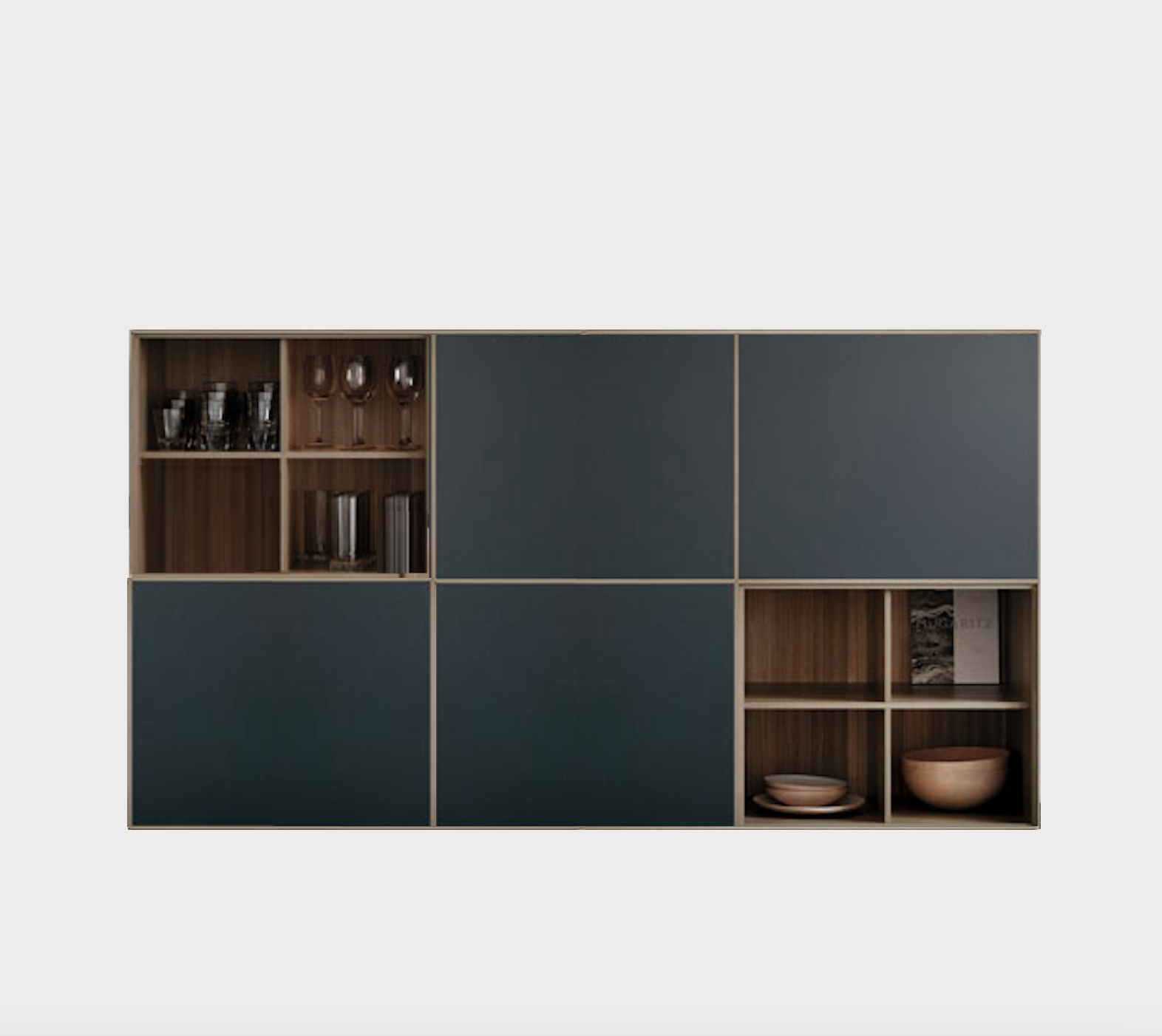Sideboard with timber frames and lacquer doors and inner shelves. Includes four modules with doors and inner shelves and two open units with shelves. For more custom options, please contact us.