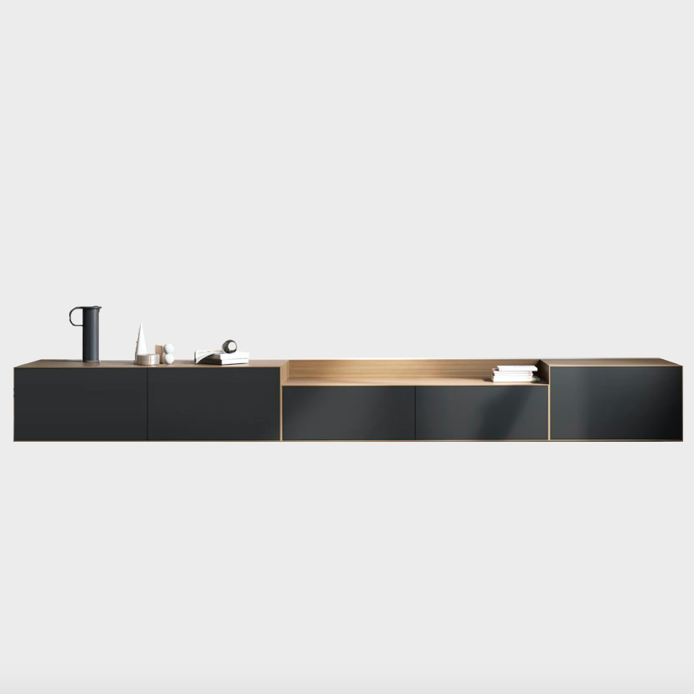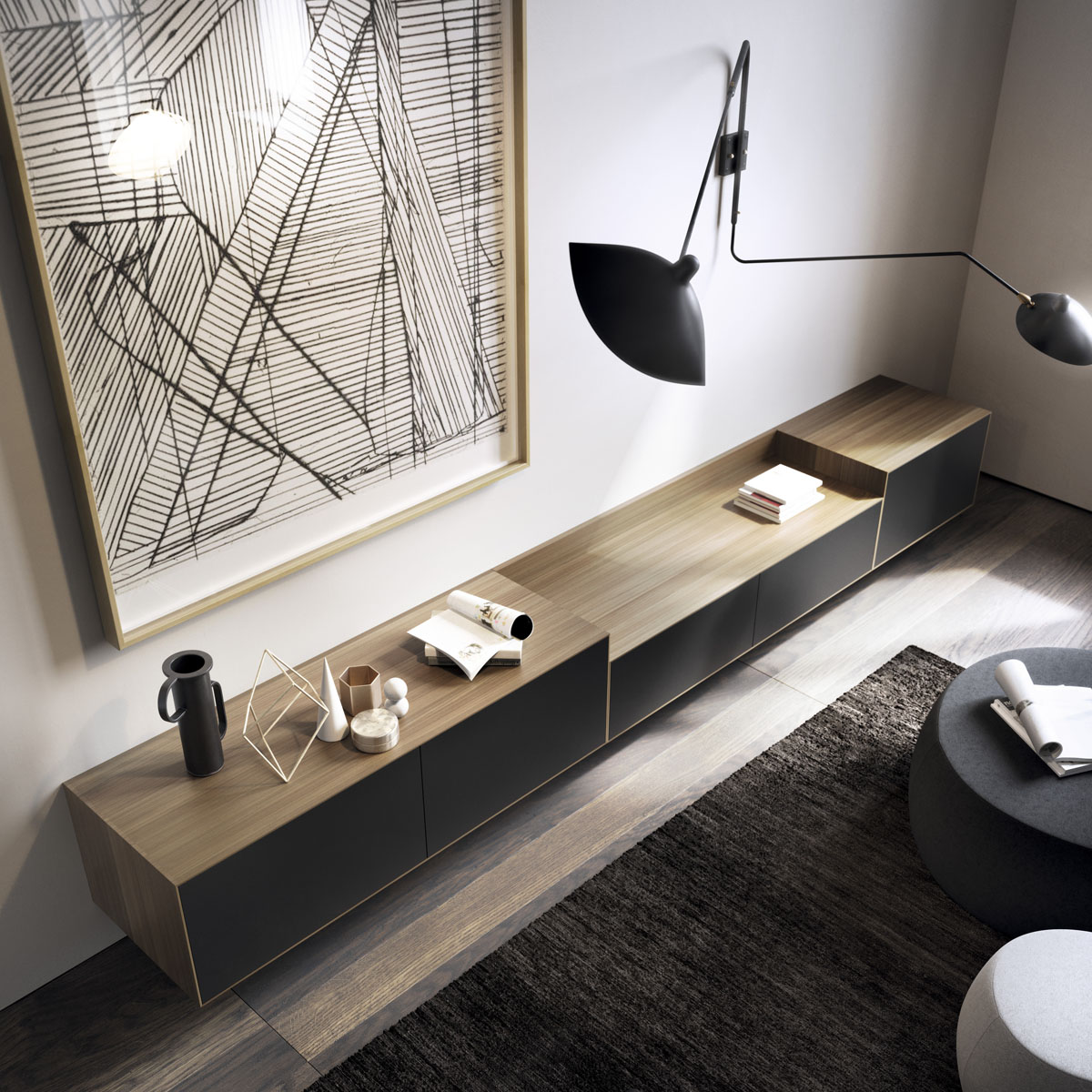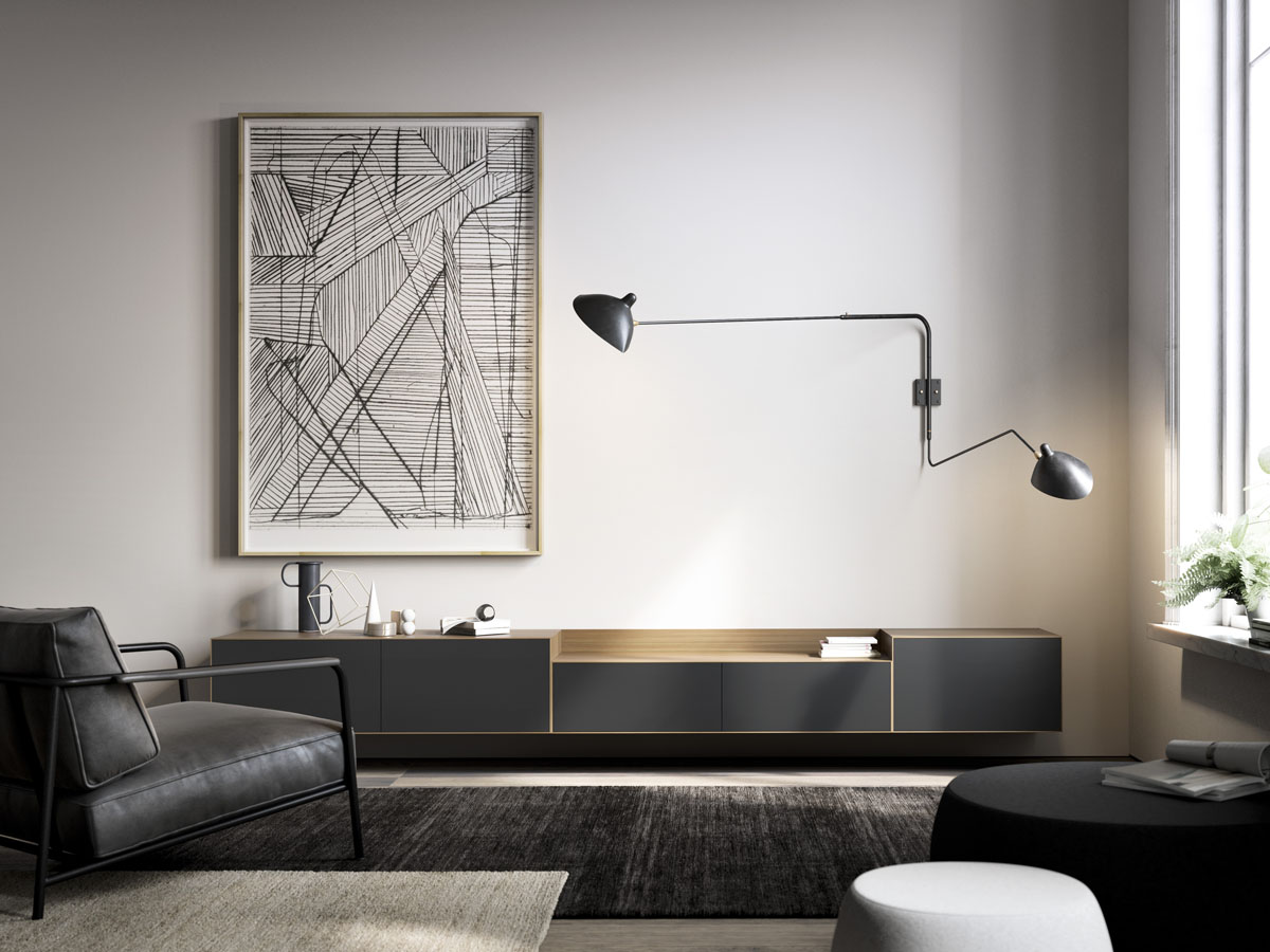 A thin half-centimeter frame envelopes the entire piece, outlining the push-to-open drawers. The Lauki collection is made up of multiple boxes that can be arranged on the floor, piled on top of one another or hung from the wall. Moreover, these boxes are available in a wide range of different measurements, finishes and functions (drawers, doors, open modules, etc.), thus enabling you to create an endless variety of configurations to suit any room.