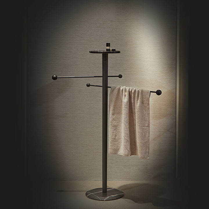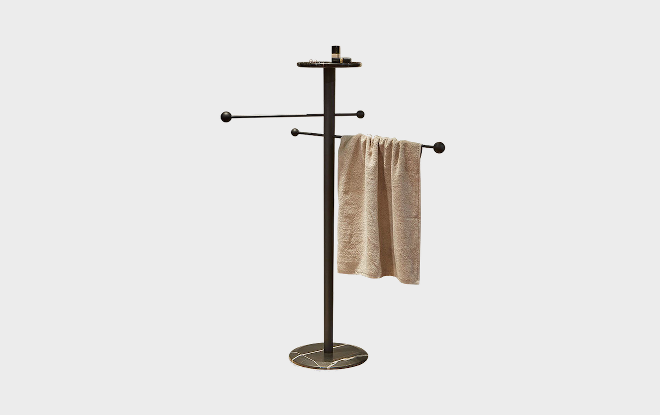 This Towel stand has two arms made in metal and a marble top shelf where you can leave all your last belongings before going to the bath.