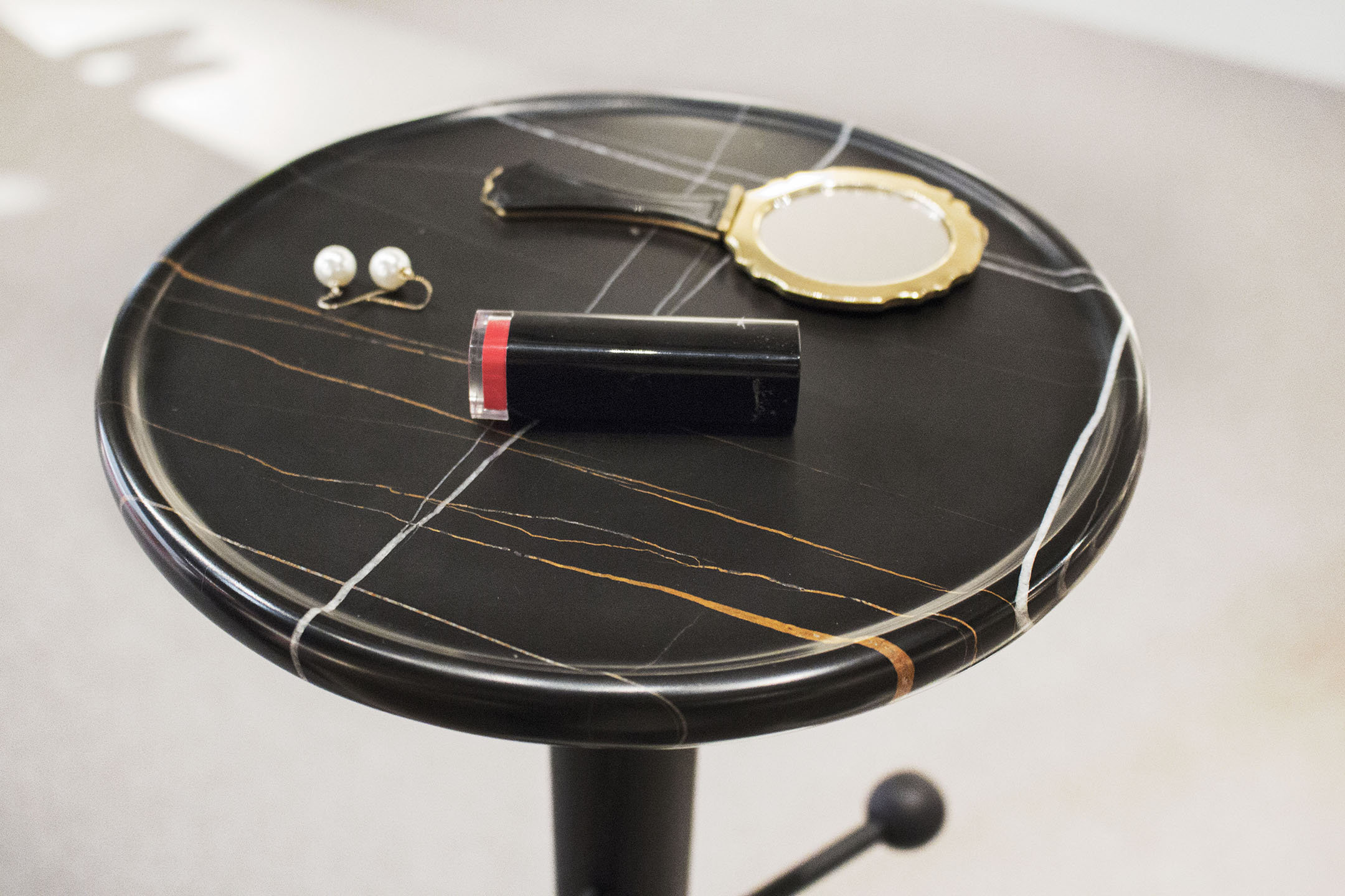 Option 2 with base in Sahara Noir marble, structure in stained black ash wood and rods in brass painted in black.
