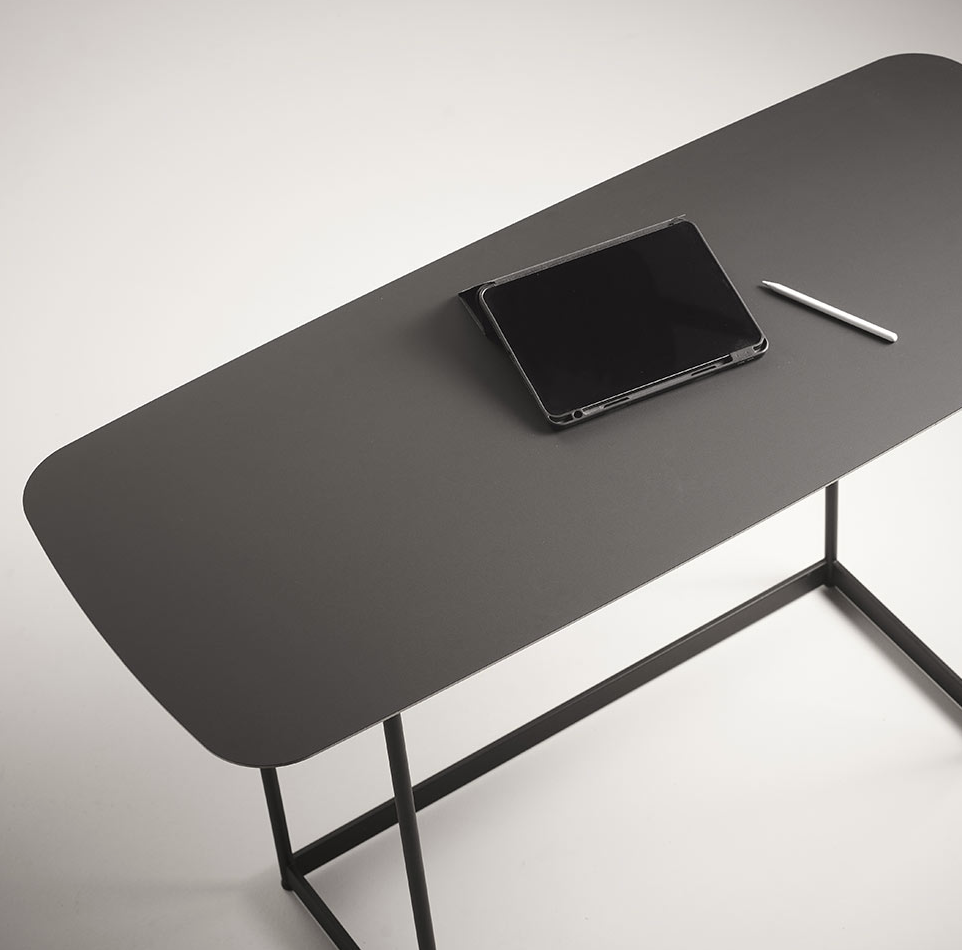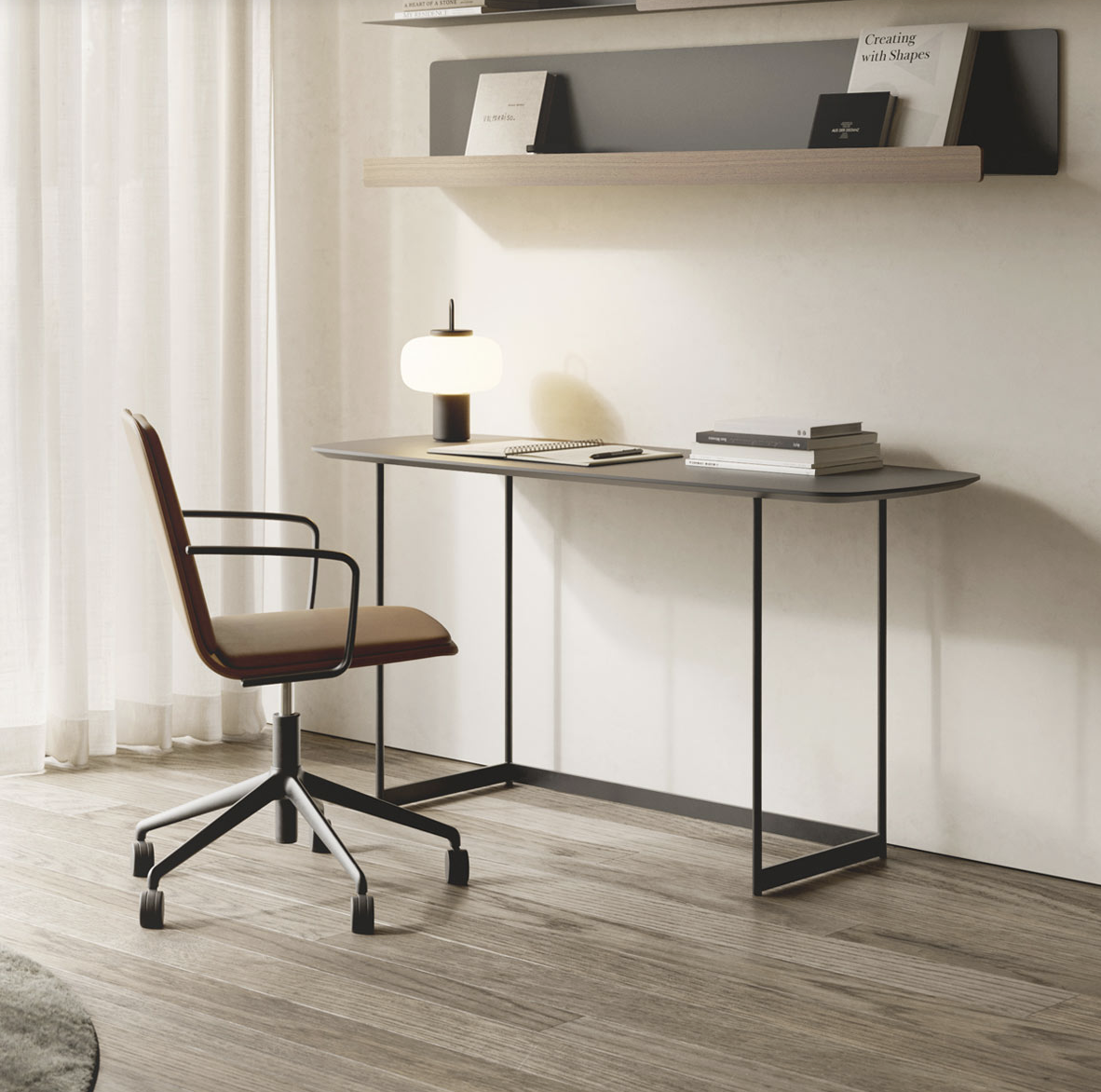 This light, elegant desk with rounded forms can be placed in any space. The metal legs can be personalised with any of Treku’s lacquers, while the tabletop can be finished in our woods or Fenix finishes.