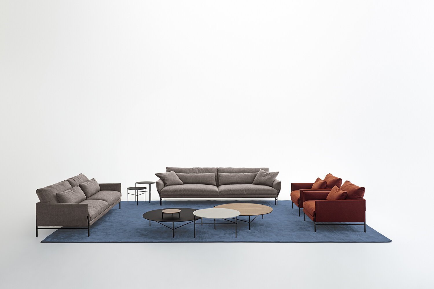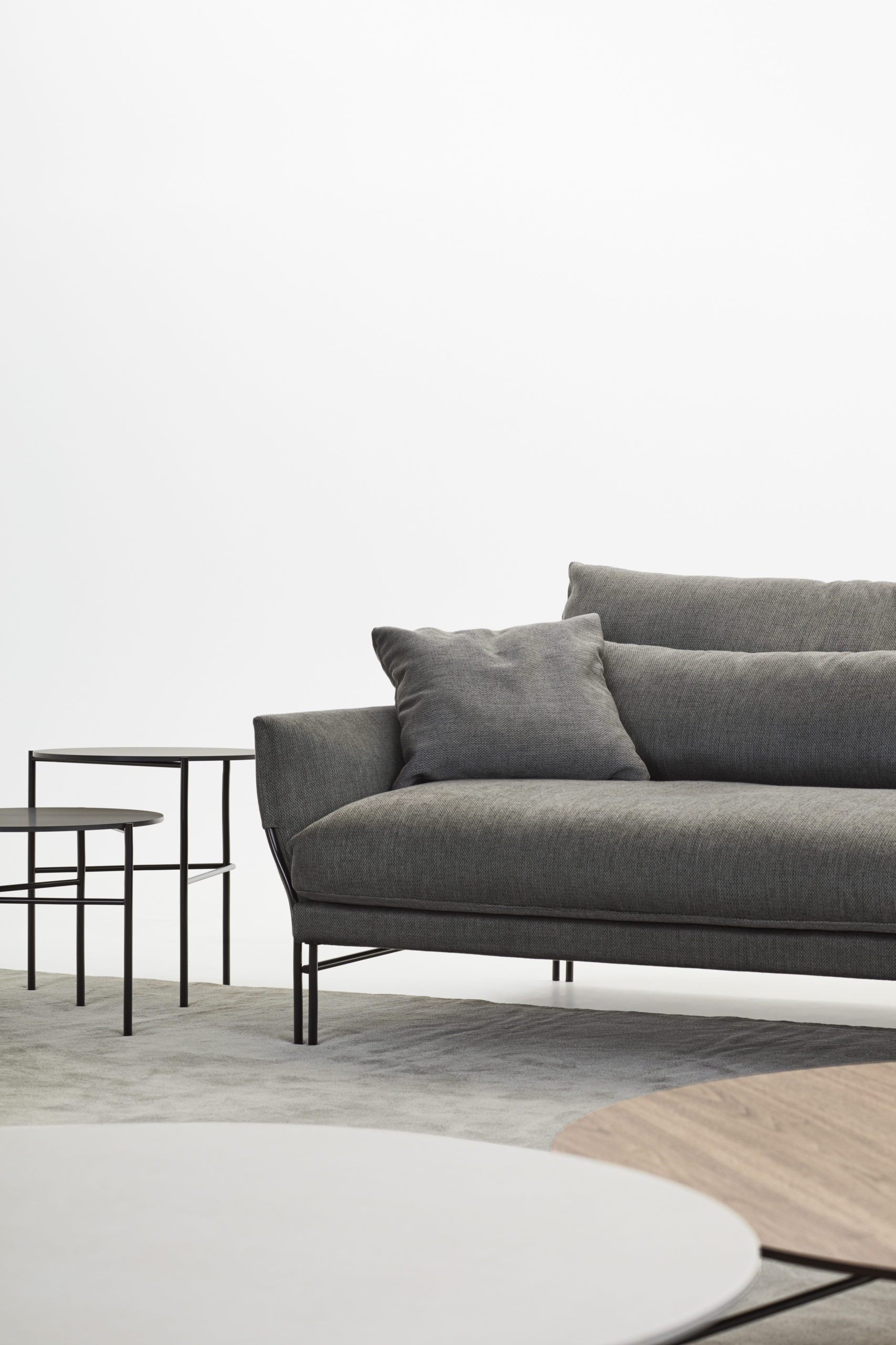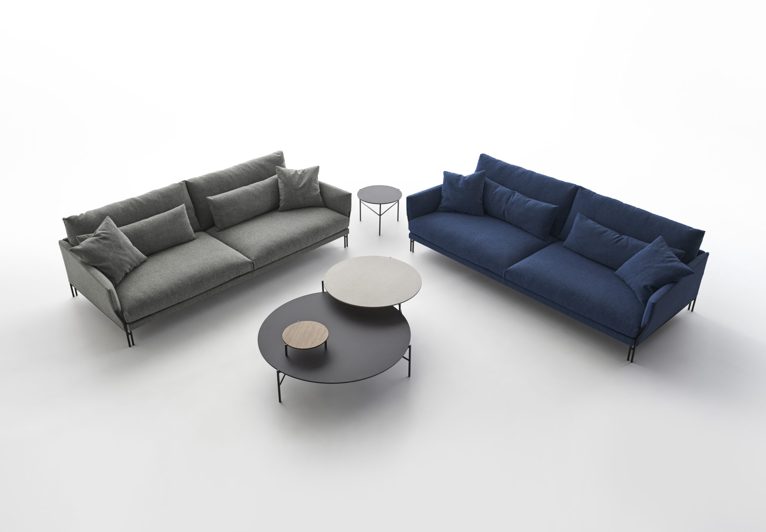This very essence is also conveyed in the circular surfaced, slender leg side tables that go with this sofa, available in different sizes, which can be combined in different heights to create a modern, contemporary and very appealing setup.